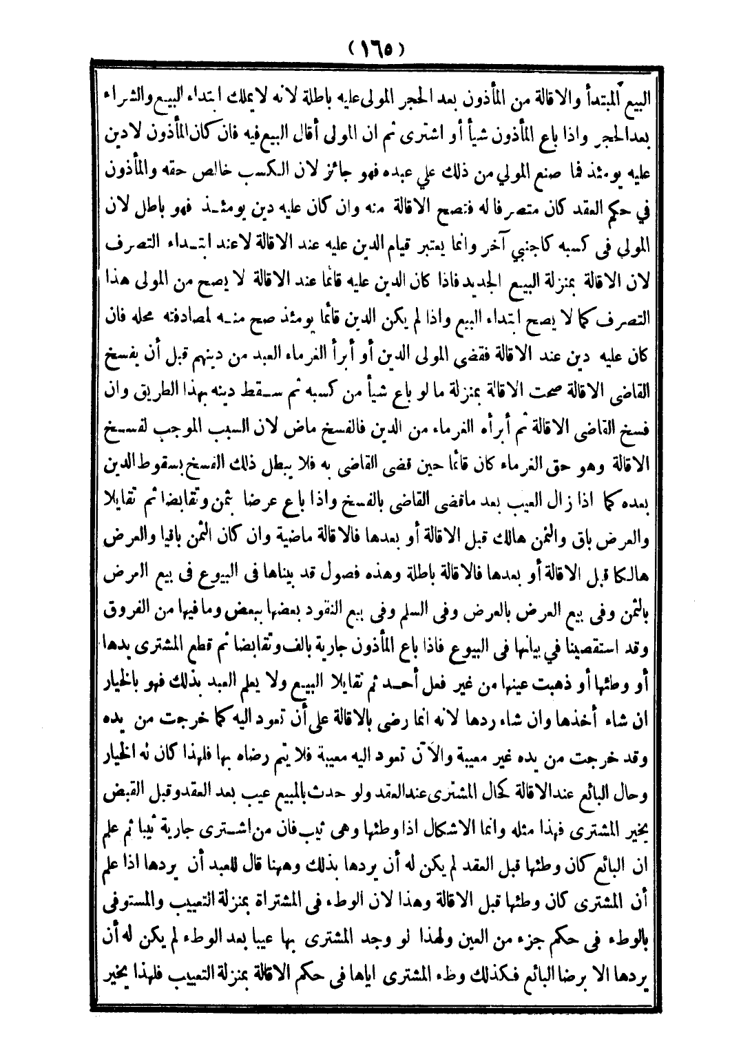 الْبَيْعِ الْمُبْتَدَأِ وَالْإِقَالَةُ مِنْ الْمَأْذُونِ بَعْدَ حَجْرِ الْمَوْلَى عَلَيْهِ بَاطِلَةٌ؛ لِأَنَّهُ لَا يَمْلِكُ ابْتِدَاءَ الْبَيْعِ وَالشِّرَاءِ بَعْدَ الْحَجْرِ.