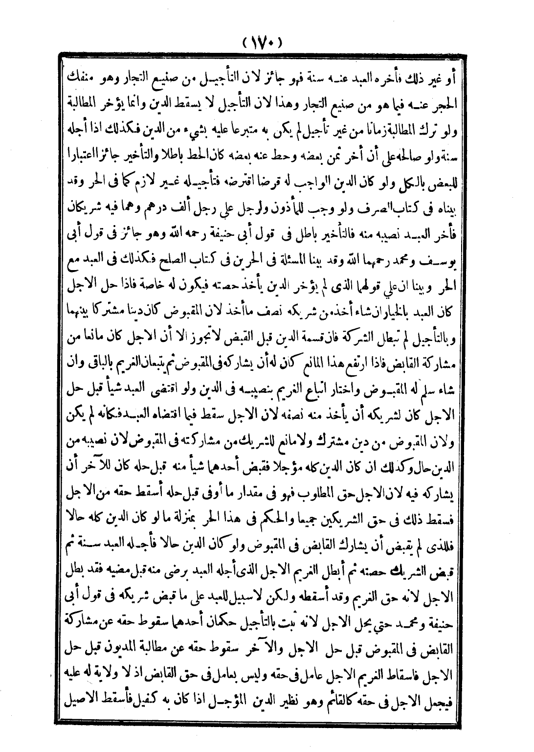 وَلَوْ كَانَ الدَّيْنُ حَالًّا فَأَجَّلَهُ الْعَبْدُ سَنَةً، ثُمَّ قَبَضَ الشَّرِيكُ حِصَّتَهُ، ثُمَّ أَبْطَلَ الْغَرِيمُ الْأَجَلَ الَّذِي أَجَّلَهُ الْعَبْدَ بِرِضًى مِنْهُ قَبْلَ مُضِيِّهِ فَقَدْ بَطَلَ الْأَجَلُ؛ لِأَنَّهُ حَقُّ الْغَرِيمِ وَقَدْ أَسْقَطَهُ وَلَكِنْ لَا سَبِيلَ لِلْعَبْدِ عَلَى مَا قَبَضَ شَرِيكُهُ فِي قَوْلِ أَبِي حَنِيفَةَ وَمُحَمَّدٍ حَتَّى يَحِلَّ الْأَجَلُ؛ لِأَنَّهُ ثَبَتَ بِالتَّأْجِيلِ - حُكْمَانِ أَحَدُهُمَا سُقُوطُ حَقِّهِ عَنْ مُشَارَكَةِ الْقَابِضِ فِي الْمَقْبُوضِ قَبْلَ حَلِّ الْأَجَلِ وَالْآخَرُ سُقُوطُ حَقِّهِ عَنْ مُطَالَبَةِ الْمَدْيُونِ قَبْلَ حَلِّ الْأَجَلِ فَإِسْقَاطُ الْغَرِيمِ الْأَجَلَ عَامِلٌ فِي حَقِّهِ وَلَيْسَ بِعَامِلٍ فِي حَقِّ الْقَابِضِ إذْ لَا وِلَايَةَ لَهُ عَلَيْهِ فَيُجْعَلُ الْأَجَلُ فِي حَقِّهِ كَالْقَائِمِ، وَهُوَ نَظِيرُ الدَّيْنِ الْمُؤَجَّلِ إذَا كَانَ بِهِ كَفِيلٌ فَأَسْقَطَ الْأَصِيلُ