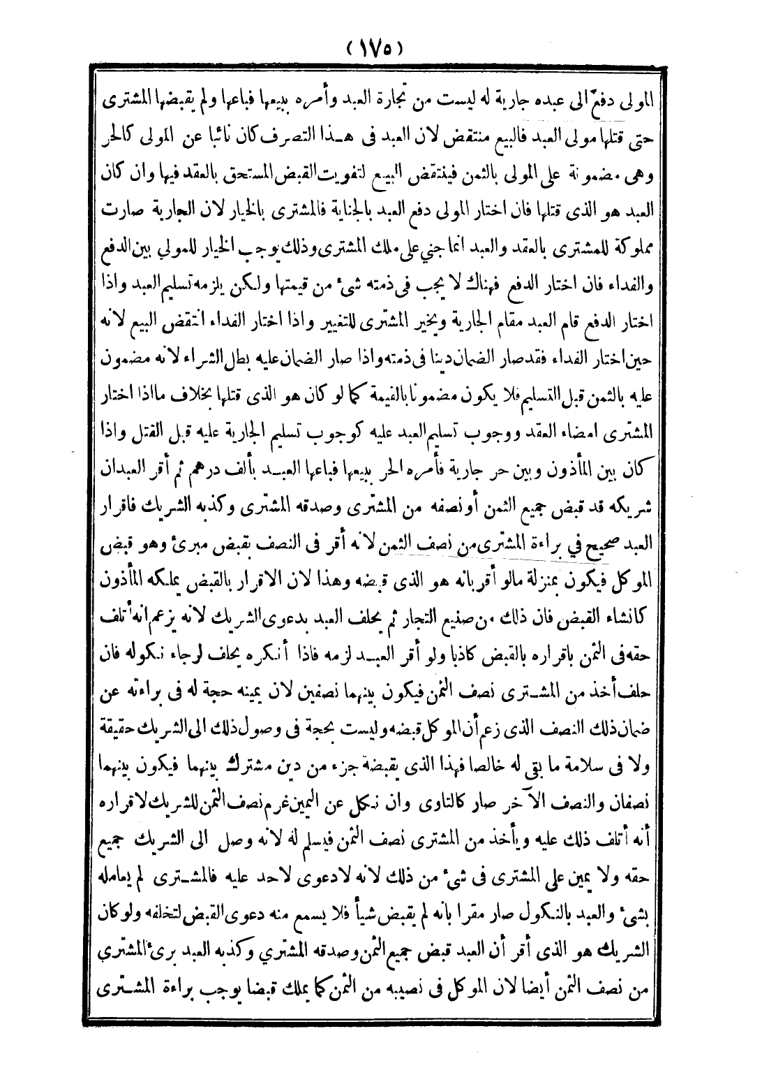 وَإِذَا كَانَ بَيْنَ الْمَأْذُونِ وَبَيْنَ حُرٍّ جَارِيَةٌ فَأَمَرَهُ الْحُرُّ بِبَيْعِهَا فَبَاعَهَا الْعَبْدُ بِأَلْفِ دِرْهَمٍ، ثُمَّ أَقَرَّ الْعَبْدُ أَنَّ شَرِيكَهُ قَدْ قَبَضَ جَمِيعَ الثَّمَنِ أَوْ نِصْفَهُ مِنْ الْمُشْتَرِي وَصَدَّقَهُ الْمُشْتَرِي وَكَذَّبَهُ الشَّرِيكُ فَإِقْرَارُ الْعَبْدِ صَحِيحٌ فِي بَرَاءَةِ الْمُشْتَرِي مِنْ نِصْفِ الثَّمَنِ؛ لِأَنَّهُ أَقَرَّ فِي النِّصْفِ بِقَبْضٍ مُبْرِئٍ، وَهُوَ قَبْضُ الْمُوَكِّلِ فَيَكُونُ بِمَنْزِلَةِ مَا لَوْ أَقَرَّ بِأَنَّهُ هُوَ الَّذِي قَبَضَهُ وَهَذَا؛ لِأَنَّ الْإِقْرَارَ بِالْقَبْضِ يَمْلِكُهُ الْمَأْذُونُ كَإِنْشَاءِ الْقَبْضِ فَإِنَّ ذَلِكَ مِنْ صَنِيعِ التُّجَّارِ، ثُمَّ يَحْلِفُ الْعَبْدُ بِدَعْوَى الشَّرِيكِ؛ لِأَنَّهُ يَزْعُمُ أَنَّهُ أَتْلَفَ حَقَّهُ فِي الثَّمَنِ بِإِقْرَارِهِ بِالْقَبْضِ كَاذِبًا، وَلَوْ أَقَرَّ الْعَبْدُ لَزِمَهُ فَإِذَا أَنْكَرَهُ يَحْلِفُ لِرَجَاءِ نُكُولِهِ فَإِنْ حَلَفَ أَخَذَ مِنْ الْمُشْتَرِي نِصْفَ الثَّمَنِ فَيَكُونُ بَيْنَهُمَا نِصْفَيْنِ؛ لِأَنَّ يَمِينَهُ حُجَّةٌ لَهُ فِي بَرَاءَتِهِ عَنْ ضَمَانِ ذَلِكَ النِّصْفِ الَّذِي زَعَمَ أَنَّ الْمُوَكِّلَ قَبَضَهُ وَلَيْسَتْ بِحُجَّةٍ فِي وُصُولِ ذَلِكَ إلَى الشَّرِيكِ حَقِيقَةً وَلَا فِي سَلَامَةِ مَا بَقِيَ لَهُ خَالِصًا فَهَذَا الَّذِي يَقْبِضُهُ جُزْءٌ مِنْ دَيْنٍ مُشْتَرَكٍ بَيْنَهُمَا فَيَكُونُ بَيْنَهُمَا نِصْفَانِ وَالنِّصْفُ الْآخَرُ صَارَ كَالتَّاوِي وَإِنْ نَكَلَ عَنْ الْيَمِينِ غَرِمَ نِصْفَ الثَّمَنِ لِلشَّرِيكِ لِإِقْرَارِهِ أَنَّهُ أَتْلَفَ ذَلِكَ عَلَيْهِ وَيَأْخُذُ مِنْ الْمُشْتَرِي نِصْفَ الثَّمَنِ فَيَسْلَمُ لَهُ؛ لِأَنَّهُ وَصَلَ إلَى الشَّرِيكِ جَمِيعُ حَقِّهِ وَلَا يَمِينَ عَلَى الْمُشْتَرِي فِي شَيْءٍ مِنْ ذَلِكَ؛ لِأَنَّهُ لَا دَعْوَى لِأَحَدٍ عَلَيْهِ فَالْمُشْتَرِي لَمْ يُعَامِلْهُ بِشَيْءٍ وَالْعَبْدُ بِالنُّكُولِ صَارَ مُقِرًّا بِأَنَّهُ لَمْ يَقْبِضْ شَيْئًا فَلَا يُسْمَعُ مِنْهُ دَعْوَى الْقَبْضِ لِتَخَلُّفِهِ، وَلَوْ كَانَ الشَّرِيكُ هُوَ الَّذِي أَقَرَّ أَنَّ الْعَبْدَ قَبَضَ جَمِيعَ الثَّمَنِ وَصَدَّقَهُ الْمُشْتَرِي وَكَذَّبَهُ الْعَبْدُ بَرِئَ الْمُشْتَرِي مِنْ نِصْفِ الثَّمَنِ أَيْضًا؛ لِأَنَّ الْمُوَكِّلَ فِي نَصِيبِهِ مِنْ الثَّمَنِ كَمَا يَمْلِكُ قَبْضًا يُوجِبُ بَرَاءَةَ الْمُشْتَرِي