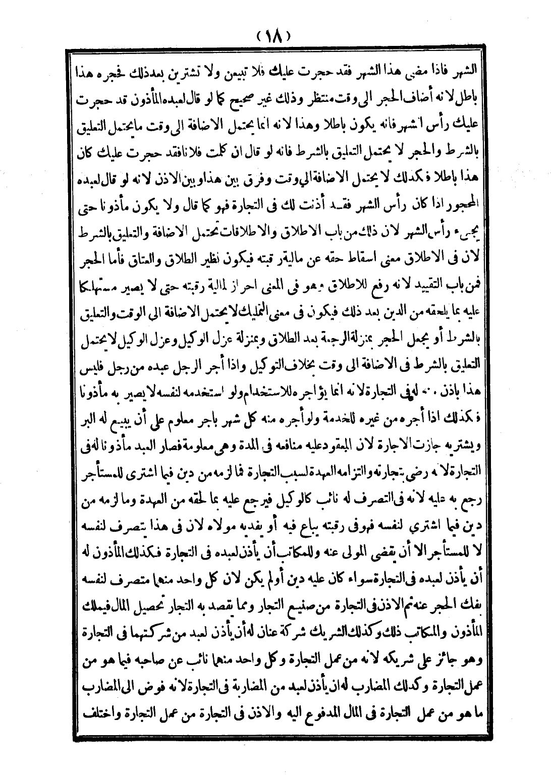 الشَّهْرِ فَإِذَا مَضَى هَذَا الشَّهْرُ فَقَدْ حَجَرْتُ عَلَيْكَ فَلَا تَبِيعَنَّ وَلَا تَشْتَرِيَنَّ بَعْدَ ذَلِكَ فَحَجْرُهُ هَذَا بَاطِلٌ؛ لِأَنَّهُ أَضَافَ الْحَجْرَ إلَى وَقْتٍ مُنْتَظَرٍ وَذَلِكَ غَيْرُ صَحِيحٍ كَمَا لَوْ قَالَ لِعَبْدِهِ الْمَأْذُونِ قَدْ حَجَرْتُ عَلَيْكَ رَأْسَ الشَّهْرِ فَإِنَّهُ يَكُونُ بَاطِلًا وَهَذَا؛ لِأَنَّهُ إنَّمَا يَحْتَمِلُ الْإِضَافَةَ إلَى وَقْتِ مَا يَحْتَمِلُ التَّعْلِيقَ بِالشَّرْطِ، وَالْحَجْرُ لَا يَحْتَمِلُ التَّعْلِيقَ بِالشَّرْطِ فَإِنَّهُ لَوْ قَالَ إنْ كَلَّمْتُ فُلَانًا فَقَدْ حَجَرْتُ عَلَيْكَ كَانَ هَذَا بَاطِلًا فَكَذَلِكَ لَا يَحْتَمِلُ الْإِضَافَةَ إلَى وَقْتٍ وَفَرَّقَ بَيْنَ هَذَا وَبَيْنَ الْإِذْنِ؛ لِأَنَّهُ لَوْ قَالَ لِعَبْدِهِ الْمَحْجُورِ: إذَا كَانَ رَأْسُ الشَّهْرِ فَقَدْ أَذِنْتُ لَكَ فِي التِّجَارَةِ فَهُوَ كَمَا قَالَ وَلَا يَكُونُ مَأْذُونًا حَتَّى يَجِيءَ رَأْسُ الشَّهْرِ؛ لِأَنَّ ذَلِكَ مِنْ بَابِ الْإِطْلَاقِ، وَالْإِطْلَاقَاتُ تَحْتَمِلُ الْإِضَافَةَ، وَالتَّعْلِيقَ بِالشَّرْطِ؛ لِأَنَّ فِي الْإِطْلَاقِ مَعْنَى إسْقَاطِ حَقِّهِ عَنْ مَالِيَّةِ رَقَبَتِهِ فَيَكُونُ نَظِيرَ الطَّلَاقِ، وَالْعَتَاقِ فَأَمَّا الْحَجْرُ فَمِنْ بَابِ التَّقْيِيدِ؛ لِأَنَّهُ رَفْعٌ لِلْإِطْلَاقِ وَهُوَ فِي الْمَعْنَى إحْرَازٌ لِمَالِيَّةِ رَقَبَتِهِ حَتَّى لَا يَصِيرَ مُسْتَهْلَكًا عَلَيْهِ بِمَا يَلْحَقُهُ مِنْ الدَّيْنِ بَعْدَ ذَلِكَ فَيَكُونُ فِي مَعْنَى التَّمْلِيكِ لَا يَحْتَمِلُ الْإِضَافَةَ إلَى الْوَقْتِ، وَالتَّعْلِيقِ بِالشَّرْطِ أَوْ يُجْعَلُ الْحَجْرُ بِمَنْزِلَةِ الرَّجْعَةِ بَعْدَ الطَّلَاقِ وَبِمَنْزِلَةِ عَزْلِ الْوَكِيلِ وَعَزْلُ الْوَكِيلِ لَا يَحْتَمِلُ التَّعْلِيقَ بِالشَّرْطِ فِي الْإِضَافَةِ إلَى وَقْتٍ بِخِلَافِ التَّوْكِيلِ.