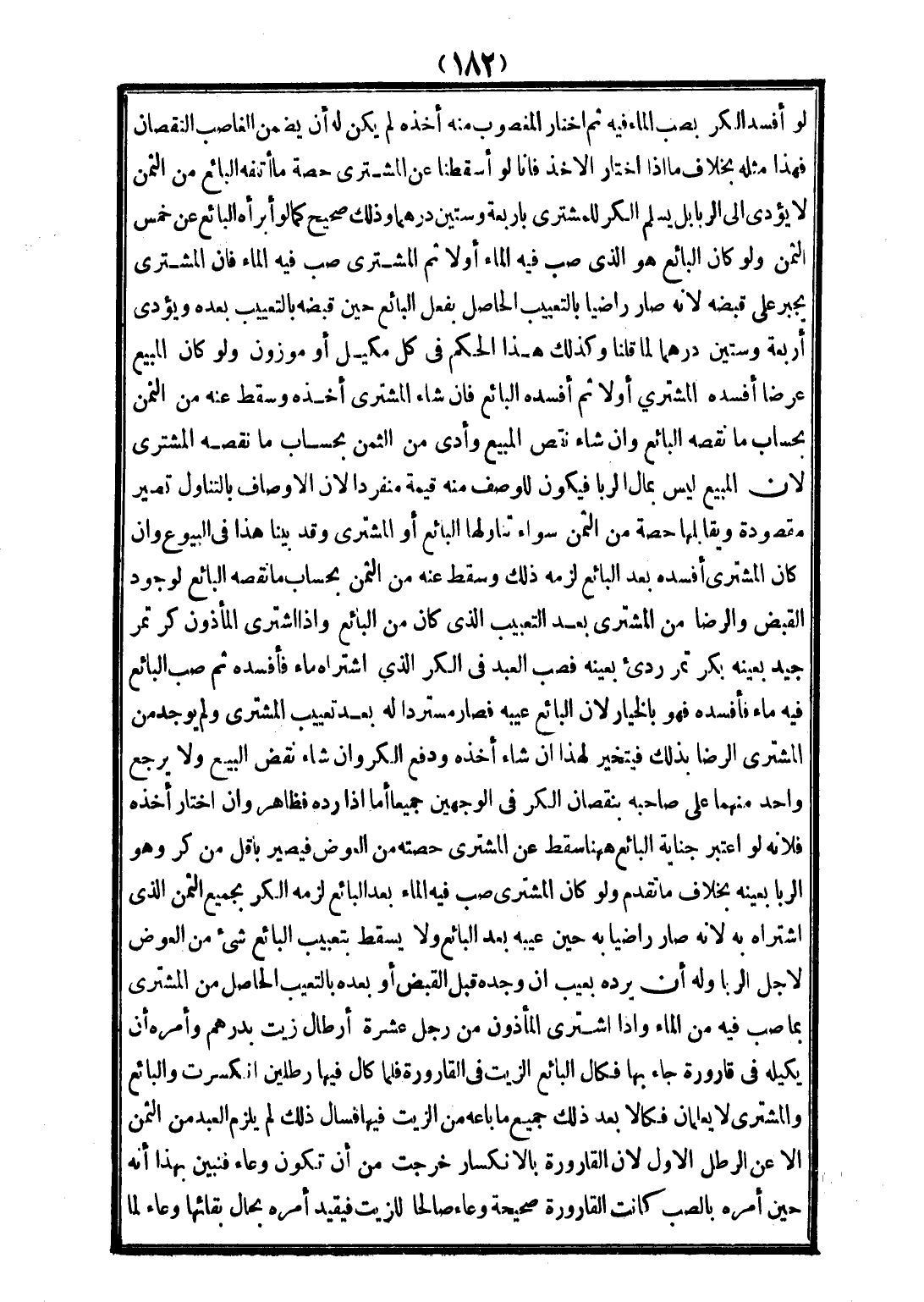 لَوْ أَفْسَدَ الْكُرَّ بِصَبِّ الْمَاءِ فِيهِ، ثُمَّ اخْتَارَ الْمَغْصُوبُ مِنْهُ أَخْذَهُ لَمْ يَكُنْ لَهُ أَنْ يُضَمِّنَ الْغَاصِبِ النُّقْصَانَ فَهَذَا مِثْلُهُ بِخِلَافِ مَا إذَا اخْتَارَ الْأَخْذَ فَإِنَّا لَوْ أَسْقَطْنَا عَنْ الْمُشْتَرِي حِصَّةَ مَا أَتْلَفَهُ الْبَائِعُ مِنْ الثَّمَنِ لَا يُؤَدِّي إلَى الرِّبَا بَلْ يَسْلَمُ الْكُرُّ لِلْمُشْتَرِي بِأَرْبَعَةٍ وَسِتِّينَ دِرْهَمًا، وَذَلِكَ صَحِيحٌ كَمَا لَوْ أَبْرَأَهُ الْبَائِعُ عَنْ خُمُسِ الثَّمَنِ، وَلَوْ كَانَ الْبَائِعُ هُوَ الَّذِي صَبَّ فِيهِ الْمَاءَ أَوَّلًا، ثُمَّ الْمُشْتَرِي صَبَّ فِيهِ الْمَاءَ فَإِنَّ الْمُشْتَرِيَ يُجْبَرُ عَلَى قَبْضِهِ؛ لِأَنَّهُ صَارَ رَاضِيًا بِالتَّعْيِيبِ الْحَاصِلِ بِفِعْلِ الْبَائِعِ حِينَ قَبَضَهُ بِالتَّعْيِيبِ بَعْدَهُ وَيُؤَدِّي أَرْبَعَةً وَسِتِّينَ دِرْهَمًا؛ لِمَا قُلْنَا، وَكَذَلِكَ هَذَا الْحُكْمُ فِي كُلِّ مَكِيلٍ أَوْ مَوْزُونٍ.