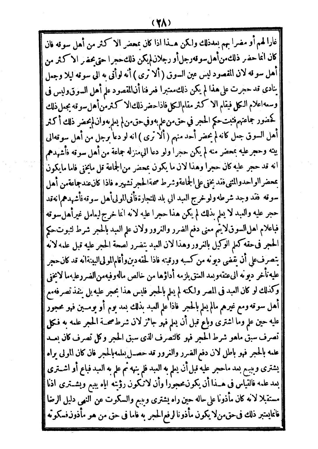 غَارًّا لَهُمْ أَوْ مُضِرًّا بِهِمْ بَعْدَ ذَلِكَ وَلَكِنَّ هَذَا إذَا كَانَ بِمَحْضَرِ الْأَكْثَرِ مِنْ أَهْلِ سُوقِهِ فَإِنْ كَانَ إنَّمَا حَضَرَ ذَلِكَ مِنْ أَهْلِ سُوقِهِ رَجُلٌ أَوْ رَجُلَانِ لَمْ يَكُنْ ذَلِكَ حَجْرًا حَتَّى يَحْضُرَ الْأَكْثَرُ مِنْ أَهْلِ سُوقِهِ؛ لِأَنَّ الْمَقْصُودَ لَيْسَ عَيْنَ السُّوقِ. (أَلَا تَرَى) أَنَّهُ لَوْ أَتَى بِهِ إلَى سُوقِهِ لَيْلًا وَجَعَلَ يُنَادِي قَدْ حَجَرْتُ عَلَى هَذَا لَمْ يَكُنْ ذَلِكَ مُعْتَبَرًا فَعَرَفْنَا أَنَّ الْمَقْصُودَ عِلْمُ أَهْلِ السُّوقِ وَلَيْسَ فِي وُسْعِهِ إعْلَامُ الْكُلِّ فَيُقَامُ الْأَكْثَرُ مَقَامَ الْكُلِّ فَإِذَا حَضَرَ ذَلِكَ الْأَكْثَرُ مِنْ أَهْلِ سُوقِهِ يُجْعَلُ ذَلِكَ كَحُضُورِ جَمَاعَتِهِمْ فَثَبَتَ حُكْمُ الْحَجْرِ فِي حَقِّ مَنْ عَلِمَ بِهِ، وَفِي حَقِّ مَنْ لَمْ يَعْلَمْ بِهِ، وَإِنْ لَمْ يَحْضُرْ ذَلِكَ أَكْثَرُ أَهْلِ السُّوقِ جُعِلَ كَأَنَّهُ لَمْ يَحْضُرْ أَحَدٌ مِنْهُمْ.