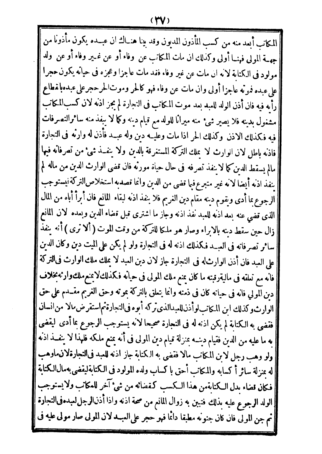 الْمُكَاتَبِ أَبْعَدُ مِنْهُ مِنْ كَسْبِ الْمَأْذُونِ الْمَدْيُونِ وَقَدْ بَيَّنَّا هُنَاكَ أَنَّ عَبْدَهُ يَكُونُ مَأْذُونًا مِنْ جِهَةِ الْمَوْلَى فَهُنَا أَوْلَى وَكَذَلِكَ إنْ مَاتَ الْمُكَاتَبُ عَنْ وَفَاءٍ أَوْ عَنْ غَيْرِ وَفَاءٍ أَوْ عَنْ وَلَدٍ مَوْلُودٍ فِي الْكِتَابَةِ؛ لِأَنَّهُ إنْ مَاتَ عَنْ غَيْرِ وَفَاءٍ فَقَدْ مَاتَ عَاجِزًا وَعَجْزُهُ فِي حَيَاتِهِ يَكُونُ حَجْرًا عَلَى عَبْدِهِ فَمَوْتُهُ عَاجِزًا أَوْلَى، وَإِنْ مَاتَ عَنْ وَفَاءٍ فَهُوَ كَالْحُرِّ وَمَوْتُ الْحُرِّ حَجْرٌ عَلَى عَبْدِهِ بِانْقِطَاعِ رَأْيِهِ فِيهِ فَإِنْ أَذِنَ الْوَلَدُ لِلْعَبْدِ بَعْدَ مَوْتِ الْمُكَاتَبِ فِي التِّجَارَةِ لَمْ يَجُزْ إذْنُهُ؛ لِأَنَّ كَسْبَ الْمُكَاتَبِ مَشْغُولٌ بِدَيْنِهِ فَلَا يَصِيرُ شَيْءٌ مِنْهُ مِيرَاثًا لِلْوَلَدِ مَعَ قِيَامِ دَيْنِهِ وَكَمَا لَا يَنْفُذُ مِنْهُ سَائِرُ التَّصَرُّفَاتِ فِيهِ فَكَذَلِكَ الْإِذْنُ وَكَذَلِكَ الْحُرُّ إذَا مَاتَ وَعَلَيْهِ دَيْنٌ وَلَهُ عَبْدٌ فَأَذِنَ لَهُ وَارِثُهُ فِي التِّجَارَةِ فَإِذْنُهُ بَاطِلٌ؛ لِأَنَّ الْوَارِثَ لَا يَمْلِكُ التَّرِكَةَ الْمُسْتَغْرَقَةَ بِالدَّيْنِ وَلَا يَنْفُذُ شَيْءٌ مِنْ تَصَرُّفَاتِهِ فِيهَا مَا لَمْ يَسْقُطْ الدَّيْنُ كَمَا لَا يَنْفُذُ تَصَرُّفُهُ فِي حَالِ حَيَاةِ مُوَرِّثِهِ فَإِنْ قَضَى الْوَارِثُ الدَّيْنَ مِنْ مَالِهِ لَمْ يَنْفُذْ إذْنُهُ أَيْضًا؛ لِأَنَّهُ غَيْرُ مُتَبَرِّعٍ فِيمَا قَضَى مِنْ الدَّيْنِ، وَإِنَّمَا قَصَدَ بِهِ اسْتِخْلَاصَ التَّرِكَةِ فَيَسْتَوْجِبُ الرُّجُوعَ بِمَا أَدَّى وَيَقُومُ دَيْنَهُ مَقَامَ دَيْنِ الْغَرِيمِ فَلَا يَنْفُذُ إذْنُهُ لِبَقَاءِ الْمَانِعِ فَإِنْ أَبْرَأَ أَبَاهُ مِنْ الْمَالِ الَّذِي قَضَى عَنْهُ بَعْدَ إذْنِهِ لِلْعَبْدِ نَفَذَ إذْنُهُ وَجَازَ مَا اشْتَرَى قَبْلَ قَضَاءِ الدَّيْنِ وَبَعْدَهُ؛ لِأَنَّ الْمَانِعَ زَالَ حِينَ سَقَطَ دَيْنُهُ بِالْإِبْرَاءِ وَصَارَ هُوَ مِلْكًا لِلتَّرِكَةِ مِنْ وَقْتِ الْمَوْتِ.
