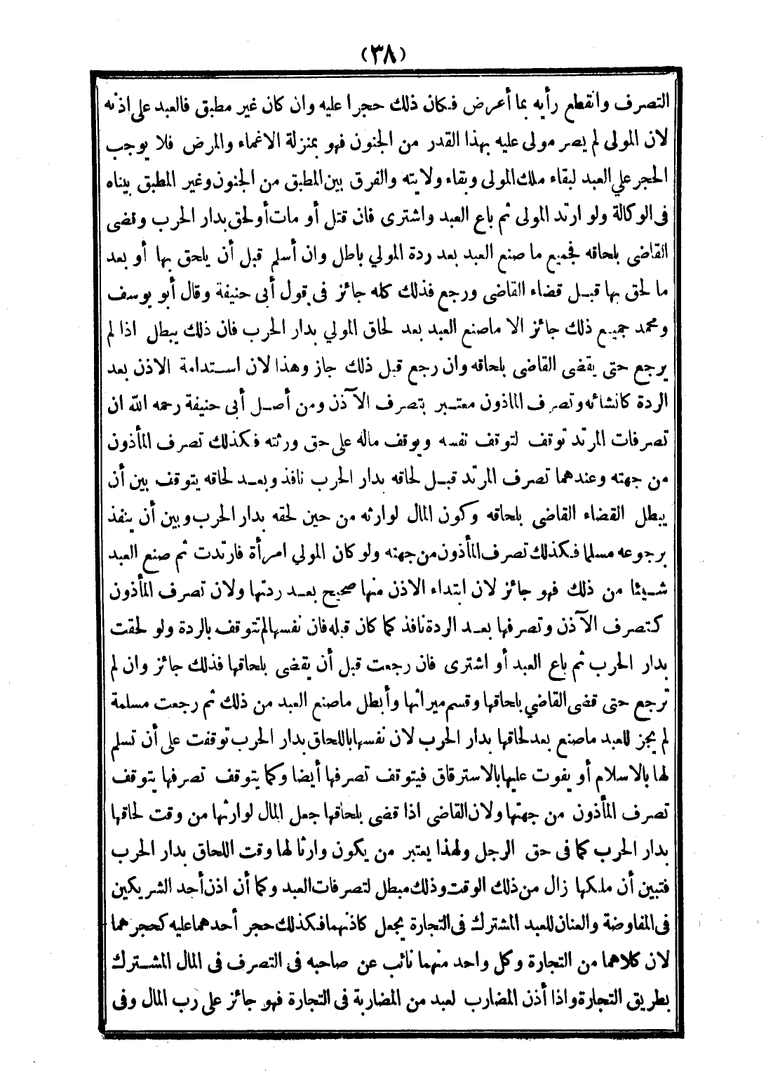 وَمِنْ أَصْلِ أَبِي حَنِيفَةَ - رَحِمَهُ اللَّهُ - أَنَّ تَصَرُّفَاتِ الْمُرْتَدِّ تُوقَفُ لِتَوَقُّفِ نَفْسِهِ وَيُوقَفُ مَالُهُ عَلَى حَقِّ وَرَثَتِهِ فَكَذَلِكَ تَصَرُّفُ الْمَأْذُونِ مِنْ جِهَتِهِ وَعِنْدَهُمَا تَصَرُّفُ الْمُرْتَدِّ قَبْلَ لِحَاقِهِ بِدَارِ الْحَرْبِ نَافِذٌ وَبَعْدَ لِحَاقِهِ يَتَوَقَّفُ بَيْنَ أَنْ يُبْطِلَ الْقَضَاءَ الْقَاضِي بِلَحَاقِهِ وَكَوْنِ الْمَالِ لِوَارِثِهِ مِنْ حِينِ لَحِقَهُ بِدَارِ الْحَرْبِ وَبَيْنَ أَنْ يَنْفُذَ بِرُجُوعِهِ مُسْلِمًا فَكَذَلِكَ تَصَرُّفُ الْمَأْذُونِ مِنْ جِهَتِهِ وَلَوْ كَانَ الْمَوْلَى امْرَأَةً فَارْتَدَّتْ، ثُمَّ صَنَعَ الْعَبْدُ شَيْئًا مِنْ ذَلِكَ فَهُوَ جَائِزٌ؛ لِأَنَّ ابْتِدَاءَ الْإِذْنِ مِنْهَا صَحِيحٌ بَعْدَ رِدَّتِهَا وَلِأَنَّ تَصَرُّفَ الْمَأْذُونِ كَتَصَرُّفِ الْآذِنِ وَتَصَرُّفُهَا بَعْدَ الرِّدَّةِ نَافِذٌ كَمَا كَانَ قَبْلَهُ فَإِنَّ نَفْسَهَا لَمْ تَتَوَقَّفْ بِالرِّدَّةِ وَلَوْ لَحِقَتْ بِدَارِ الْحَرْبِ، ثُمَّ بَاعَ الْعَبْدُ أَوْ اشْتَرَى فَإِنْ رَجَعَتْ قَبْلَ أَنْ يُقْضَى بِلِحَاقِهَا فَذَلِكَ جَائِزٌ، وَإِنْ لَمْ تَرْجِعْ حَتَّى قَضَى الْقَاضِي بِلِحَاقِهَا وَقَسَّمَ مِيرَاثَهَا وَأَبْطَلَ مَا صَنَعَ الْعَبْدُ مِنْ ذَلِكَ، ثُمَّ رَجَعَتْ مُسْلِمَةً لَمْ يَجُزْ لِلْعَبْدِ مَا صَنَعَ بَعْدَ لِحَاقِهَا بِدَارِ الْحَرْبِ؛ لِأَنَّ نَفْسَهَا بِاللِّحَاقِ بِدَارِ الْحَرْبِ تَوَقَّفَتْ عَلَى أَنْ تُسَلِّمَ لَهَا بِالْإِسْلَامِ أَوْ يَفُوتُ عَلَيْهَا بِالِاسْتِرْقَاقِ فَيَتَوَقَّفُ تَصَرُّفُهَا أَيْضًا وَكَمَا يَتَوَقَّفُ تَصَرُّفُهَا يَتَوَقَّفُ تَصَرُّفُ الْمَأْذُونِ مِنْ جِهَتِهَا وَلِأَنَّ الْقَاضِيَ إذَا قَضَى بِلِحَاقِهَا جَعَلَ الْمَالَ لِوَارِثِهَا مِنْ وَقْتِ لِحَاقِهَا بِدَارِ الْحَرْبِ كَمَا فِي حَقِّ الرَّجُلِ؛ وَلِهَذَا يُعْتَبَرُ مَنْ يَكُونُ وَارِثًا لَهَا وَقْتَ اللَّحَاقِ بِدَارِ الْحَرْبِ فَتَبَيَّنَ أَنَّ مِلْكَهَا زَالَ مِنْ ذَلِكَ الْوَقْتِ وَذَلِكَ مُبْطِلٌ لِتَصَرُّفَاتِ الْعَبْدِ وَكَمَا أَنَّ إذْنَ أَحَدِ الشَّرِيكَيْنِ فِي الْمُفَاوَضَةِ، وَالْعَنَانِ لِلْعَبْدِ الْمُشْتَرَكِ فِي التِّجَارَةِ يُجْعَلُ كَإِذْنِهِمَا فَكَذَلِكَ حَجْرُ أَحَدِهِمَا عَلَيْهِ كَحَجْرِهِمَا؛ لِأَنَّ كِلَاهُمَا مِنْ التِّجَارَةِ وَكُلُّ وَاحِدٍ مِنْهُمَا نَائِبٌ عَنْ صَاحِبِهِ فِي التَّصَرُّفِ فِي الْمَالِ الْمُشْتَرَكِ بِطَرِيقِ التِّجَارَةِ.
