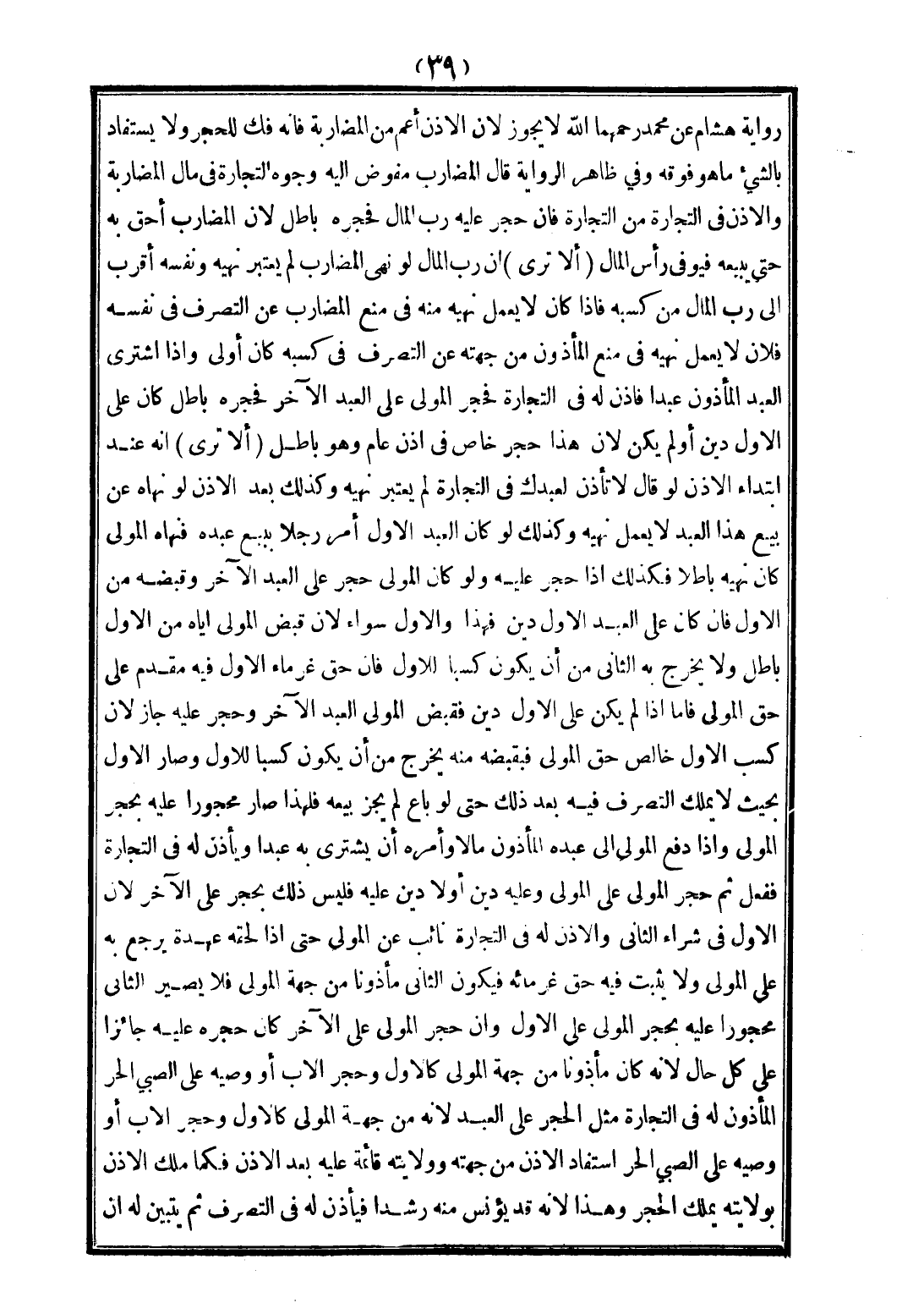 (أَلَا تَرَى) أَنَّهُ عِنْدَ ابْتِدَاءِ الْإِذْنِ لَوْ قَالَ لَا تَأْذَنْ لِعَبْدِكَ فِي التِّجَارَةِ لَمْ يُعْتَبَرْ نَهْيُهُ وَكَذَلِكَ بَعْدَ الْإِذْنِ لَوْ نَهَاهُ عَنْ بَيْعِ هَذَا الْعَبْدِ لَا يَعْمَلُ نَهْيُهُ وَكَذَلِكَ لَوْ كَانَ الْعَبْدُ الْأَوَّلُ أَمَرَ رَجُلًا بِبَيْعِ عَبْدِهِ فَنَهَاهُ الْمَوْلَى كَانَ نَهْيُهُ بَاطِلًا فَكَذَلِكَ إذَا حَجَرَ عَلَيْهِ وَلَوْ كَانَ الْمَوْلَى حَجَرَ عَلَى الْعَبْدِ الْآخَرِ وَقَبَضَهُ مِنْ الْأَوَّلِ فَإِنْ كَانَ عَلَى الْعَبْدِ الْأَوَّلِ دَيْنٌ فَهَذَا، وَالْأَوَّلُ سَوَاءٌ؛ لِأَنَّ قَبْضَ الْمَوْلَى إيَّاهُ مِنْ الْأَوَّلِ بَاطِلٌ وَلَا يَخْرُجُ بِهِ الثَّانِي مِنْ أَنْ يَكُونَ كَسْبًا لِلْأَوَّلِ فَإِنَّ حَقَّ غُرَمَاءِ الْأَوَّلِ فِيهِ مُقَدَّمٌ عَلَى حَقِّ الْمَوْلَى فَأَمَّا إذَا لَمْ يَكُنْ عَلَى الْأَوَّلِ دَيْنٌ فَقَبَضَ الْمَوْلَى الْعَبْدَ الْآخَرَ وَحَجَرَ عَلَيْهِ جَازَ؛ لِأَنَّ كَسْبَ الْأَوَّلِ خَالِصُ حَقِّ الْمَوْلَى فَبِقَبْضِهِ مِنْهُ يَخْرُجُ مِنْ أَنْ يَكُونَ كَسْبًا لِلْأَوَّلِ وَصَارَ الْأَوَّلُ بِحَيْثُ لَا يَمْلِكُ التَّصَرُّفَ فِيهِ بَعْدَ ذَلِكَ حَتَّى لَوْ بَاعَ لَمْ يَجُزْ بَيْعُهُ فَلِهَذَا صَارَ مَحْجُورًا عَلَيْهِ بِحَجْرِ الْمَوْلَى.