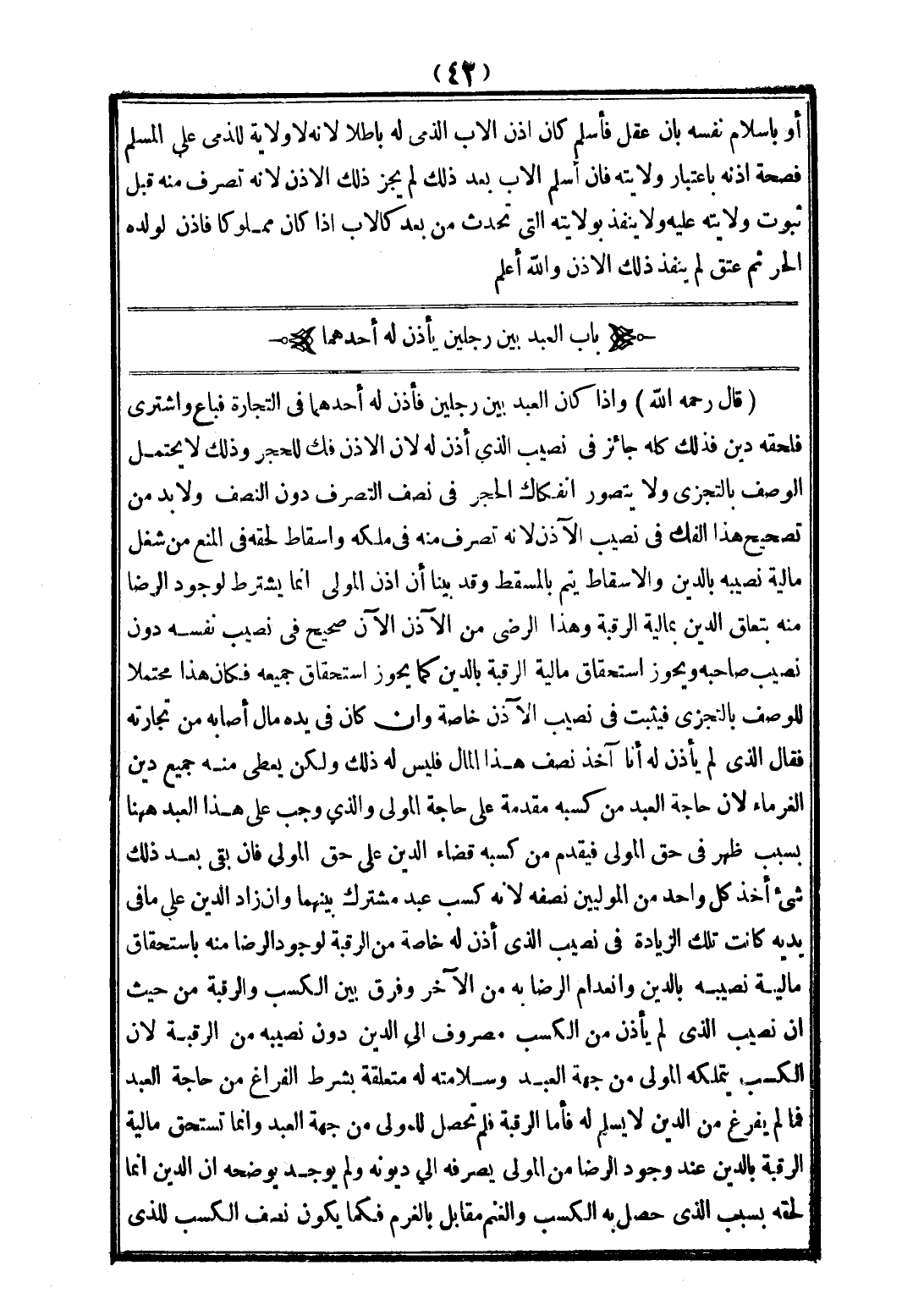 (قَالَ - رَحِمَهُ اللَّهُ -): وَإِذَا كَانَ الْعَبْدُ بَيْنَ رَجُلَيْنِ فَأَذِنَ لَهُ أَحَدُهُمَا فِي التِّجَارَةِ فَبَاعَ وَاشْتَرَى فَلَحِقَهُ دَيْنٌ فَذَلِكَ كُلُّهُ جَائِزٌ فِي نَصِيبِ الَّذِي أَذِنَ لَهُ؛ لِأَنَّ الْإِذْنَ فَكٌّ لِلْحَجْرِ وَذَلِكَ لَا يَحْتَمِلُ الْوَصْفَ بِالتَّجَزِّي وَلَا يُتَصَوَّرُ انْفِكَاكُ الْحَجْرِ فِي نِصْفِ التَّصَرُّفِ دُونَ النِّصْفِ وَلَا بُدَّ مِنْ تَصْحِيحِ هَذَا الْفَكِّ فِي نَصِيبِ الْآذِنِ؛ لِأَنَّهُ تَصَرُّفٌ مِنْهُ فِي مِلْكِهِ وَاسِقَاطٌ لِحَقِّهِ فِي الْمَنْعِ مِنْ شَغْلِ مَالِيَّةِ نَصِيبِهِ بِالدَّيْنِ، وَالْإِسْقَاطُ يَتِمُّ بِالْمُسْقَطِ وَقَدْ بَيَّنَّا أَنَّ إذْنَ الْمَوْلَى إنَّمَا يُشْتَرَطُ لِوُجُودِ الرِّضَا مِنْهُ بِتَعَلُّقِ الدَّيْنِ بِمَالِيَّةِ الرَّقَبَةِ وَهَذَا الرِّضَى مِنْ الْآذِنِ الْآنَ صَحِيحٌ فِي نَصِيبِ نَفْسِهِ دُونَ نَصِيبِ صَاحِبِهِ وَيَجُوزُ اسْتِحْقَاقُ مَالِيَّةِ الرَّقَبَةِ بِالدَّيْنِ كَمَا يَجُوزُ اسْتِحْقَاقُ جَمِيعِهِ فَكَانَ هَذَا مُحْتَمَلًا لِلْوَصْفِ بِالتَّجَزِّي فَيَثْبُتُ فِي نَصِيبِ الْآذِنِ خَاصَّةً، وَإِنْ كَانَ فِي يَدِهِ مَالٌ أَصَابَهُ مِنْ تِجَارَتِهِ فَقَالَ الَّذِي لَمْ يَأْذَنْ لَهُ أَنَا آخُذُ نِصْفَ هَذَا الْمَالِ فَلَيْسَ لَهُ ذَلِكَ وَلَكِنْ يُعْطَى مِنْهُ جَمِيعُ دَيْنِ الْغُرَمَاءِ؛ لِأَنَّ حَاجَةَ الْعَبْدِ مِنْ كَسْبِهِ مُقَدَّمَةٌ عَلَى حَاجَةِ الْمَوْلَى وَاَلَّذِي وَجَبَ عَلَى هَذَا الْعَبْدِ هَهُنَا بِسَبَبٍ ظَهَرَ فِي حَقِّ الْمَوْلَى فَيُقَدَّمُ مِنْ كَسْبِهِ قَضَاءُ الدَّيْنِ عَلَى حَقِّ الْمَوْلَى فَإِنْ بَقِيَ بَعْدَ ذَلِكَ شَيْءٌ أَخَذَ كُلُّ وَاحِدٍ مِنْ الْمَوْلَيَيْنِ نِصْفَهُ؛ لِأَنَّهُ كَسْبُ عَبْدٍ مُشْتَرَكٍ بَيْنَهُمَا، وَإِنْ زَادَ الدَّيْنُ عَلَى مَا فِي يَدَيْهِ كَانَتْ تِلْكَ الزِّيَادَةُ فِي نَصِيبِ الَّذِي أَذِنَ لَهُ خَاصَّةً مِنْ الرَّقَبَةِ لِوُجُودِ الرِّضَا مِنْهُ بِاسْتِحْقَاقِ مَالِيَّةِ نَصِيبِهِ بِالدَّيْنِ وَانْعِدَامِ الرِّضَا بِهِ مِنْ الْآخَرِ وَفَرَّقَ بَيْنَ الْكَسْبِ، وَالرَّقَبَةِ مِنْ حَيْثُ إنَّ نَصِيبَ الَّذِي لَمْ يَأْذَنْ مِنْ الْكَسْبِ مَصْرُوفٌ إلَى الدَّيْنِ دُونَ نَصِيبِهِ مِنْ الرَّقَبَةِ؛ لِأَنَّ الْكَسْبَ يَتَمَلَّكُهُ الْمَوْلَى مِنْ جِهَةِ الْعَبْدِ وَسَلَامَتُهُ لَهُ مُتَعَلِّقَةٌ بِشَرْطِ الْفَرَاغِ مِنْ حَاجَةِ الْعَبْدِ فَمَا لَمْ يَفْرُغْ مِنْ الدَّيْنِ لَا يُسَلَّمُ لَهُ فَأَمَّا الرَّقَبَةُ فَلَمْ تَحْصُلْ لِلْمَوْلَى مِنْ جِهَةِ الْعَبْدِ، وَإِنَّمَا تُسْتَحَقُّ مَالِيَّةُ الرَّقَبَةِ بِالدَّيْنِ عِنْدَ وُجُودِ الرِّضَا مِنْ الْمَوْلَى يَصْرِفُهُ إلَى دُيُونِهِ وَلَمْ يُوجَدْ يُوَضِّحُهُ أَنَّ الدَّيْنَ إنَّمَا لَحِقَهُ بِسَبَبِ الَّذِي حَصَلَ بِهِ الْكَسْبُ، وَالْغُنْمُ مُقَابَلٌ بِالْغُرْمِ فَكَمَا يَكُونُ نِصْفُ الْكَسْبِ لِلَّذِي.