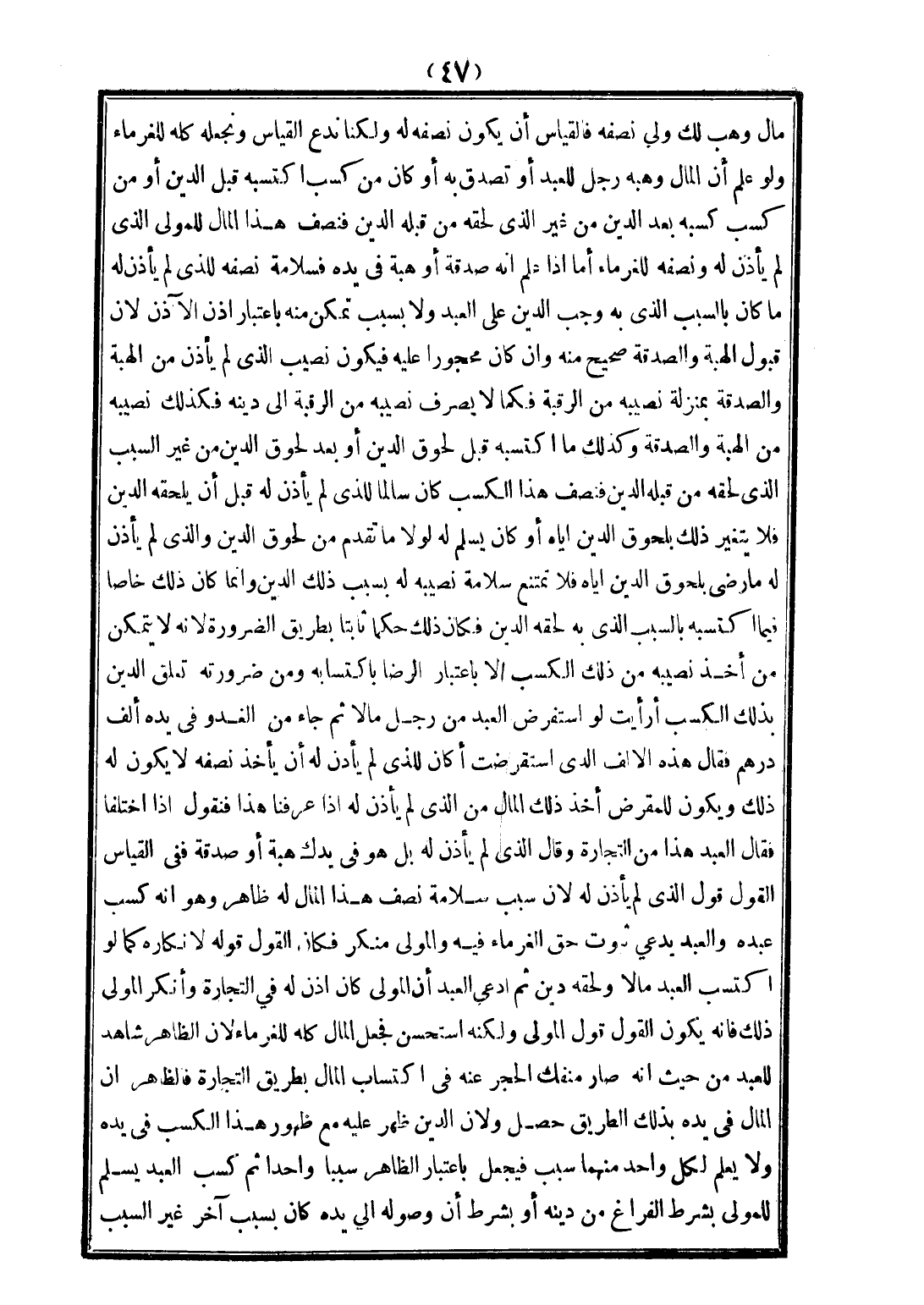 فَالْقِيَاسُ أَنْ يَكُونَ نِصْفُهُ لَهُ وَلَكِنَّا نَدَعُ الْقِيَاسَ وَنَجْعَلُهُ كُلَّهُ لِلْغُرَمَاءِ وَلَوْ عَلِمَ أَنَّ الْمَالَ وَهَبَهُ رَجُلٌ لِلْعَبْدِ أَوْ تَصَدَّقَ بِهِ أَوْ كَانَ مِنْ كَسْبٍ اكْتَسَبَهُ قَبْلَ الدَّيْنِ أَوْ مِنْ كَسْبٍ كَسَبَهُ بَعْدَ الدَّيْنِ مِنْ غَيْرِ الَّذِي لَحِقَهُ مِنْ قِبَلِهِ الدَّيْنُ فَنِصْفُ هَذَا الْمَالِ لِلْمَوْلَى الَّذِي لَمْ يَأْذَنْ لَهُ وَنِصْفُهُ لِلْغُرَمَاءِ أَمَّا إذَا عَلِمَ أَنَّهُ صَدَقَةٌ أَوْ هِبَةٌ فِي يَدِهِ فَسَلَامَةُ نِصْفِهِ لِلَّذِي لَمْ يَأْذَنْ لَهُ مَا كَانَ بِالسَّبَبِ الَّذِي بِهِ وَجَبَ الدَّيْنُ عَلَى الْعَبْدِ وَلَا بِسَبَبٍ تُمْكِنُ مِنْهُ بِاعْتِبَارِ إذْنِ الْآذِنِ؛ لِأَنَّ قَبُولَ الْهِبَةِ، وَالصَّدَقَةِ صَحِيحٌ مِنْهُ، وَإِنْ كَانَ مَحْجُورًا عَلَيْهِ فَيَكُونُ نَصِيبُ الَّذِي لَمْ يَأْذَنْ مِنْ الْهِبَةِ، وَالصَّدَقَةِ بِمَنْزِلَةِ نَصِيبِهِ مِنْ الرَّقَبَةِ فَكَمَا لَا يُصْرَفُ نَصِيبُهُ مِنْ الرَّقَبَةِ إلَى دَيْنِهِ فَكَذَلِكَ نَصِيبُهُ مِنْ الْهِبَةِ، وَالصَّدَقَةِ وَكَذَلِكَ مَا اكْتَسَبَهُ قَبْلَ لُحُوقِ الدَّيْنِ أَوْ بَعْدَ لُحُوقِ الدَّيْنِ مِنْ غَيْرِ السَّبَبِ الَّذِي لَحِقَهُ مِنْ قِبَلِهِ الدَّيْنُ فَنِصْفُ هَذَا الْكَسْبِ كَانَ سَالِمًا لِلَّذِي لَمْ يَأْذَنْ لَهُ قَبْلَ أَنْ يَلْحَقَهُ الدَّيْنُ فَلَا يَتَغَيَّرُ ذَلِكَ بِلُحُوقِ الدَّيْنِ إيَّاهُ أَوْ كَانَ يُسَلَّمُ لَهُ لَوْلَا مَا تَقَدَّمَ مِنْ لُحُوقِ الدَّيْنِ وَاَلَّذِي لَمْ يَأْذَنْ لَهُ مَا رَضِيَ بِلُحُوقِ الدَّيْنِ إيَّاهُ فَلَا تَمْتَنِعُ سَلَامَةُ نَصِيبِهِ لَهُ بِسَبَبِ ذَلِكَ الدَّيْنِ.