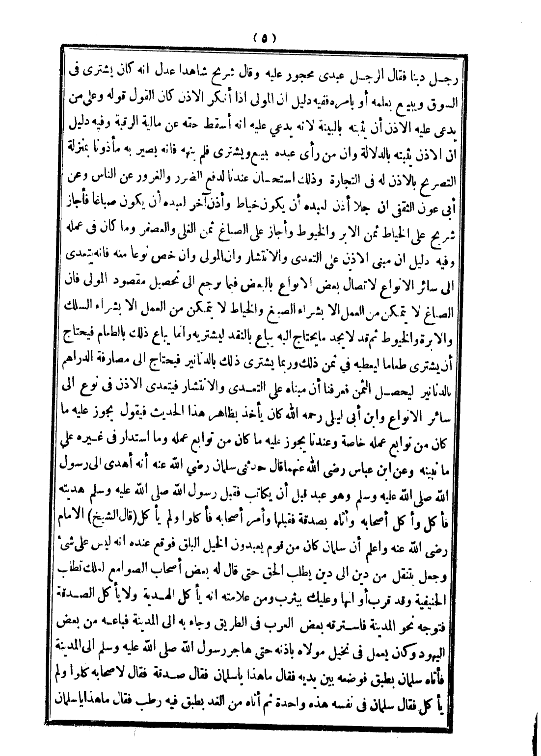 رَجُلٍ دَيْنًا فَقَالَ الرَّجُلُ عَبْدِي مَحْجُورٌ عَلَيْهِ، وَقَالَ شُرَيْحٌ: شَاهِدَا عَدْلٍ أَنَّهُ كَانَ يَشْتَرِي فِي السُّوقِ وَيَبِيعُ بِعِلْمِهِ أَوْ بِأَمْرِهِ فَفِيهِ دَلِيلٌ أَنَّ الْمَوْلَى إذَا أَنْكَرَ الْإِذْنَ كَانَ الْقَوْلُ قَوْلَهُ وَعَلَى مِنْ يَدَّعِي عَلَيْهِ الْإِذْنَ أَنْ يُثْبِتَهُ بِالْبَيِّنَةِ؛ لِأَنَّهُ يَدَّعِي عَلَيْهِ أَنَّهُ أَسْقَطَ حَقَّهُ عَنْ مَالِيَّةِ الرَّقَبَةِ، وَفِيهِ دَلِيلٌ أَنَّ الْإِذْنَ يُثْبِتُهُ بِالدَّلَالَةِ، وَأَنَّ مَنْ رَأَى عَبْدَهُ يَبِيعُ وَيَشْتَرِي فَلَمْ يَنْهَهُ فَإِنَّهُ يَصِيرُ بِهِ مَأْذُونًا بِمَنْزِلَةِ التَّصْرِيحِ بِالْإِذْنِ لَهُ فِي التِّجَارَةِ وَذَلِكَ اسْتِحْسَانٌ عِنْدَنَا لِدَفْعِ الضَّرَرِ، وَالْغُرُورِ عَنْ النَّاسِ.