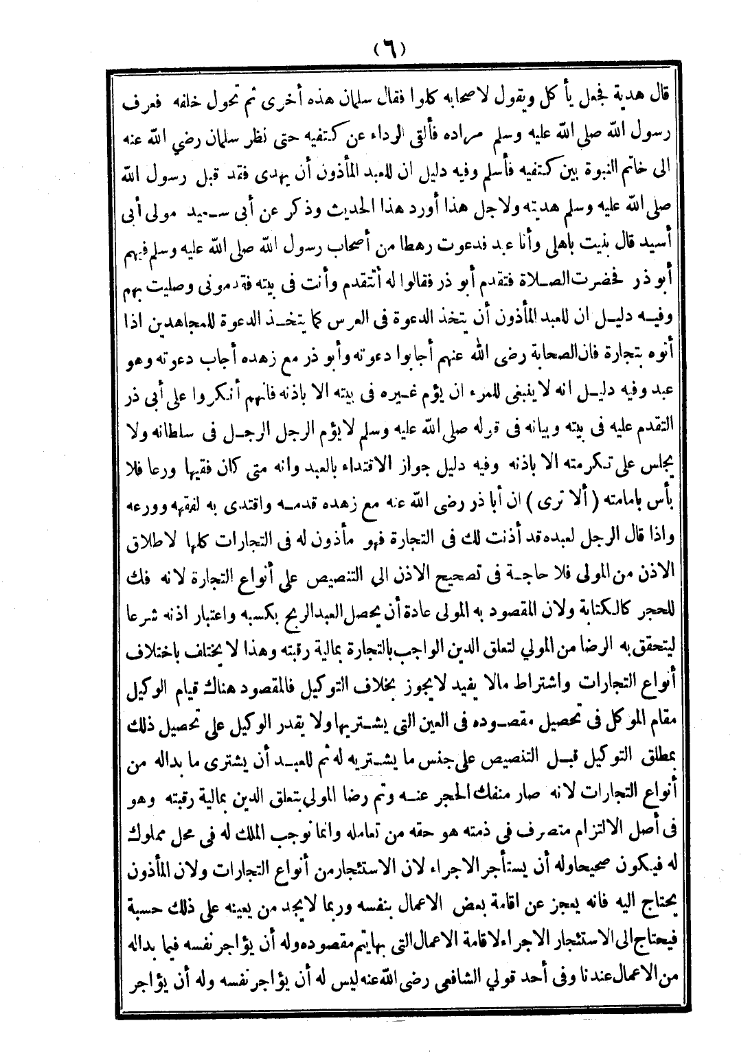 وَفِيهِ دَلِيلُ أَنَّ لِلْعَبْدِ الْمَأْذُونَ أَنْ يَهْدِيَ فَقَدْ قَبِلَ رَسُولُ اللَّهِ - صَلَّى اللَّهُ عَلَيْهِ وَسَلَّمَ - هَدِيَّتَهُ وَلِأَجْلِ هَذَا أَوْرَدَ هَذَا الْحَدِيثَ. وَذُكِرَ عَنْ أَبِي سَعِيدٍ مَوْلَى أَبِي أُسَيْدَ قَالَ بَنَيْتُ بِأَهْلِي وَأَنَا عَبْدٌ فَدَعَوْتُ رَهْطًا مِنْ أَصْحَابِ رَسُولِ اللَّهِ - صَلَّى اللَّهُ عَلَيْهِ وَسَلَّمَ - فِيهِمْ أَبُو ذَرٍّ فَحَضَرَتْ الصَّلَاةُ فَتَقَدَّمَ أَبُو ذَرٍّ فَقَالُوا لَهُ: أَتَتَقَدَّمُ وَأَنْتَ فِي بَيْتِهِ فَقَدَّمُونِي وَصَلَّيْتُ بِهِمْ، وَفِيهِ دَلِيلُ أَنَّ لِلْعَبْدِ الْمَأْذُونِ أَنْ يَتَّخِذَ الدَّعْوَةَ فِي الْعُرْسِ كَمَا يَتَّخِذُ الدَّعْوَةَ لِلْمُجَاهِدِينَ إذَا أَتَوْهُ بِتِجَارَةٍ فَإِنَّ الصَّحَابَةَ - رَضِيَ اللَّهُ عَنْهُمْ - أَجَابُوا دَعْوَتَهُ وَأَبُو ذَرٍّ مَعَ زُهْدِهِ أَجَابَ دَعْوَتَهُ وَهُوَ عَبْدٌ.