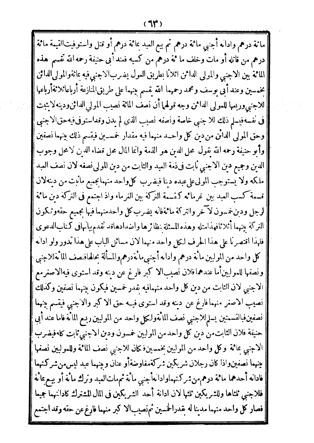 وَهَذِهِ الْمَسْأَلَةُ بِنَظَائِرِهَا وَأَضْدَادِهَا قَدْ تَقَدَّمَ بَيَانُهَا فِي كِتَابِ الدَّعْوَى فَلِهَذَا اقْتَصَرْنَا عَلَى هَذَا الْحَرْفِ لِكُلِّ وَاحِدٍ مِنْهُمَا؛ لِأَنَّ مَسَائِلَ الْبَابِ عَلَى هَذَا تَدُورُ، وَلَوْ أَدَانَهُ كُلُّ وَاحِدٍ مِنْ الْمَوْلَيَيْنِ مِائَةَ دِرْهَمٍ وَأَدَانَهُ أَجْنَبِيٌّ مِائَةَ دِرْهَمٍ، وَالْمَسْأَلَةُ بِحَالِهَا فَنِصْفُ الْمِائَةِ لِلْأَجْنَبِيِّ وَنِصْفُهَا لِلْمَوْلَيَيْنِ أَمَّا عِنْدَهُمَا فَلِأَنَّ نَصِيبَ الْأَكْبَرِ فَارِغٌ عَنْ دَيْنِهِ وَقَدْ اسْتَوَى فِيهِ الْأَصْغَرُ مَعَ الْأَجْنَبِيِّ؛ لِأَنَّ الثَّابِتَ مِنْ دَيْنِ كُلِّ وَاحِدٍ مِنْهُمَا فِيهِ بِقَدْرِ خَمْسِينَ فَيَكُونُ بَيْنَهُمَا نِصْفَيْنِ وَكَذَلِكَ نَصِيبُ الْأَصْغَرِ مِنْهُمَا فَارِغٌ عَنْ دَيْنِهِ، وَقَدْ اسْتَوَى فِيهِ حَقُّ الْأَكْبَرِ، وَالْأَجْنَبِيِّ فَيُقَسَّمُ بَيْنَهُمَا نِصْفَيْنِ فَبِالْقِسْمَتَيْنِ يُسَلَّمُ لِلْأَجْنَبِيِّ نِصْفُ الْمِائَةِ وَلِكُلِّ وَاحِدٍ مِنْ الْمَوْلَيَيْنِ رُبْعُ الْمِائَةِ.