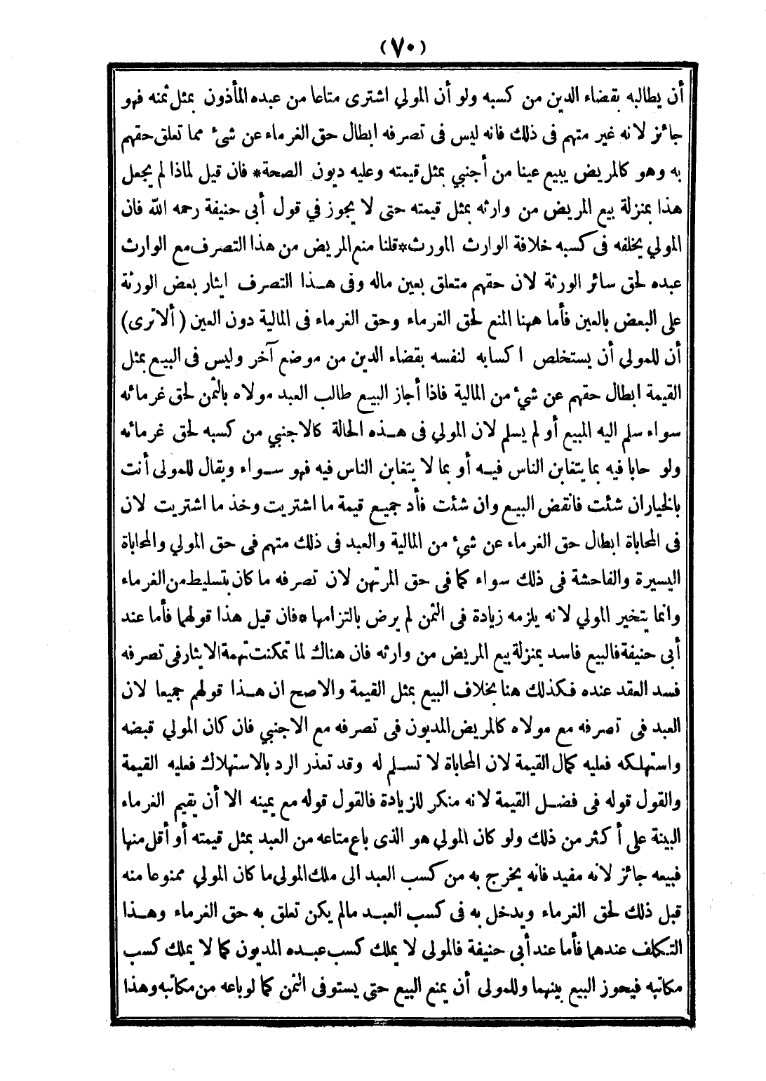 أَنْ يُطَالِبَهُ بِقَضَاءِ الدَّيْنِ مِنْ كَسْبِهِ وَلَوْ أَنَّ الْمَوْلَى اشْتَرَى مَتَاعًا مِنْ عَبْدِهِ الْمَأْذُونِ بِمِثْلِ ثَمَنِهِ فَهُوَ جَائِزٌ؛ لِأَنَّهُ غَيْرُ مُتَّهَمٍ فِي ذَلِكَ فَإِنَّهُ لَيْسَ فِي تَصَرُّفِهِ إبْطَالُ حَقِّ الْغُرَمَاءِ عَنْ شَيْءٍ مِمَّا تَعَلَّقَ حَقُّهُمْ بِهِ وَهُوَ كَالْمَرِيضِ يَبِيعُ عَيْنًا مِنْ أَجْنَبِيٍّ بِمِثْلِ قِيمَتِهِ وَعَلَيْهِ دُيُونُ الصِّحَّةِ.