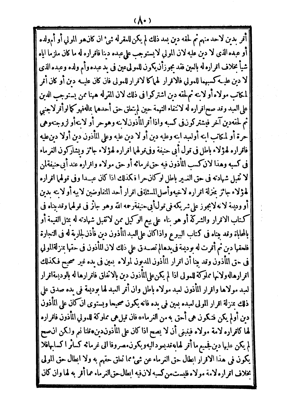 أَقَرَّ بِدَيْنٍ لِأَحَدٍ مِنْهُمْ، ثُمَّ لَحِقَهُ دَيْنٌ بَعْدَ ذَلِكَ لَمْ يَكُنْ لِلْمُقِرِّ لَهُ شَيْءٌ إنْ كَانَ هُوَ الْمَوْلَى أَوْ أُمَّ وَلَدِهِ أَوْ عَبْدَهُ الَّذِي لَا دَيْنَ عَلَيْهِ؛ لِأَنَّ الْمَوْلَى لَا يَسْتَوْجِبُ عَلَى عَبْدِهِ دَيْنًا فَإِقْرَارُهُ لَهُ مَا كَانَ مُلْزِمًا إيَّاهُ شَيْئًا بِخِلَافِ إقْرَارِهِ لَهُ بِالْعَيْنِ فَقَدْ يَجُوزُ أَنْ يَكُونَ لِلْمَوْلَى عَيْنٌ فِي يَدِ عَبْدِهِ وَأُمِّ وَلَدِهِ وَعَبْدِهِ الَّذِي لَا دَيْنَ عَلَيْهِ كَسْبُهُمَا لِلْمَوْلَى فَالْإِقْرَارُ لَهُمَا كَالْإِقْرَارِ لِلْمَوْلَى فَإِنْ كَانَ عَلَيْهِ دَيْنٌ أَوْ كَانَ أَقَرَّ لِمُكَاتَبِ مَوْلَاهُ أَوْ لِابْنِهِ، ثُمَّ لَحِقَهُ دَيْنٌ اشْتَرَكُوا فِي ذَلِكَ؛ لِأَنَّ الْمُقَرَّ لَهُ هَهُنَا مِمَّنْ يَسْتَوْجِبُ الدَّيْنَ عَلَى الْعَبْدِ، وَقَدْ صَحَّ إقْرَارُهُ لَهُ لِانْتِفَاءِ التُّهْمَةِ حِينَ لَمْ يَتَعَلَّقْ حَقُّ أَحَدِهِمَا بِمَالِهِ فَهُوَ كَمَا لَوْ أَقَرَّ لِأَجْنَبِيٍّ، ثُمَّ لَحِقَهُ دَيْنٌ آخَرُ فَيَشْتَرِكُونَ فِي كَسْبِهِ.