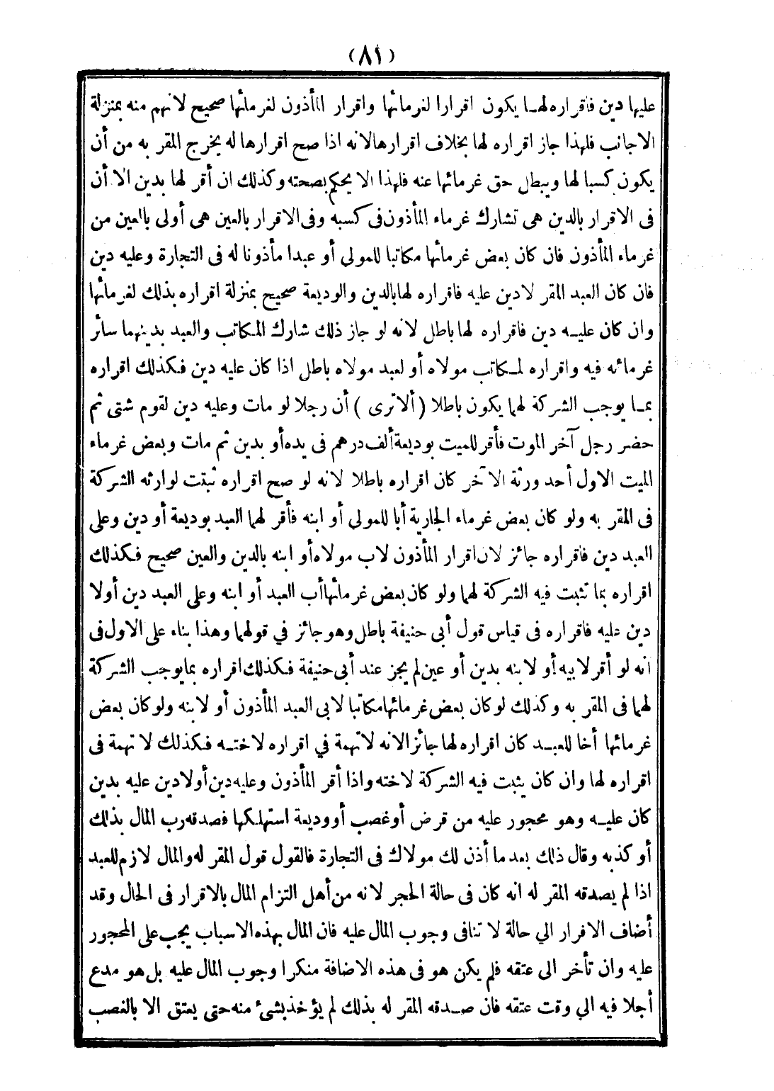 عَلَيْهَا دَيْنٌ فَإِقْرَارُهُ لَهَا يَكُونُ إقْرَارًا لِغُرَمَائِهَا وَإِقْرَارُ الْمَأْذُونِ لِغُرَمَائِهَا صَحِيحٌ؛ لِأَنَّهُمْ مِنْهُ بِمَنْزِلَةِ الْأَجَانِبِ فَلِهَذَا جَازَ إقْرَارُهُ لَهَا بِخِلَافِ إقْرَارِهَا؛ لِأَنَّهُ إذَا صَحَّ إقْرَارُهَا لَهُ يَخْرُجُ الْمُقَرُّ بِهِ مِنْ أَنْ يَكُونَ كَسْبًا لَهَا وَيَبْطُلُ حَقُّ غُرَمَائِهَا عَنْهُ فَلِهَذَا لَا يُحْكَمُ بِصِحَّتِهِ وَكَذَلِكَ إنْ أَقَرَّ لَهَا بِدَيْنٍ إلَّا أَنَّ فِي الْإِقْرَارِ بِالدَّيْنِ هِيَ تُشَارِكُ غُرَمَاءَ الْمَأْذُونِ فِي كَسْبِهِ، وَفِي الْإِقْرَارِ بِالْعَيْنِ هِيَ أَوْلَى بِالْعَيْنِ مِنْ غُرَمَاءِ الْمَأْذُونِ.