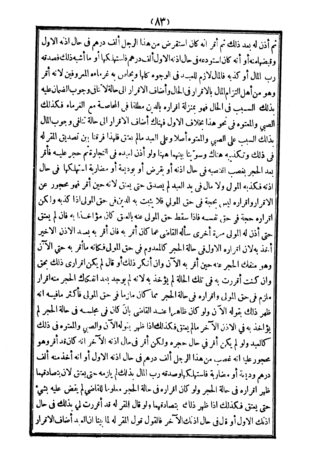وَلَوْ أَذِنَ لِعَبْدِهِ فِي التِّجَارَةِ، ثُمَّ حَجَرَ عَلَيْهِ فَأَقَرَّ بَعْدَ الْحَجْرِ بِغَصْبٍ اغْتَصَبَهُ فِي حَالِ إذْنِهِ أَوْ بِقَرْضٍ أَوْ بِوَدِيعَةٍ أَوْ مُضَارَبَةٍ اسْتَهْلَكَهَا فِي حَالِ إذْنِهِ فَكَذَّبَهُ الْمَوْلَى وَلَا مَالَ فِي يَدِ الْعَبْدِ لَمْ يُصَدَّقْ حَتَّى يُعْتِقَ؛ لِأَنَّهُ حِينَ أَقَرَّ فَهُوَ مَحْجُورٌ عَنْ الْقَرَارِ وَإِقْرَارُهُ لَيْسَ بِحُجَّةٍ فِي حَقِّ الْمَوْلَى فَلَا يَثْبُتُ بِهِ الدَّيْنُ فِي حَقِّ الْمَوْلَى إذَا كَذَّبَهُ وَلَكِنَّ إقْرَارَهُ حُجَّةٌ فِي حَقِّ نَفْسِهِ فَإِذَا سَقَطَ حَقُّ الْمَوْلَى عَنْهُ بِالْعِتْقِ كَانَ مُؤَاخَذًا بِهِ فَإِنْ لَمْ يُعْتِقْ حَتَّى أَذِنَ لَهُ الْمَوْلَى مَرَّةً أُخْرَى سَأَلَهُ الْقَاضِي عَمَّا كَانَ أَقَرَّ بِهِ فَإِنْ أَقَرَّ بِهِ بَعْدِ الْإِذْنِ الْأَخِيرِ أَخَذَ بِهِ؛ لِأَنَّ إقْرَارَهُ الْأَوَّلَ فِي حَالَةِ الْحَجْرِ كَالْمَعْدُومِ فِي حَقِّ الْمَوْلَى فَكَأَنَّهُ مَا أَقَرَّ بِهِ حَتَّى الْآنَ وَهُوَ مُنْفَكُّ الْحَجْرِ عَنْهُ حِين أَقَرَّ بِهِ الْآنَ، وَإِنْ أَنْكَرَ ذَلِكَ أَوْ قَالَ لَمْ يَكُنْ إقْرَارِي ذَلِكَ بِحَقٍّ، وَإِنْ كُنْتُ أَقْرَرْتُ بِهِ فِي تِلْكَ الْحَالَةِ لَمْ يُؤْخَذْ بِهِ؛ لِأَنَّهُ لَمْ يُوجَدْ بَعْدَ انْفِكَاكِ الْحَجْرِ مِنْهُ إقْرَارٌ مُلْزِمٌ فِي حَقِّ الْمَوْلَى وَإِقْرَارُهُ فِي حَالَةِ الْحَجْرِ مِمَّا كَانَ مُلْزِمًا فِي حَقِّ الْمَوْلَى فَأَكْثَرُ مَا فِيهِ أَنَّهُ ظَهَرَ ذَلِكَ بِقَوْلِهِ الْآنَ وَلَوْ كَانَ ظَاهِرًا عِنْدَ الْقَاضِي بِأَنْ كَانَ فِي مَجْلِسِهِ فِي حَالَةِ الْحَجْرِ لَمْ يُؤَاخَذْ بِهِ فِي الْإِذْنِ الْآخَرِ مَا لَمْ يُعْتَقْ فَكَذَلِكَ إذَا ظَهَرَ بِقَوْلِهِ " الْآنَ "، وَالصَّبِيُّ، وَالْمَعْتُوهُ فِي ذَلِكَ كَالْعَبْدِ وَلَوْ لَمْ يَكُنْ أَقَرَّ فِي حَالِ حَجْرِهِ وَلَكِنْ أَقَرَّ فِي حَالِ إذْنِهِ الْآخَرِ أَنَّهُ كَانَ قَدْ أَقَرَّ وَهُوَ مَحْجُورٌ عَلَيْهِ أَنَّهُ غَصَبَ مِنْ هَذَا الرَّجُلِ أَلْفَ دِرْهَمٍ فِي حَالِ إذْنِهِ الْأَوَّلِ أَوْ أَنَّهُ أَخَذَ مِنْهُ أَلْفَ دِرْهَمٍ وَدِيعَةً أَوْ مُضَارَبَةً فَاسْتَهْلَكَهَا وَصَدَّقَهُ رَبُّ الْمَالِ بِذَلِكَ لَمْ يَلْزَمْهُ حَتَّى يَعْتِقَ؛ لِأَنَّ بِتَصَادُقِهِمَا ظَهَرَ إقْرَارُهُ فِي حَالَةِ الْحَجْرِ وَلَوْ كَانَ إقْرَارُهُ فِي حَالَةِ الْحَجْرِ مَعْلُومًا لِلْقَاضِي لَمْ يَقْضِ عَلَيْهِ بِشَيْءٍ حَتَّى يَعْتِقَ فَكَذَلِكَ إذَا ظَهَرَ ذَلِكَ بِتَصَادُقِهِمَا، وَلَوْ قَالَ الْمُقَرُّ لَهُ قَدْ أَقْرَرْتَ لِي بِذَلِكَ فِي حَالِ إذْنِكَ الْأَوَّلِ أَوْ قَالَ فِي حَالِ إذْنِكَ الْآخَرِ فَالْقَوْلُ قَوْلُ الْمُقَرِّ لَهُ لِمَا بَيَّنَّا أَنَّ الْعَبْدَ أَضَافَ الْإِقْرَارَ.