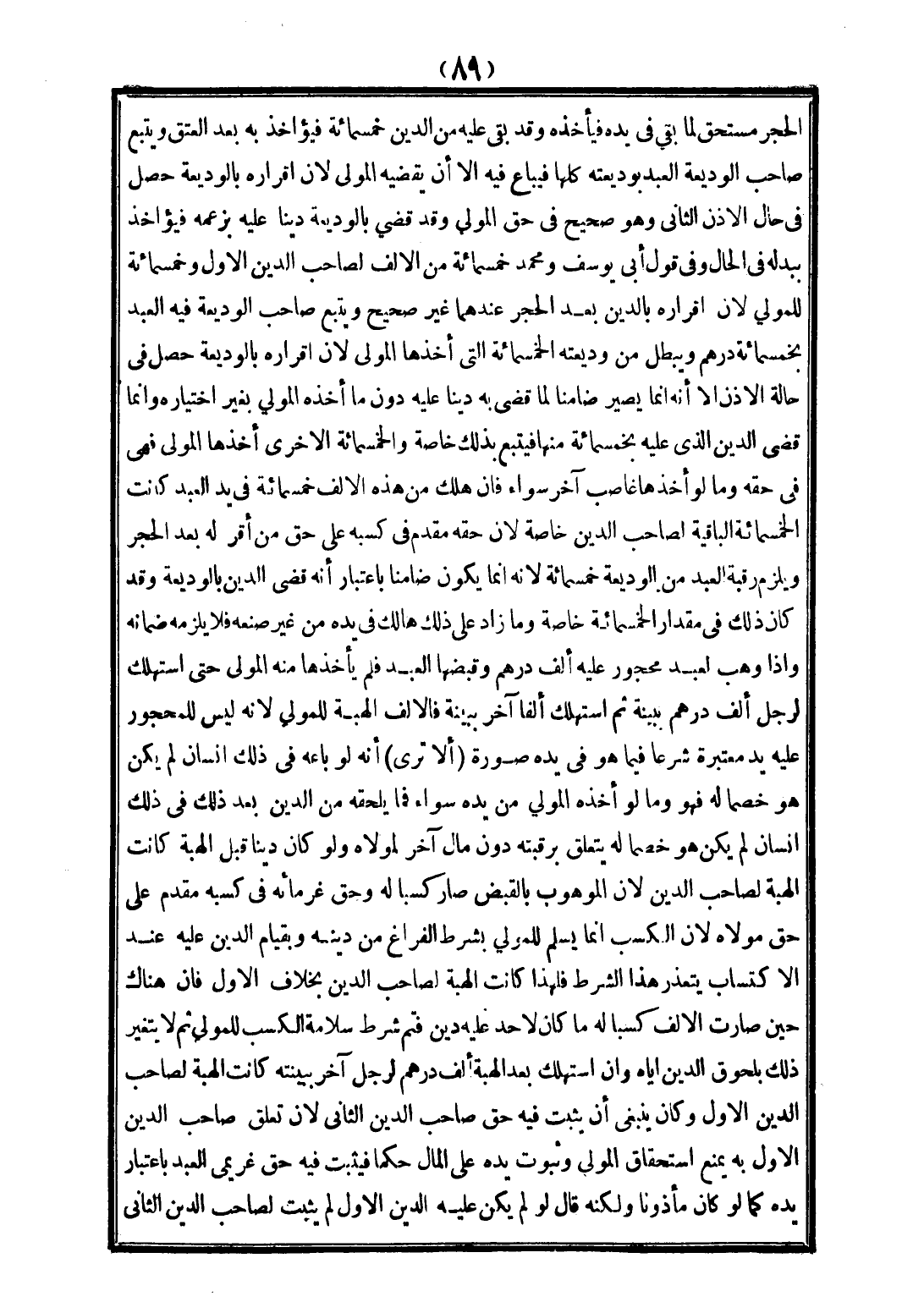 الْحَجْرِ مُسْتَحِقٌّ لِمَا بَقِيَ فِي يَدِهِ فَيَأْخُذُهُ وَقَدْ بَقِيَ عَلَيْهِ مِنْ الدَّيْنِ خَمْسُمِائَةٍ فَيُؤَاخَذُ بِهِ بَعْدَ الْعَتْبِ وَيَتْبَعُ صَاحِبَ الْوَدِيعَةِ الْعَبْدُ بِوَدِيعَتِهِ كُلِّهَا فَيُبَاعُ فِيهِ إلَّا أَنْ يَقْضِيَهُ الْمَوْلَى؛ لِأَنَّ إقْرَارَهُ الْوَدِيعَةِ حَصَلَ فِي حَالِ الْإِذْنِ الثَّانِي وَهُوَ صَحِيحٌ فِي حَقِّ الْمَوْلَى، وَقَدْ قُضِيَ الْوَدِيعَةِ دَيْنًا عَلَيْهِ بِزَعْمِهِ فَيُؤَاخَذُ بِبَدَلِهِ فِي الْحَالِ.