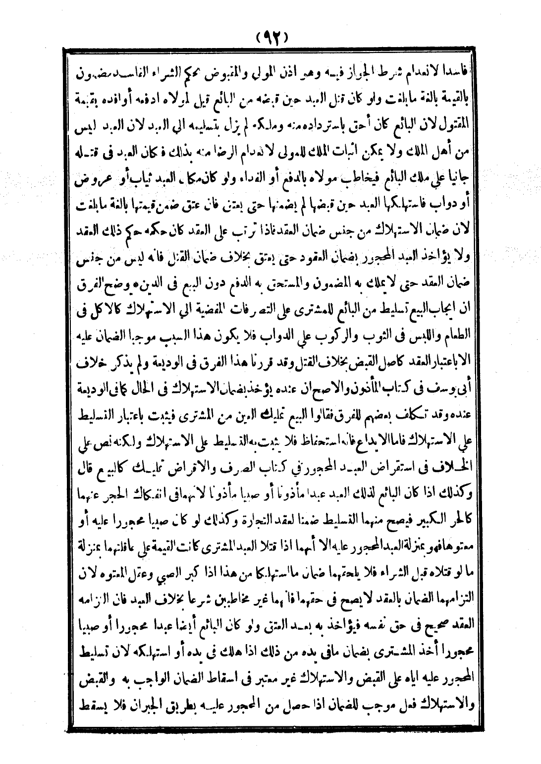 وَلَوْ كَانَ مَكَانَ الْعَبْدِ ثِيَابٌ أَوْ عُرُوضٌ أَوْ دَوَابُّ فَاسْتَهْلَكَهَا الْعَبْدُ حِينَ قَبَضَهَا لَمْ يَضْمَنْهَا حَتَّى يُعْتَقَ فَإِنْ عَتَقَ ضَمِنَ قِيمَتَهَا بَالِغَةً مَا بَلَغَتْ؛ لِأَنَّ ضَمَانَ الِاسْتِهْلَاكِ مِنْ جِنْسِ ضَمَانِ الْعَقْدِ فَإِذَا تَرَتَّبَ عَلَى الْعَقْدِ كَانَ حُكْمُهُ حُكْمَ ذَلِكَ الْعَقْدِ وَلَا يُؤَاخَذُ الْعَبْدُ الْمَحْجُورُ بِضَمَانِ الْعُقُودِ حَتَّى يُعْتَقَ بِخِلَافِ ضَمَانِ الْقَتْلِ فَإِنَّهُ لَيْسَ مِنْ جِنْسِ ضَمَانِ الْعَقْدِ حَتَّى لَا يَمْلِكَ بِهِ الْمَضْمُونَ وَالْمُسْتَحَقُّ بِهِ الدَّفْعُ دُونَ الْبَيْعِ فِي الدَّيْنِ. يُوَضِّحُ الْفَرْقَ أَنَّ إيجَابَ الْبَيْعِ تَسْلِيطٌ مِنْ الْبَائِعِ لِلْمُشْتَرِي عَلَى التَّصَرُّفَاتِ الْمُفْضِيَةِ إلَى الِاسْتِهْلَاكِ كَالْأَكْلِ فِي الطَّعَامِ وَاللُّبْسِ فِي الثَّوْبِ وَالرُّكُوبِ عَلَى الدَّوَابِّ فَلَا يَكُونُ هَذَا السَّبَبُ مُوجِبًا الضَّمَانَ عَلَيْهِ إلَّا بِاعْتِبَارِ الْعَقْدِ كَأَصْلِ الْقَبْضِ بِخِلَافِ الْقَتْلِ وَقَدْ قَرَّرْنَا هَذَا الْفَرْقَ فِي الْوَدِيعَةِ وَلَمْ يُذْكَرْ خِلَافَ أَبِي يُوسُفَ فِي كِتَابِ الْمَأْذُونِ وَالْأَصَحُّ أَنَّ عِنْدَهُ يُؤْخَذُ بِضَمَانِ الِاسْتِهْلَاكِ فِي الْحَالِ كَمَا فِي الْوَدِيعَةِ عِنْدَهُ وَقَدْ تَكَلَّفَ بَعْضُهُمْ لِلْفَرْقِ فَقَالُوا: الْبَيْعُ تَمْلِيكُ الْعَيْنِ مِنْ الْمُشْتَرِي فَيَثْبُتُ بِاعْتِبَارِ التَّسْلِيطِ عَلَى الِاسْتِهْلَاكِ، فَأَمَّا الْإِيدَاعُ فَإِنَّهُ اسْتِحْفَاظٌ فَلَا يَثْبُتُ بِهِ التَّسْلِيطُ عَلَى الِاسْتِهْلَاكِ وَلَكِنَّهُ نَصَّ عَلَى الْخِلَافِ فِي اسْتِقْرَاضِ الْعَبْدِ الْمَحْجُورِ فِي كِتَابِ الصَّرْفِ وَالْإِقْرَاضُ تَمْلِيكٌ كَالْبَيْعِ قَالَ: وَكَذَلِكَ إذَا كَانَ الْبَائِعُ لِذَلِكَ الْعَبْدِ عَبْدًا مَأْذُونًا أَوْ صَبِيًّا مَأْذُونًا لِأَنَّهُمَا فِي انْفِكَاكِ الْحَجْرِ عَنْهُمَا كَالْحُرِّ الْكَبِيرِ فَيَصِحُّ مِنْهُمَا التَّسْلِيطُ ضَمَانًا لِعَقْدِ التِّجَارَةِ وَكَذَلِكَ لَوْ كَانَ صَبِيًّا مَحْجُورًا عَلَيْهِ أَوْ مَعْتُوهًا فَهُوَ بِمَنْزِلَةِ الْعَبْدِ الْمَحْجُورِ عَلَيْهِ إلَّا أَنَّهُمَا إذَا قَتَلَا الْمُشْتَرِيَ كَانَتْ الْقِيمَةُ عَلَى عَاقِلَتِهِمَا بِمَنْزِلَةِ مَا لَوْ قَتَلَاهُ قَبْلَ الشِّرَاءِ فَلَا يَلْحَقُهُمَا ضَمَانُ مَا اسْتَهْلَكَا مِنْ هَذَا إذَا كَبُرَ الصَّبِيُّ وَعَقَلَ الْمَعْتُوهُ؛ لِأَنَّ الْتِزَامَهُمَا الضَّمَانَ بِالْعَقْدِ لَا يَصِحُّ فِي حَقِّهِمَا فَإِنَّهُمَا غَيْرُ مُخَاطَبَيْنِ شَرْعًا بِخِلَافِ الْعَبْدِ فَإِنَّ الْتِزَامَهُ الْعَقْدَ صَحِيحٌ فِي حَقِّ نَفْسِهِ فَيُؤَاخَذُ بِهِ بَعْدَ الْعِتْقِ.