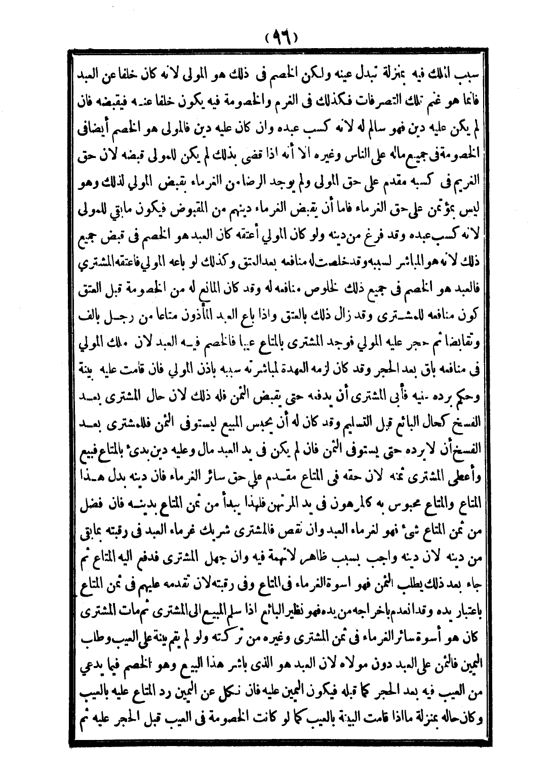 سَبَبِ الْمِلْكِ فِيهِ بِمَنْزِلَةِ تَبَدُّلِ عَيْنِهِ وَلَكِنَّ الْخَصْمَ فِي ذَلِكَ هُوَ الْمَوْلَى؛ لِأَنَّهُ كَانَ خَلَفًا عَنْ الْعَبْدِ فَإِنَّمَا هُوَ غَنِمَ تِلْكَ التَّصَرُّفَاتِ فَكَذَلِكَ فِي الْغُرْمِ وَالْخُصُومَةُ فِيهِ يَكُونُ خَلَفَا عَنْهُ فَيَقْبِضُهُ فَإِنْ لَمْ يَكُنْ عَلَيْهِ دَيْنٌ فَهُوَ سَالِمٌ لَهُ؛ لِأَنَّهُ كَسْبُ عَبْدِهِ وَإِنْ كَانَ عَلَيْهِ دَيْنٌ فَالْمَوْلَى هُوَ الْخَصْمُ أَيْضًا فِي الْخُصُومَةِ فِي جَمِيعِ مَالِهِ عَلَى النَّاسِ وَغَيْرِهِ إلَّا أَنَّهُ إذَا قَضَى بِذَلِكَ لَمْ يَكُنْ لِلْمَوْلَى قَبْضُهُ؛ لِأَنَّ حَقَّ الْغَرِيمِ فِي كَسْبِهِ مُقَدَّمٌ عَلَى حَقِّ الْمَوْلَى وَلَمْ يُوجَدْ الرِّضَا مِنْ الْغُرَمَاءِ بِقَبْضِ الْمَوْلَى لِذَلِكَ وَهُوَ لَيْسَ بِمُؤْتَمَنٍ عَلَى حَقِّ الْغُرَمَاءِ فَأَمَّا أَنْ يَقْبِضَ الْغُرَمَاءُ دَيْنَهُمْ مِنْ الْمَقْبُوضِ فَيَكُونُ مَا بَقِيَ لِلْمَوْلَى؛ لِأَنَّهُ كَسْبُ عَبْدِهِ وَقَدْ فَرَغَ مِنْ دَيْنِهِ، وَلَوْ كَانَ الْمَوْلَى أَعْتَقَهُ كَانَ الْعَبْدُ هُوَ الْخَصْمَ فِي قَبْضِ جَمِيعِ ذَلِكَ؛ لِأَنَّهُ هُوَ الْمُبَاشِرُ لِسَبَبِهِ وَقَدْ خَلَصَتْ لَهُ مَنَافِعُهُ بَعْدَ الْعِتْقِ، وَكَذَلِكَ لَوْ بَاعَهُ الْمَوْلَى فَأَعْتَقَهُ الْمُشْتَرِي فَالْعَبْدُ هُوَ الْخَصْمُ فِي جَمِيعِ ذَلِكَ لِخُلُوصِ مَنَافِعِهِ لَهُ وَقَدْ كَانَ الْمَانِعُ لَهُ مِنْ الْخُصُومَةِ قَبْلَ الْعِتْقِ كَوْنَ مَنَافِعِهِ لِلْمُشْتَرِي وَقَدْ زَالَ ذَلِكَ بِالْعِتْقِ.