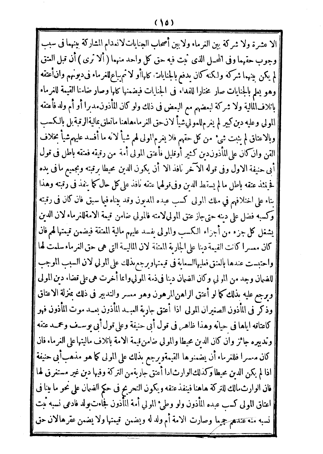 وَإِنْ كَانَ عَلَى الْمَأْذُونِ دَيْنٌ كَثِيرٌ أَوْ قَلِيلٌ فَأَعْتَقَ الْمَوْلَى أَمَةً مِنْ رَقِيقِهِ فَعِتْقُهُ بَاطِلٌ فِي قَوْلِ أَبِي حَنِيفَةَ الْأَوَّلِ وَفِي قَوْلِهِ الْآخَرِ نَافِذٌ إلَّا أَنْ يَكُونَ الدَّيْنُ مُحِيطًا بِرَقَبَتِهِ وَبِجَمِيعِ مَا فِي يَدِهِ فَحِينَئِذٍ عِتْقُهُ بَاطِلٌ مَا لَمْ يَسْقُطْ الدَّيْنُ، وَفِي قَوْلِهِمْ عِتْقُهُ نَافِذٌ عَلَى كُلِّ حَالٍ كَمَا يَنْفُذُ فِي رَقَبَتِهِ، وَهَذَا بِنَاءً عَلَى اخْتِلَافِهِمْ فِي مِلْكِ الْمَوْلَى كَسْبِ عَبْدِهِ الْمَدْيُونِ، وَقَدْ بَيَّنَّاهُ فِيمَا سَبَقَ فَإِنْ كَانَ فِي رَقَبَتِهِ وَكَسْبِهِ فَضْلٌ عَلَى دَيْنِهِ حَتَّى جَازَ عِتْقُ الْمَوْلَى لِأَمَتِهِ فَالْمَوْلَى ضَامِنٌ قِيمَةَ الْأَمَةِ لِلْغُرَمَاءِ؛ لِأَنَّ الدَّيْنَ يَشْغَلُ كُلَّ جُزْءٍ مِنْ أَجْزَاءِ الْكَسْبِ، وَالْمَوْلَى يُفْسِدُ عَلَيْهِمْ مَالِيَّةَ الْمُعْتَقَةِ فَيَضْمَنُ قِيمَتَهَا لَهُمْ، فَإِنْ كَانَ مُعْسِرًا كَانَتْ الْقِيمَةُ دَيْنًا عَلَى الْجَارِيَةِ الْمُعْتَقَةِ؛ لِأَنَّ الْمَالِيَّةَ الَّتِي هِيَ حَقُّ الْغُرَمَاءِ سُلِّمَتْ لَهَا، وَاحْتُبِسَتْ عِنْدَهَا بِالْعِتْقِ فَعَلَيْهَا السِّعَايَةُ فِي قِيمَتِهَا، وَيَرْجِعُ بِذَلِكَ عَلَى الْمَوْلَى؛ لِأَنَّ السَّبَبَ الْمُوجِبَ لِلضَّمَانِ وُجِدَ مِنْ الْمَوْلَى، وَكَانَ الضَّمَانُ دَيْنًا فِي ذِمَّةِ الْمَوْلَى، وَإِنَّمَا أُخِّرَتْ هِيَ عَلَى قَضَاءِ دَيْنِ الْمَوْلَى.