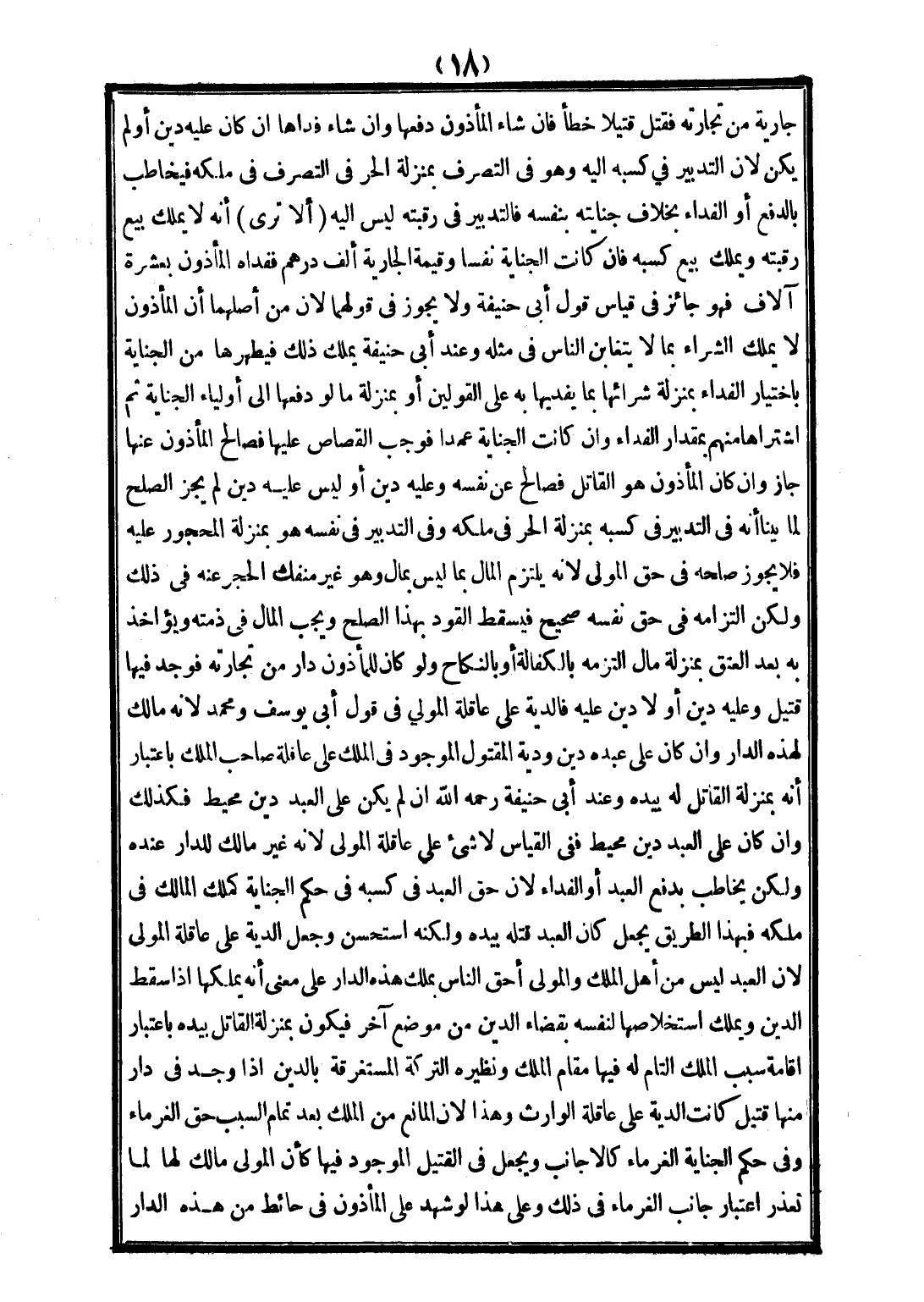 وَلَوْ كَانَ لِلْمَأْذُونِ دَارٌ مِنْ تِجَارَتِهِ فَوُجِدَ فِيهَا قَتِيلٌ، وَعَلَيْهِ دَيْنٌ أَوْ لَا دَيْنَ عَلَيْهِ فَالدِّيَةُ عَلَى عَاقِلَةِ الْمَوْلَى فِي قَوْلِ أَبِي يُوسُفَ وَمُحَمَّدٍ؛ لِأَنَّهُ مَالِكٌ لِهَذِهِ الدَّارِ، وَإِنْ كَانَ عَلَى عَبْدِهِ دَيْنٌ، وَدِيَةُ الْمَقْتُولِ الْمَوْجُودِ فِي الْمِلْكِ عَلَى عَاقِلَةِ صَاحِبِ الْمِلْكِ بِاعْتِبَارِ أَنَّهُ بِمَنْزِلَةِ الْقَاتِلِ لَهُ بِيَدِهِ، وَعِنْدَ أَبِي حَنِيفَةَ - رَحِمَهُ اللَّهُ - إنْ لَمْ يَكُنْ عَلَى الْعَبْدِ دَيْنٌ مُحِيطٌ فَكَذَلِكَ، وَإِنْ كَانَ عَلَى الْعَبْدِ دَيْنٌ مُحِيطٌ فَفِي الْقِيَاسِ لَا شَيْءَ عَلَى عَاقِلَةِ الْمَوْلَى؛ لِأَنَّهُ غَيْرُ مَالِكٍ لِلدَّارِ عِنْدَهُ، وَلَكِنْ يُخَاطَبُ بِدَفْعِ الْعَبْدِ أَوْ الْفِدَاءِ؛ لِأَنَّ حَقَّ الْعَبْدِ فِي كَسْبِهِ فِي حُكْمِ الْجِنَايَةِ كَمِلْكِ الْمَالِكِ فِي مِلْكِهِ فَبِهَذَا الطَّرِيقِ يُجْعَلُ كَأَنَّ الْعَبْدَ قَتَلَهُ بِيَدِهِ، وَلَكِنَّهُ اسْتَحْسَنَ، وَجَعَلَ الدِّيَةَ عَلَى عَاقِلَةِ الْمَوْلَى؛ لِأَنَّ الْعَبْدَ لَيْسَ مِنْ أَهْلِ الْمِلْكِ، وَالْمَوْلَى أَحَقُّ النَّاسِ بِمِلْكِ هَذِهِ الدَّارِ عَلَى مَعْنَى أَنَّهُ يَمْلِكُهَا إذَا سَقَطَ الدَّيْنُ وَيَمْلِكُ اسْتِخْلَاصَهَا لِنَفْسِهِ بِقَضَاءِ الدَّيْنِ مِنْ مَوْضِعٍ آخَرَ فَيَكُونُ بِمَنْزِلَةِ الْقَاتِلِ بِيَدِهِ بِاعْتِبَارِ إقَامَةِ سَبَبِ الْمِلْكِ التَّامِّ لَهُ فِيهَا مَقَامَ الْمِلْكِ وَنَظِيرُهُ التَّرِكَةُ الْمُسْتَغْرَقَةُ بِالدَّيْنِ إذَا وُجِدَ فِي دَارٍ مِنْهَا قَتِيلٌ كَانَتْ الدِّيَةُ عَلَى عَاقِلَةِ الْوَارِثِ.