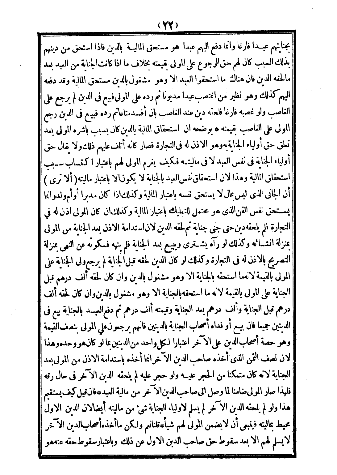 (أَلَا تَرَى) أَنَّ الْجَانِيَ الَّذِي لَيْسَ بِمَالٍ لَا يَسْتَحِقُّ نَفْسَهُ بِاعْتِبَارِ الْمَالِيَّةِ، وَكَذَلِكَ إذَا كَانَ مُدَبَّرًا أَوْ أُمَّ وَلَدٍ، وَإِنَّمَا يَسْتَحِقُّ نَفْسَ الْقِنِّ الَّذِي هُوَ مُحْتَمِلٌ لِلتَّمْلِيكِ بِاعْتِبَارِ الْمَالِيَّةِ، وَكَذَلِكَ إنْ كَانَ الْمَوْلَى أَذِنَ لَهُ فِي التِّجَارَةِ فَلَمْ يَلْحَقْهُ دَيْنٌ حَتَّى جَنَى جِنَايَةً ثُمَّ لَحِقَهُ الدَّيْنُ لِأَنَّ اسْتِدَامَةَ الْإِذْنِ بَعْدَ الْجِنَايَةِ مِنْ الْمَوْلَى بِمَنْزِلَةِ إنْشَائِهِ، وَكَذَلِكَ لَوْ رَآهُ يَشْتَرِي وَيَبِيعُ بَعْدَ الْجِنَايَةِ فَلَمْ يَنْهَهُ فَسُكُوتُهُ عَنْ النَّهْيِ بِمَنْزِلَةِ التَّصْرِيحِ بِالْإِذْنِ لَهُ فِي التِّجَارَةِ، وَكَذَلِكَ لَوْ كَانَ الدَّيْنُ لَحِقَهُ قَبْلَ الْجِنَايَةِ لَمْ يَرْجِعْ وَلِيُّ الْجِنَايَةِ عَلَى الْمَوْلَى بِالْقِيمَةِ لِأَنَّهُ مَا اسْتَحَقَّهُ بِالْجِنَايَةِ إلَّا وَهُوَ مَشْغُولٌ بِالدَّيْنِ، وَإِنْ كَانَ لَحِقَهُ أَلْفُ دِرْهَمٍ قَبْلَ الْجِنَايَةِ عَلَى الْمَوْلَى بِالْقِيمَةِ؛ لِأَنَّهُ مَا اسْتَحَقَّهُ بِالْجِنَايَةِ إلَّا، وَهُوَ مَشْغُولٌ بِالدَّيْنِ، وَإِنْ كَانَ لَحِقَهُ أَلْفُ دِرْهَمٍ قَبْلَ الْجِنَايَةِ، وَأَلْفُ دِرْهَمٍ بَعْدَ الْجِنَايَةِ، وَقِيمَتُهُ أَلْفُ دِرْهَمٍ ثُمَّ دُفِعَ الْعَبْدُ بِالْجِنَايَةِ بِيعَ فِي الدَّيْنَيْنِ جَمِيعًا فَإِنْ بِيعَ أَوْ فَدَاهُ أَصْحَابُ الْجِنَايَةِ بِالدَّيْنَيْنِ فَإِنَّهُمْ يَرْجِعُونَ عَلَى الْمَوْلَى بِنِصْفِ الْقِيمَةِ، وَهُوَ حِصَّةُ أَصْحَابِ الدَّيْنِ عَلَى الْآخَرِ اعْتِبَارًا لِكُلِّ وَاحِدٍ مِنْ الدَّيْنَيْنِ بِمَا لَوْ كَانَ هُوَ وَحْدَهُ؛ وَهَذَا لِأَنَّ نِصْفَ الثَّمَنِ الَّذِي أَخَذَهُ صَاحِبُ الدَّيْنِ الْآخَرِ إنَّمَا أَخَذَهُ بِاسْتِدَامَةِ الْإِذْنِ مِنْ الْمَوْلَى بَعْدَ الْجِنَايَةِ؛ لِأَنَّهُ كَانَ مُتَمَكِّنًا مِنْ الْحَجْرِ عَلَيْهِ، وَلَوْ حَجَرَ عَلَيْهِ لَمْ يَلْحَقْهُ الدَّيْنُ لِلْآخَرِ فِي حَالِ رِقِّهِ فَلِهَذَا صَارَ الْمَوْلَى ضَامِنًا لِمَا وَصَلَ إلَى صَاحِبِ الدَّيْنِ الْآخَرِ مِنْ مَالِيَّةِ الْعَبْدِ، فَإِنْ قِيلَ: كَيْفَ يَسْتَقِيمُ هَذَا، وَلَوْ لَمْ يَلْحَقْهُ الدَّيْنُ الْآخَرُ لَمْ يُسَلَّمْ؛ لِأَوْلِيَاءِ الْجِنَايَةِ شَيْءٌ مِنْ مَالِيَّتِهِ أَيْضًا؛ لِأَنَّ الدَّيْنَ الْأَوَّلَ مُحِيطٌ بِمَالِيَّتِهِ فَيَنْبَغِي أَنْ لَا يَضْمَنَ الْمَوْلَى لَهُمْ شَيْئًا قُلْنَا: نَعَمْ، وَلَكِنْ مَا أَخَذَهُ أَصْحَابُ الدَّيْنِ الْآخَرِ لَا يُسَلَّمُ لَهُمْ إلَّا بَعْدَ سُقُوطِ حَقِّ صَاحِبِ الدَّيْنِ الْأَوَّلِ عَنْ ذَلِكَ.