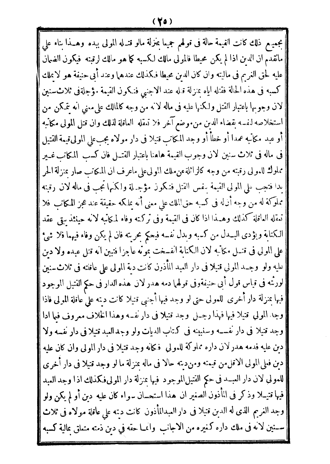 وَلَوْ وُجِدَ الْمَوْلَى قَتِيلًا فِي دَارِ الْعَبْدِ الْمَأْذُونِ كَانَتْ دِيَةُ الْمَوْلَى عَلَى عَاقِلَتِهِ فِي ثَلَاثِ سِنِينَ؛ لِوَرَثَتِهِ فِي قِيَاسِ قَوْلِ أَبِي حَنِيفَةَ وَفِي قَوْلِهِمَا دَمُهُ هَدَرٌ؛ لِأَنَّ هَذِهِ الدَّارَ فِي حُكْمِ الْقَتِيلِ الْمَوْجُودِ فِيهَا بِمَنْزِلَةِ دَارٍ أُخْرَى لِلْمَوْلَى حَتَّى لَوْ وُجِدَ فِيهَا أَجْنَبِيٌّ قَتِيلًا كَانَتْ دِيَتُهُ عَلَى عَاقِلَةٍ الْمَوْلَى فَإِذَا وُجِدَ الْمَوْلَى قَتِيلًا فِيهَا فَهَذَا رَجُلٌ وُجِدَ قَتِيلًا فِي دَارِ نَفْسِهِ، وَهَذَا الْخِلَافُ مَعْرُوفٌ فِيمَا إذَا وُجِدَ قَتِيلًا فِي دَارِ نَفْسِهِ وَسَنُبَيِّنُهُ فِي كِتَابِ الدِّيَاتِ.