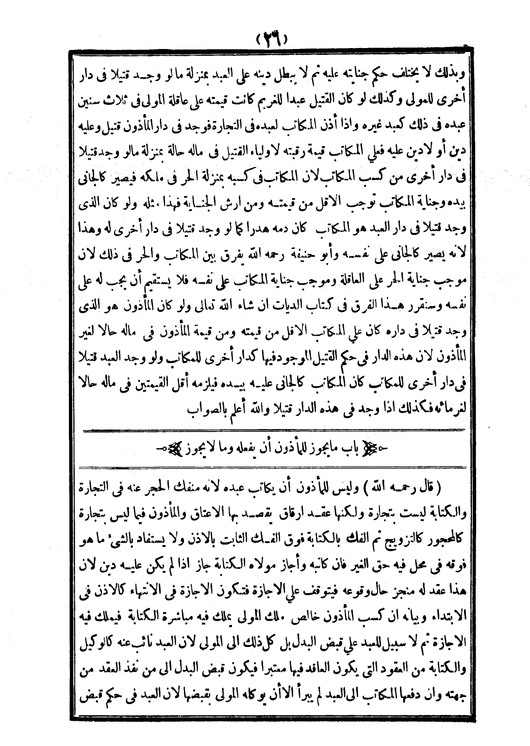 وَبِذَلِكَ لَا يَخْتَلِفُ حُكْمُ جِنَايَتِهِ عَلَيْهِ ثُمَّ لَا يَبْطُلُ دَيْنُهُ عَلَى الْعَبْدِ بِمَنْزِلَةِ مَا لَوْ وُجِدَ قَتِيلًا فِي دَارٍ أُخْرَى لِلْمَوْلَى وَكَذَلِكَ لَوْ كَانَ الْقَتِيلُ عَبْدًا لِلْغَرِيمِ كَانَتْ قِيمَتُهُ عَلَى عَاقِلَةِ الْمَوْلَى فِي ثَلَاثِ سِنِينَ عَبْدُهُ فِي ذَلِكَ كَعَبْدِ غَيْرِهِ وَإِذَا أَذِنَ الْمُكَاتِبُ لِعَبْدِهِ فِي التِّجَارَةِ فَوُجِدَ فِي دَارِ الْمَأْذُونِ قَتِيلٌ وَعَلَيْهِ دَيْنٌ أَوْ لَا دَيْنَ عَلَيْهِ فَعَلَى الْمُكَاتَبِ قِيمَةُ رَقَبَتِهِ لِأَوْلِيَاءِ الْقَتِيلِ فِي مَالِهِ حَالَّةً بِمَنْزِلَةِ مَا لَوْ وُجِدَ قَتِيلًا فِي دَارٍ أُخْرَى مِنْ كَسْبِ الْمُكَاتَبِ لِأَنَّ الْمُكَاتَبَ فِي كَسْبِهِ بِمَنْزِلَةِ الْحُرِّ فِي مِلْكِهِ فَيَصِيرُ كَالْجَانِي بِيَدِهِ وَجِنَايَةُ الْمُكَاتَبِ تُوجِبُ الْأَقَلَّ مِنْ قِيمَتِهِ وَمِنْ أَرْشِ الْجِنَايَةِ فَهَذَا مِثْلُهُ وَلَوْ كَانَ الَّذِي وُجِدَ قَتِيلًا فِي دَارِ الْعَبْدِ هُوَ الْمُكَاتَبَ كَانَ دَمُهُ هَدَرًا كَمَا لَوْ وُجِدَ قَتِيلًا فِي دَارٍ أُخْرَى لَهُ وَهَذَا لِأَنَّهُ يَصِيرُ كَالْجَانِي عَلَى نَفْسِهِ وَأَبُو حَنِيفَةَ - رَحِمَهُ اللَّهُ - يُفَرِّقُ بَيْنَ الْمُكَاتَبِ وَالْحُرِّ فِي ذَلِكَ لِأَنَّ مُوجَبَ جِنَايَةِ الْحُرِّ عَلَى الْعَاقِلَةِ وَمُوجَبَ جِنَايَةِ الْمُكَاتَبِ عَلَى نَفْسِهِ فَلَا يَسْتَقِيمُ أَنْ يَجِبَ لَهُ عَلَى نَفْسِهِ وَسَنُقَرِّرُ هَذَا الْفَرْقَ فِي كِتَابِ الدِّيَاتِ إنْ شَاءَ اللَّهُ تَعَالَى وَلَوْ كَانَ الْمَأْذُونُ هُوَ الَّذِي وُجِدَ قَتِيلًا فِي دَارِهِ كَانَ عَلَى الْمُكَاتَبِ الْأَقَلُّ مِنْ قِيمَتِهِ وَمِنْ قِيمَةِ الْمَأْذُونِ فِي مَالِهِ حَالًّا لِغَيْرِ الْمَأْذُونِ لِأَنَّ هَذِهِ الدَّارَ فِي حُكْمِ الْقَتِيلِ الْمَوْجُودِ فِيهَا كَدَارٍ أُخْرَى لِلْمُكَاتَبِ وَلَوْ وُجِدَ الْعَبْدُ قَتِيلًا فِي دَارٍ أُخْرَى لِلْمُكَاتَبِ كَانَ الْمُكَاتَبُ كَالْجَانِي عَلَيْهِ بِيَدِهِ فَيَلْزَمُهُ أَقَلُّ الْقِيمَتَيْنِ فِي مَالِهِ حَالًّا لِغُرَمَائِهِ فَكَذَلِكَ إذَا وُجِدَ فِي هَذِهِ الدَّارِ قَتِيلًا وَاَللَّهُ أَعْلَمُ بِالصَّوَابِ.