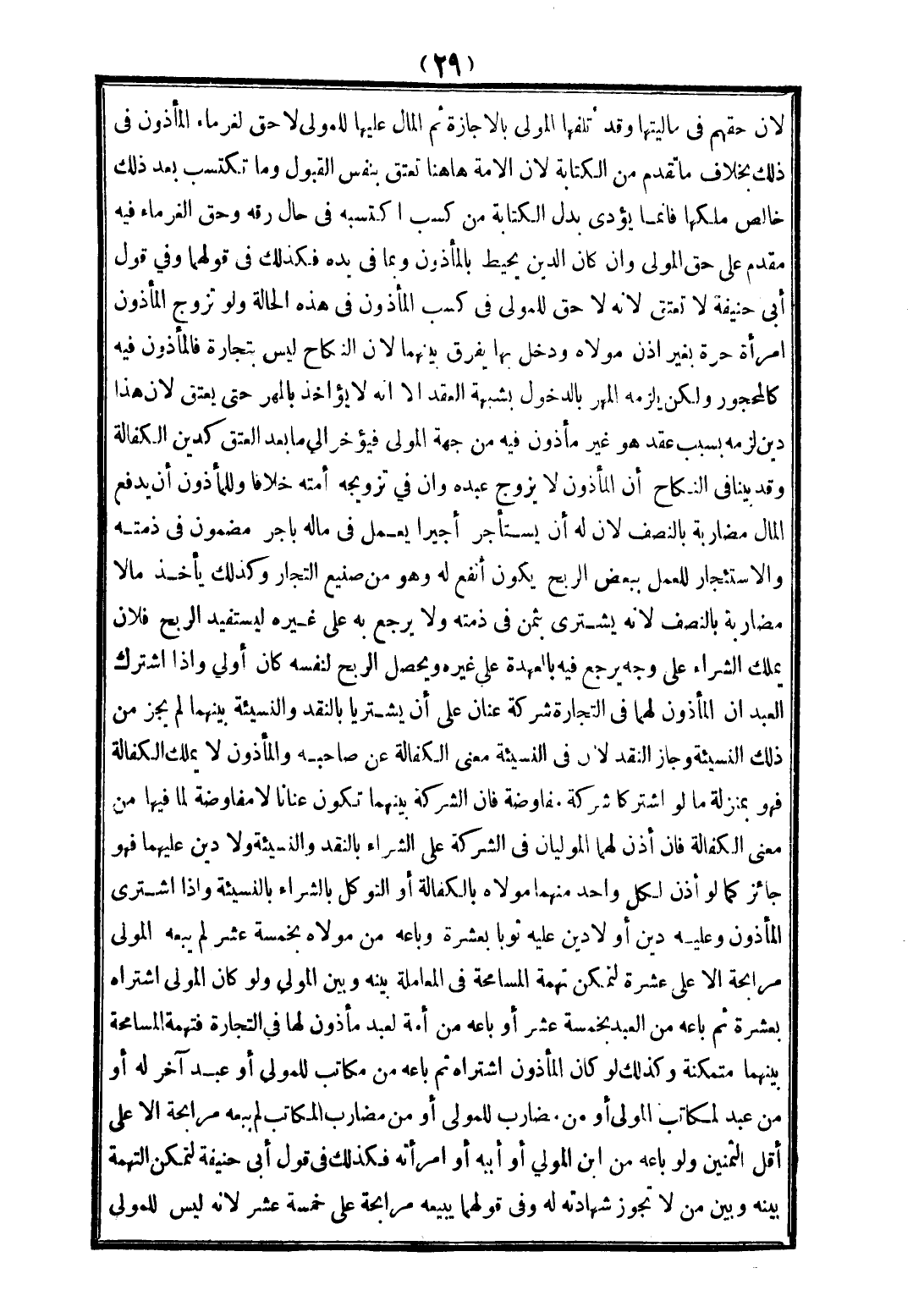 وَلَوْ تَزَوَّجَ الْمَأْذُونُ امْرَأَةً حُرَّةً بِغَيْرِ إذْنِ مَوْلَاهُ وَدَخَلَ بِهَا يُفَرَّقُ بَيْنَهُمَا؛ لِأَنَّ النِّكَاحَ لَيْسَ بِتِجَارَةٍ فَالْمَأْذُونُ فِيهِ كَالْمَحْجُورِ، وَلَكِنْ يَلْزَمُهُ الْمَهْرُ بِالدُّخُولِ بِشُبْهَةِ الْعَقْدِ إلَّا أَنَّهُ لَا يُؤَاخَذُ بِالْمَهْرِ حَتَّى يَعْتِقَ؛ لِأَنَّ هَذَا دَيْنٌ لَزِمَهُ بِسَبَبِ عَقْدٍ هُوَ غَيْرُ مَأْذُونٍ فِيهِ مِنْ جِهَةِ الْمَوْلَى، فَيُؤَخَّرُ إلَى مَا بَعْدَ الْعِتْقِ كَدَيْنِ الْكَفَالَةِ وَقَدْ بَيَّنَّا فِي النِّكَاحِ أَنَّ الْمَأْذُونَ لَا يُزَوِّجُ عَبْدَهُ، وَإِنَّ فِي تَزْوِيجِهِ أَمَتَهُ خِلَافًا، وَلِلْمَأْذُونِ أَنْ يَدْفَعَ الْمَالَ مُضَارَبَةً بِالنِّصْفِ؛ لِأَنَّ لَهُ أَنْ يَسْتَأْجِرَ أَجِيرًا يَعْمَلُ فِي مَالِهِ بِأَجْرٍ مَضْمُونٍ فِي ذِمَّتِهِ، وَالِاسْتِئْجَارُ لِلْعَمَلِ بِبَعْضِ الرِّبْحِ يَكُونُ أَنْفَعُ لَهُ، وَهُوَ مِنْ صَنِيعِ التُّجَّارِ، وَكَذَلِكَ يَأْخُذُ مَالًا مُضَارَبَةً بِالنِّصْفِ؛ لِأَنَّهُ يَشْتَرِي بِثَمَنٍ فِي ذِمَّتِهِ، وَلَا يَرْجِعُ بِهِ عَلَى غَيْرِهِ لِيَسْتَفِيدَ الرِّبْحَ، فَلَأَنْ يَمْلِكَ الشِّرَاءَ عَلَى وَجْهٍ يَرْجِعُ فِيهِ بِالْعُهْدَةِ عَلَى غَيْرِهِ، وَيَحْصُلُ الرِّبْحُ لِنَفْسِهِ كَانَ أَوْلَى.