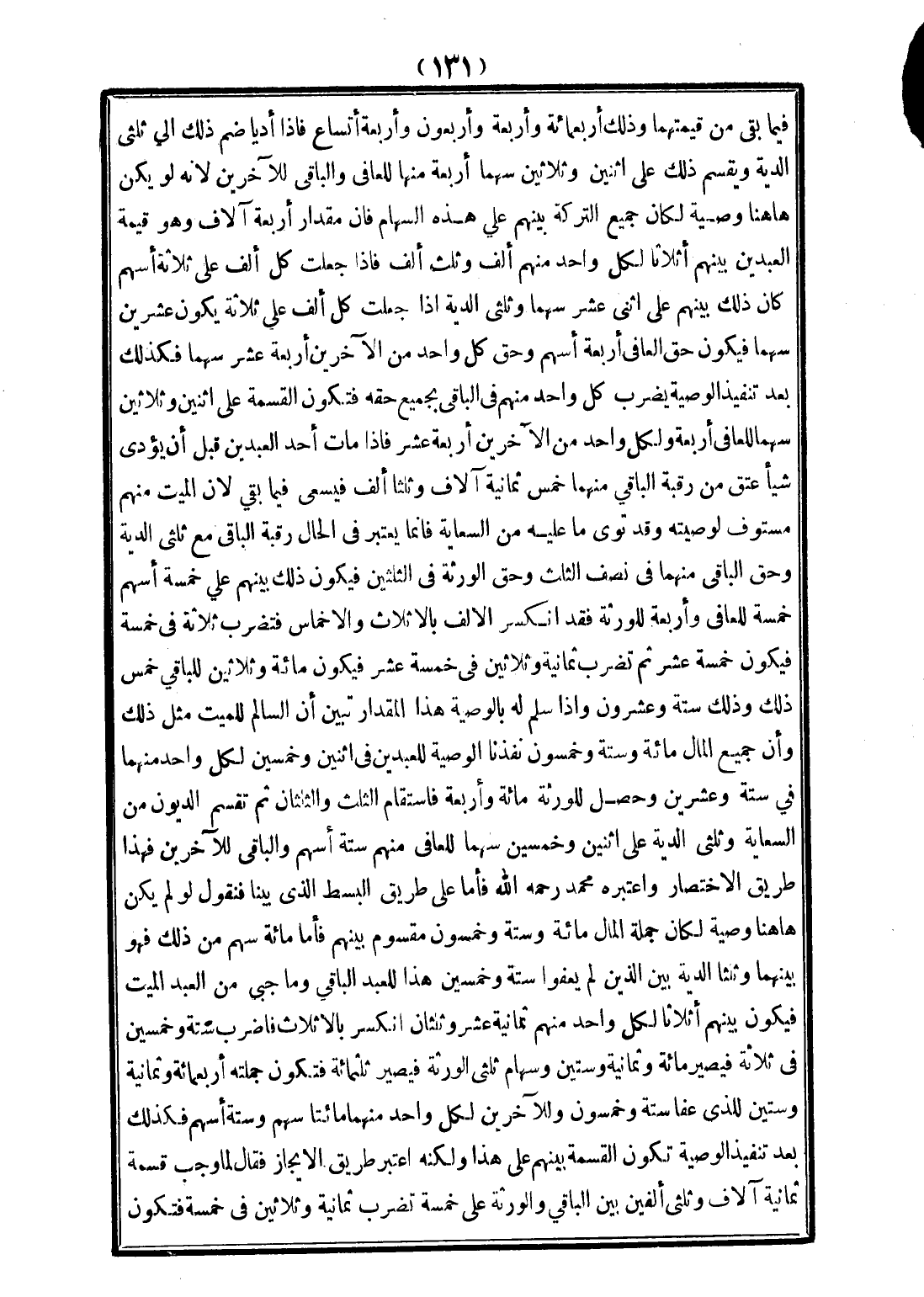 وَإِذَا سَلَّمَ لَهُ بِالْوَصِيَّةِ هَذَا الْمِقْدَارَ تَبَيَّنَ أَنَّ السَّالِمَ لِلْمَيِّتِ مِثْلُ ذَلِكَ، وَأَنَّ جَمِيعَ الْمَالِ مِائَةٌ وَسِتَّةٌ وَخَمْسُونَ نَفَّذْنَا الْوَصِيَّةَ لِلْعَبْدَيْنِ فِي اثْنَيْنِ وَخَمْسِينَ لِكُلِّ وَاحِدٍ مِنْهُمَا فِي سِتَّةٍ وَعِشْرِينَ، وَحَصَلَ لِلْوَرَثَةِ مِائَةٌ وَأَرْبَعَةٌ فَاسْتَقَامَ الثُّلُثُ وَالثُّلُثَانِ ثُمَّ تُقَسَّمُ الدُّيُونُ مِنْ السِّعَايَةِ وَثُلُثَيْ الدِّيَةِ عَلَى اثْنَيْنِ وَخَمْسِينَ سَهْمًا لِلْعَافِي مِنْهُمْ سِتَّةُ أَسْهُمٍ، وَالْبَاقِي لِلْآخَرَيْنِ فَهَذَا طَرِيقُ الِاخْتِصَارِ، وَاعْتَبَرَهُ مُحَمَّدٌ - رَحِمَهُ اللَّهُ - فَأَمَّا عَلَى طَرِيقِ الْبَسْطِ الَّذِي بَيَّنَّا فَنَقُولُ لَوْ لَمْ يَكُنْ هَاهُنَا وَصِيَّةٌ لَكَانَ جُمْلَةُ الْمَالِ مِائَةً وَسِتَّةً وَخَمْسِينَ مَقْسُومٌ بَيْنَهُمْ فَأَمَّا مِائَةُ سَهْمٍ مِنْ ذَلِكَ فَهُوَ بَيْنَهُمَا، وَثُلُثَا الدِّيَةِ بَيْنَ الَّذِينَ لَمْ يَعْفُوَا سِتَّةً وَخَمْسِينَ هَذَا لِلْعَبْدِ الْبَاقِي، وَمَا جُبِيَ مِنْ الْعَبْدِ الْمَيِّتِ فَيَكُونُ بَيْنَهُمْ أَثْلَاثًا لِكُلِّ وَاحِدٍ مِنْهُمْ ثَمَانِيَةَ عَشَرَ وَثُلُثَانِ انْكَسَرَ بِالْأَثْلَاثِ فَاضْرِبْ سِتَّةً وَخَمْسِينَ فِي ثَلَاثَةٍ فَيَصِيرُ مِائَةً وَثَمَانِيَةً وَسِتِّينَ وَسِهَامَ ثُلُثَيْ الْوَرَثَةِ فَيَصِيرُ ثَلَثَمِائَةٍ فَتَكُونُ جُمْلَتُهُ أَرْبَعَمِائَةٍ وَثَمَانِيَةً وَسِتِّينَ لِلَّذِي عَفَا سِتَّةٌ وَخَمْسُونَ، وَلِلْآخَرَيْنِ لِكُلِّ وَاحِدٍ مِنْهُمَا مِائَتَا سَهْمٍ وَسِتَّةٍ أَسْهُمٍ فَكَذَلِكَ بَعْدَ تَنْفِيذِ الْوَصِيَّةِ تَكُونُ الْقِسْمَةُ بَيْنَهُمْ عَلَى هَذَا، وَلَكِنَّهُ اعْتَبَرَ طَرِيقَ الْإِيجَازِ فَقَالَ لَمَّا وَجَبَ قِسْمَةُ ثَمَانِيَةِ آلَافٍ وَثُلُثَيْ أَلْفَيْنِ بَيْنَ الْبَاقِي وَالْوَرَثَةُ عَلَى خَمْسَةٍ تُضْرَبُ ثَمَانِيَةٌ وَثَلَاثِينَ فِي خَمْسَةٍ فَتَكُونُ