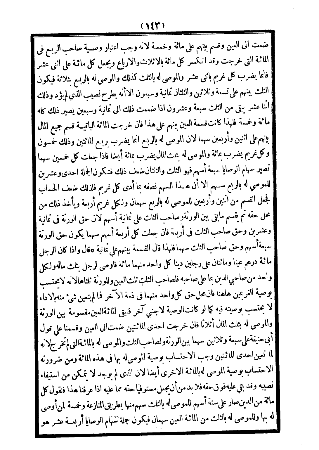 إذَا عَرَفْنَا هَذَا فَنَقُولُ كُلُّ مِائَةٍ مِنْ الدَّيْنِ صَارَ عَلَى سِتَّةِ أَسْهُمٍ لِلْمُوصَى لَهُ بِالثُّلُثِ سَهْمٌ مِنْهَا بِطَرِيقِ الْمُنَازَعَةِ، وَخَمْسَةٌ لِمَنْ أَوْصَى لَهُ بِهَا، وَلِلْمُوصَى لَهُ بِالثُّلُثِ مِنْ الْمِائَةِ الْعَيْنِ سَهْمَانِ فَيَكُونُ جُمْلَةُ سِهَامِ الْوَصَايَا أَرْبَعَةَ عَشَرَ هُوَ