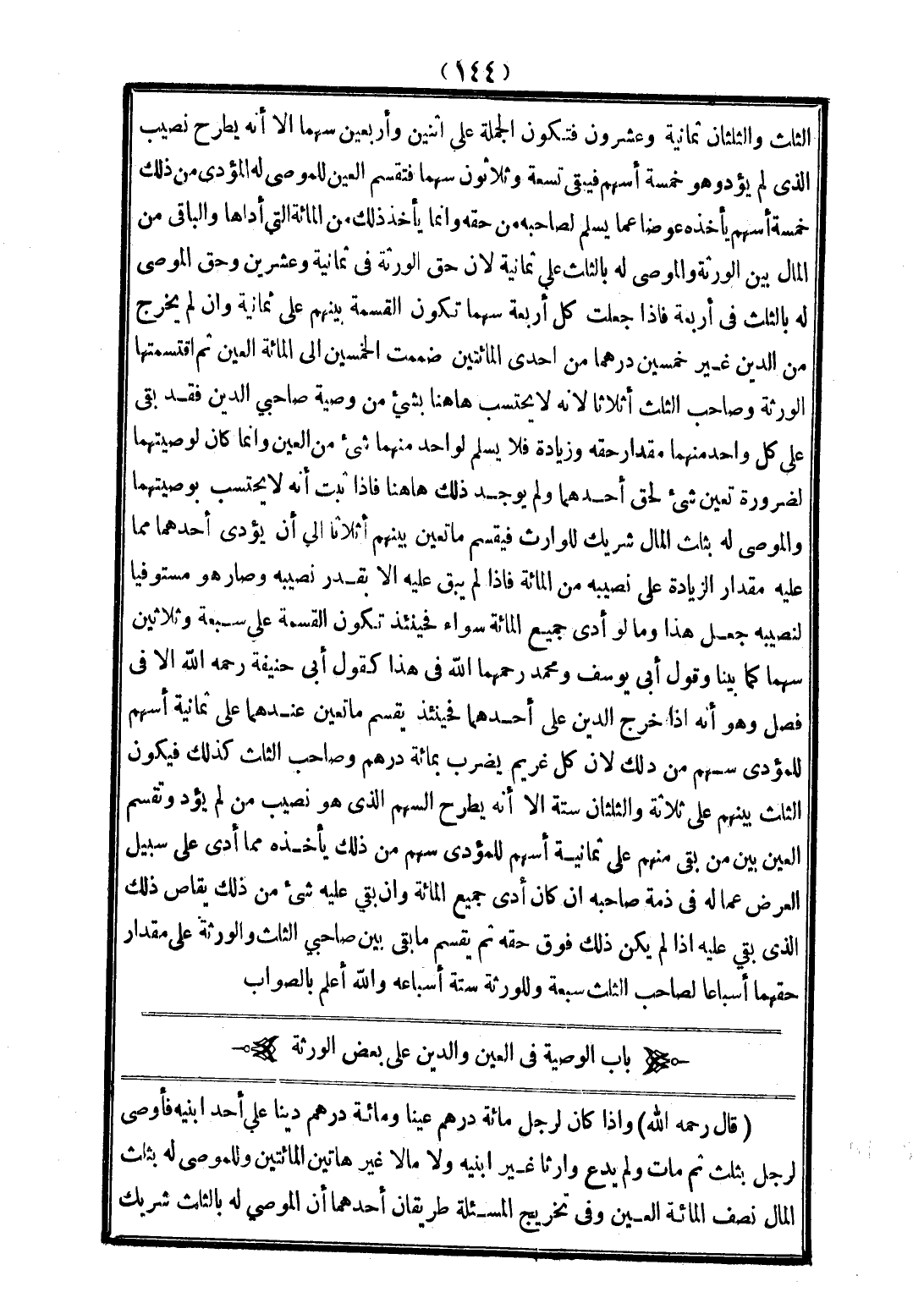 (قَالَ - رَحِمَهُ اللَّهُ -) وَإِذَا كَانَ لِرَجُلٍ مِائَةُ دِرْهَمٍ عَيْنًا وَمِائَةُ دِرْهَمٍ دَيْنًا عَلَى أَحَدِ ابْنَيْهِ فَأَوْصَى لِرَجُلٍ بِثُلُثٍ ثُمَّ مَاتَ وَلَمْ يَدَعْ وَارِثًا غَيْرَ ابْنَيْهِ وَلَا مَالًا غَيْرَ هَاتَيْنِ الْمِائَتَيْنِ وَلِلْمُوصَى لَهُ بِثُلُثِ الْمَالِ نِصْفُ الْمِائَةِ الْعَيْنُ وَفِي تَخْرِيجِ الْمَسْأَلَةِ طَرِيقَانِ أَحَدُهُمَا أَنَّ الْمُوصَى لَهُ بِالثُّلُثِ شَرِيكُ