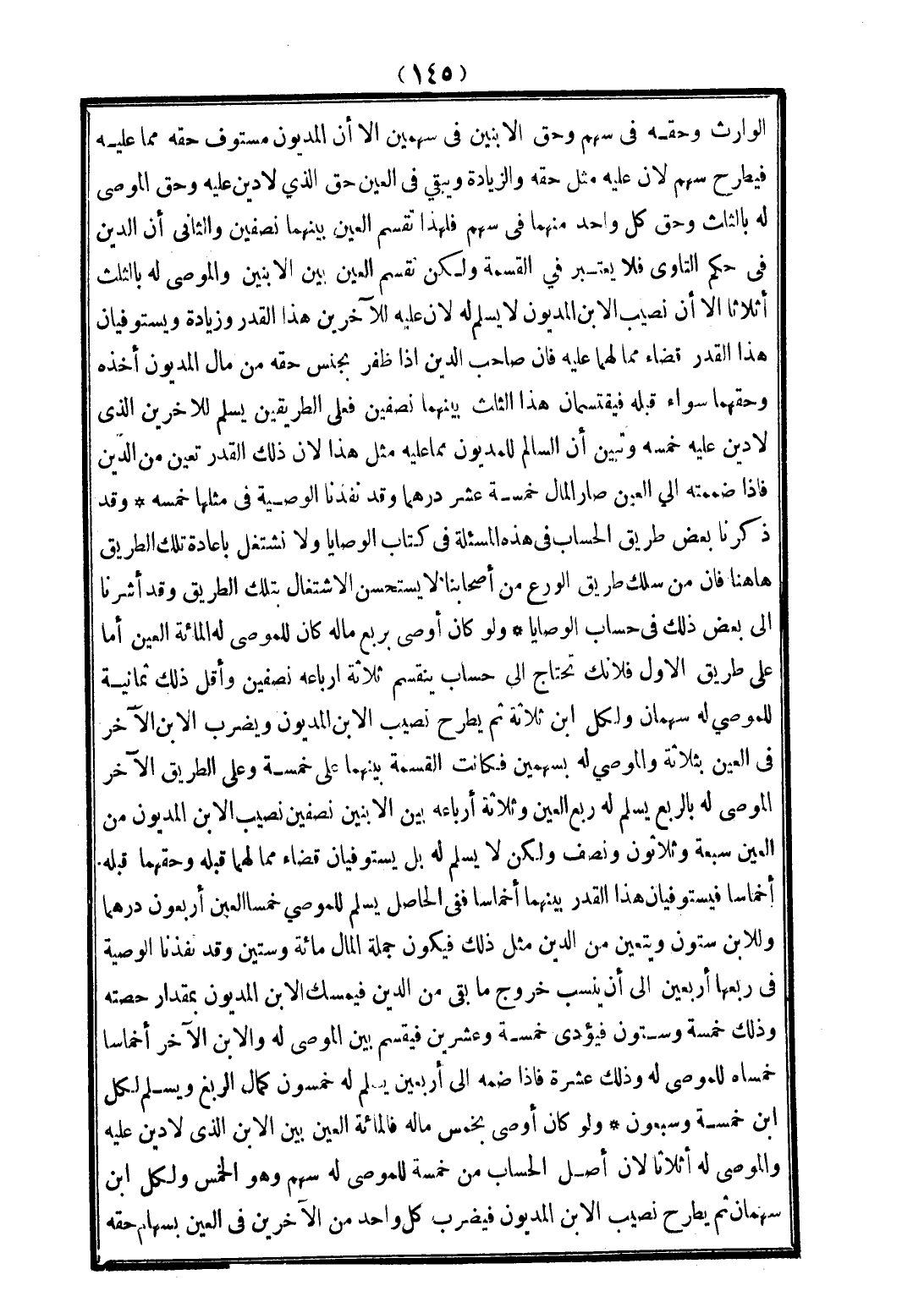 الْوَارِثِ وَحَقُّهُ فِي سَهْمٍ وَحَقُّ الِابْنَيْنِ فِي سَهْمَيْنِ إلَّا أَنَّ الْمَدْيُونَ مُسْتَوْفٍ حَقَّهُ مِمَّا عَلَيْهِ فَيُطْرَحُ سَهْمٌ لِأَنَّ عَلَيْهِ مِثْلَ حَقِّهِ وَالزِّيَادَةَ وَيَبْقَى فِي الْعَيْنِ حَقُّ الَّذِي لَا دَيْنَ عَلَيْهِ وَحَقُّ الْمُوصَى لَهُ بِالثُّلُثِ وَحَقُّ كُلِّ وَاحِدٍ مِنْهُمَا فِي سَهْمٍ فَلِهَذَا تُقْسَمُ الْعَيْنُ بَيْنَهُمَا نِصْفَيْنِ وَالثَّانِي أَنَّ الدَّيْنَ فِي حُكْمِ التَّاوِي فَلَا يُعْتَبَرُ فِي الْقِسْمَةِ وَلَكِنْ تُقْسَمُ الْعَيْنُ بَيْنَ الِابْنَيْنِ وَالْمُوصَى لَهُ بِالثُّلُثِ أَثْلَاثًا إلَّا أَنَّ نَصِيبَ الِابْنِ الْمَدْيُونِ لَا يُسَلَّمُ لَهُ لِأَنَّ عَلَيْهِ لِلْآخَرَيْنِ هَذَا الْقَدْرَ وَزِيَادَةً وَيَسْتَوْفِيَانِ هَذَا الْقَدْرَ قَضَاءً مِمَّا لَهُمَا عَلَيْهِ فَإِنَّ صَاحِبَ الدَّيْنِ إذَا ظَفِرَ بِجِنْسِ حَقِّهِ مِنْ مَالِ الْمَدْيُونِ أَخَذَهُ وَحَقُّهُمَا سَوَاءٌ قَبْلَهُ فَيَقْتَسِمَانِ هَذَا الثُّلُثَ بَيْنَهُمَا نِصْفَيْنِ فَعَلَى الطَّرِيقَيْنِ يُسَلِّمُ لِلْآخَرَيْنِ الَّذِي لَا دَيْنَ عَلَيْهِ خُمُسَهُ وَتَبَيَّنَ أَنَّ السَّالِمَ لِلْمَدْيُونِ مِمَّا عَلَيْهِ مِثْلُ هَذَا لِأَنَّ ذَلِكَ الْقَدْرَ تَعَيَّنَ مِنْ الدَّيْنِ فَإِذَا ضَمَمْته إلَى الْعَيْنِ صَارَ الْمَالُ خَمْسَةَ عَشَرَ دِرْهَمًا وَقَدْ نَفَّذْنَا الْوَصِيَّةَ فِي مِثْلِهَا خَمْسَةٌ وَقَدْ ذَكَرْنَا بَعْضَ طُرُقِ الْحِسَابِ فِي هَذِهِ الْمَسْأَلَةِ فِي كِتَابِ الْوَصَايَا وَلَا نَشْتَغِلُ بِإِعَادَةِ تِلْكَ الطَّرِيقِ هَاهُنَا فَإِنَّ مَنْ سَلَكَ طَرِيقَ الْوَرَعِ مِنْ أَصْحَابِنَا لَا يَسْتَحْسِنُ الِاشْتِغَالَ بِتِلْكَ الطَّرِيقِ وَقَدْ أَشَرْنَا إلَى بَعْضِ ذَلِكَ فِي حِسَابِ الْوَصَايَا.