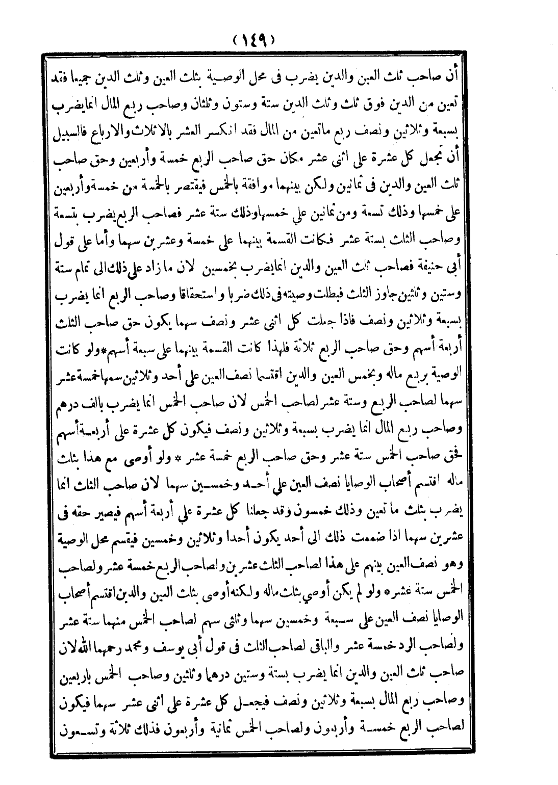 أَنَّ صَاحِبَ ثُلُثِ الْعَيْنِ وَالدَّيْنِ يَضْرِبُ فِي مَحَلِّ الْوَصِيَّةِ بِثُلُثِ الْعَيْنِ وَثُلُثِ الدَّيْنِ جَمِيعًا فَقَدْ تَعَيَّنَ مِنْ الدَّيْنِ فَوْقَ ثُلُثٍ وَثُلُثُ الدَّيْنِ سِتَّةٌ وَسِتُّونَ وَثُلُثَانِ، وَصَاحِبُ رُبْعِ الْمَالِ إنَّمَا يَضْرِبُ بِسَبْعَةٍ وَثَلَاثِينَ وَنِصْفِ رُبْعِ مَا تَعَيَّنَ مِنْ الْمَالِ فَقَدْ انْكَسَرَ الْعُشْرُ بِالْأَثْلَاثِ وَالْأَرْبَاعِ فَالسَّبِيلُ أَنْ تَجْعَلَ كُلَّ عَشَرَةٍ عَلَى اثْنَيْ عَشَرَ مَكَانَ حَقِّ صَاحِبِ الرُّبْعِ خَمْسَةٌ وَأَرْبَعِينَ، وَحَقُّ صَاحِبِ ثُلُثِ الْعَيْنِ وَالدَّيْنِ فِي ثَمَانِينَ، وَلَكِنَّ بَيْنهمَا مُوَافَقَةً بِالْخُمْسِ فَيَقْتَصِرُ بِالْخَمْسَةِ مِنْ خَمْسَةٍ وَأَرْبَعِينَ عَلَى خُمْسِهَا، وَذَلِكَ تِسْعَةٌ، وَمِنْ ثَمَانِينَ عَلَى خُمُسِهَا، وَذَلِكَ سِتَّةَ عَشَرَ فَصَاحِبُ الرُّبْعِ يَضْرِبُ بِتِسْعَةٍ، وَصَاحِبُ الثُّلُثِ بِسِتَّةَ عَشَرَ فَكَانَتْ الْقِسْمَةُ بَيْنَهُمَا عَلَى خَمْسَةٍ وَعِشْرِينَ سَهْمًا، وَأَمَّا عَلَى قَوْلِ أَبِي حَنِيفَةَ فَصَاحِبُ ثُلُثِ الْعَيْنِ وَالدَّيْنِ إنَّمَا يَضْرِبُ بِخَمْسِينَ لِأَنَّ مَا زَادَ عَلَى ذَلِكَ إلَى تَمَامِ سِتَّةٍ وَسِتِّينَ وَثُلُثَيْنِ جَاوَزَ الثُّلُثَ فَبَطَلَتْ وَصِيَّتُهُ فِي ذَلِكَ ضَرْبًا وَاسْتِحْقَاقًا، وَصَاحِبُ الرُّبْعِ إنَّمَا يَضْرِبُ بِسَبْعَةٍ وَثَلَاثِينَ وَنِصْفٍ فَإِذَا جَعَلْت كُلَّ اثْنَيْ عَشَرَ وَنِصْفٍ سَهْمًا يَكُونُ حَقُّ صَاحِبِ الثُّلُثِ أَرْبَعَةَ أَسْهُمٍ، وَحَقَّ صَاحِبِ الرُّبْعِ ثَلَاثَةً فَلِهَذَا كَانَتْ الْقِسْمَةُ بَيْنَهُمَا عَلَى سَبْعَةِ أَسْهُمٍ.