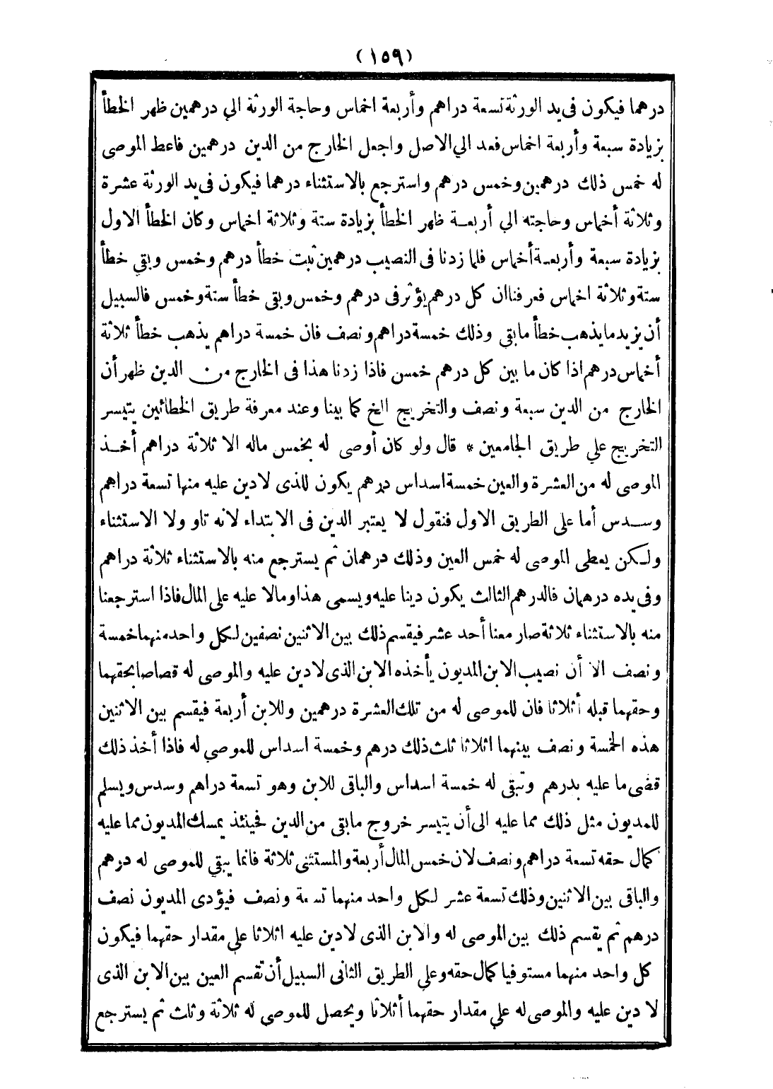 دِرْهَمًا فَيَكُونُ فِي يَدِ الْوَرَثَةِ تِسْعَةُ دَرَاهِمَ وَأَرْبَعَةُ أَخْمَاسٍ، وَحَاجَةُ الْوَرَثَةِ إلَى دِرْهَمَيْنِ ظَهَرَ الْخَطَأُ بِزِيَادَةِ سَبْعَةٍ وَأَرْبَعَةِ أَخْمَاسٍ فَعُدْ إلَى الْأَصْلِ وَاجْعَلْ الْخَارِجَ مِنْ الدَّيْنِ دِرْهَمَيْنِ فَأَعْطِ الْمُوصَى لَهُ خُمُسَ ذَلِكَ دِرْهَمَيْنِ وَخُمُسَ دِرْهَمٍ وَاسْتَرْجِعْ بِالِاسْتِثْنَاءِ دِرْهَمًا فَيَكُونُ فِي يَدِ الْوَرَثَةِ عَشَرَةٌ وَثَلَاثَةُ أَخْمَاسٍ، وَحَاجَتُهُ إلَى أَرْبَعَةٍ ظَهَرَ الْخَطَأُ بِزِيَادَةِ سِتَّةٍ وَثَلَاثَةِ أَخْمَاسٍ، وَكَانَ الْخَطَأُ الْأَوَّلُ بِزِيَادَةِ سَبْعَةٍ وَأَرْبَعَةِ أَخْمَاسٍ فَلَمَّا زِدْنَا فِي النَّصِيبِ دِرْهَمَيْنِ ثَبَتَ خَطَأُ دِرْهَمٍ وَخُمُسٍ، وَبَقِيَ خَطَأُ سِتَّةٍ وَثَلَاثَةِ أَخْمَاسٍ فَعَرَفْنَا أَنَّ كُلَّ دِرْهَمٍ يُؤَثِّرُ فِي دِرْهَمٍ وَخُمُسٍ، وَبَقِيَ خَطَأُ سِتَّةٍ وَخُمُسٍ فَالسَّبِيلُ أَنْ يَزِيدَ مَا يُذْهِبُ خَطَأً مَا بَقِيَ، وَذَلِكَ خَمْسَةُ دَرَاهِمَ وَنِصْفٌ فَإِنَّ خَمْسَةَ دَرَاهِمَ يُذْهِبُ خَطَأَ ثَلَاثَةِ أَخْمَاسِ دِرْهَمٍ إذَا كَانَ مَا بَيْنَ كُلِّ دِرْهَمٍ خُمُسٌ فَإِذَا زِدْنَا هَذَا فِي الْخَارِجِ مِنْ الدَّيْنِ ظَهَرَ أَنَّ الْخَارِجَ مِنْ الدَّيْنِ سَبْعَةٌ وَنِصْفٌ وَالتَّخْرِيجُ إلَخْ كَمَا بَيَّنَّا.