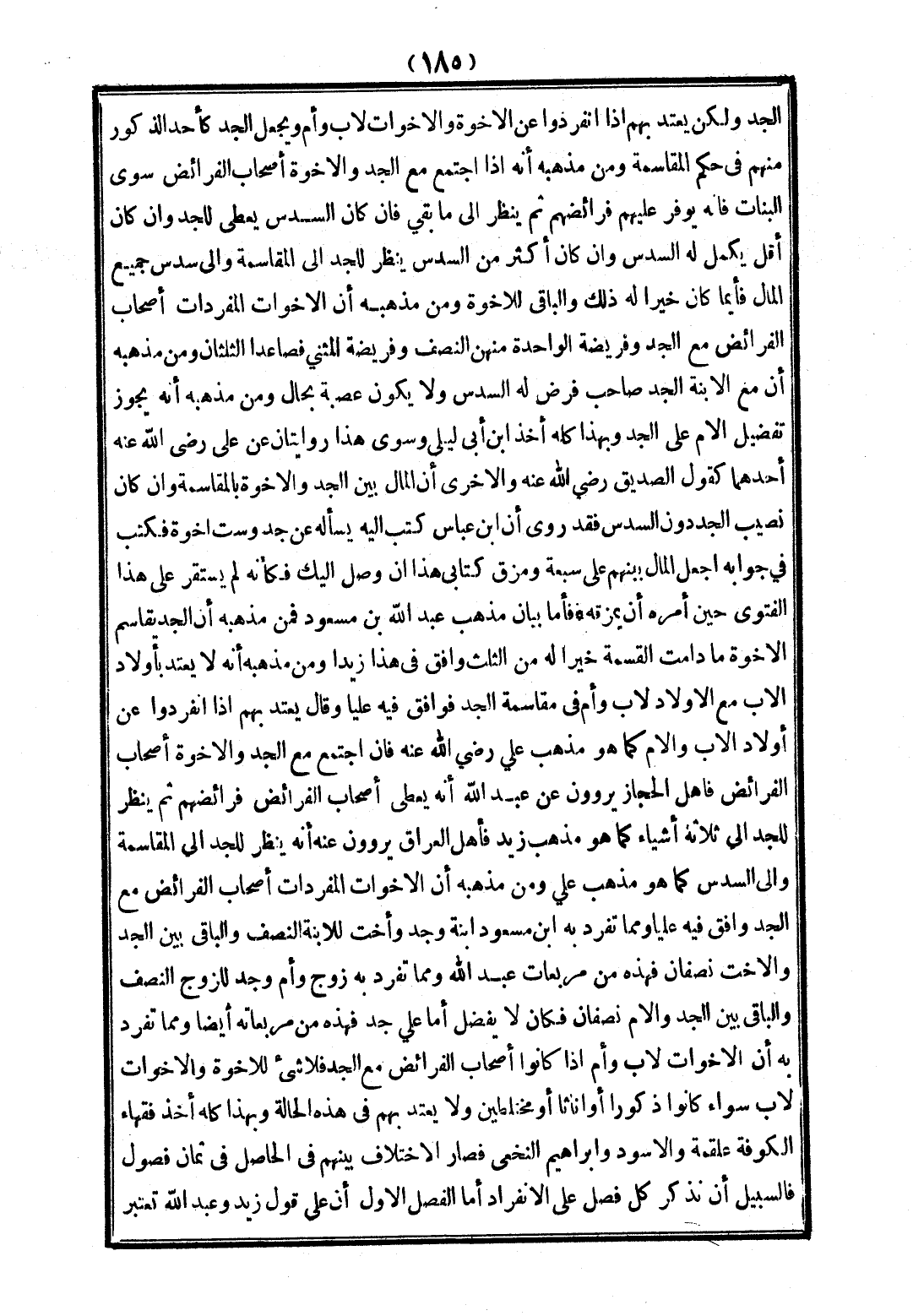 وَمِمَّا تَفَرَّدَ بِهِ زَوْجٌ وَأُمٌّ وَجَدٌّ لِلزَّوْجِ النِّصْفُ وَالْبَاقِي بَيْنَ الْجَدِّ وَالْأُمِّ نِصْفَانِ فَكَانَ لَا يُفَضِّلُ أُمًّا عَلَى جَدٍّ فَهَذِهِ مِنْ مُرَبَّعَاتِهِ أَيْضًا وَمِمَّا تَفَرَّدَ بِهِ أَنَّ الْأَخَوَاتِ لِأَبٍ وَأُمٍّ إذَا كَانُوا أَصْحَابَ الْفَرَائِضِ مَعَ الْجَدِّ فَلَا شَيْءَ لِلْإِخْوَةِ وَالْأَخَوَاتِ لِأَبٍ سَوَاءٌ كَانُوا ذُكُورًا، أَوْ إنَاثًا أَوْ مُخْتَلِطِينَ، وَلَا يَعْتَدُّ بِهِمْ فِي هَذِهِ الْحَالَةِ وَبِهَذَا كُلِّهِ أَخَذَ فُقَهَاءُ الْكُوفَةِ عَلْقَمَةُ وَالْأَسْوَدُ وَإِبْرَاهِيمُ النَّخَعِيُّ فَصَارَ الِاخْتِلَافُ بَيْنَهُمْ فِي الْحَاصِلِ فِي ثَمَانِ فُصُولٍ فَالسَّبِيلُ أَنْ نَذْكُرَ كُلَّ فَصْلٍ عَلَى الِانْفِرَادِ أَمَّا الْفَصْلُ الْأَوَّلُ أَنَّ عَلَى قَوْلِ زَيْدٍ وَعَبْدِ اللَّهِ تُعْتَبَرُ