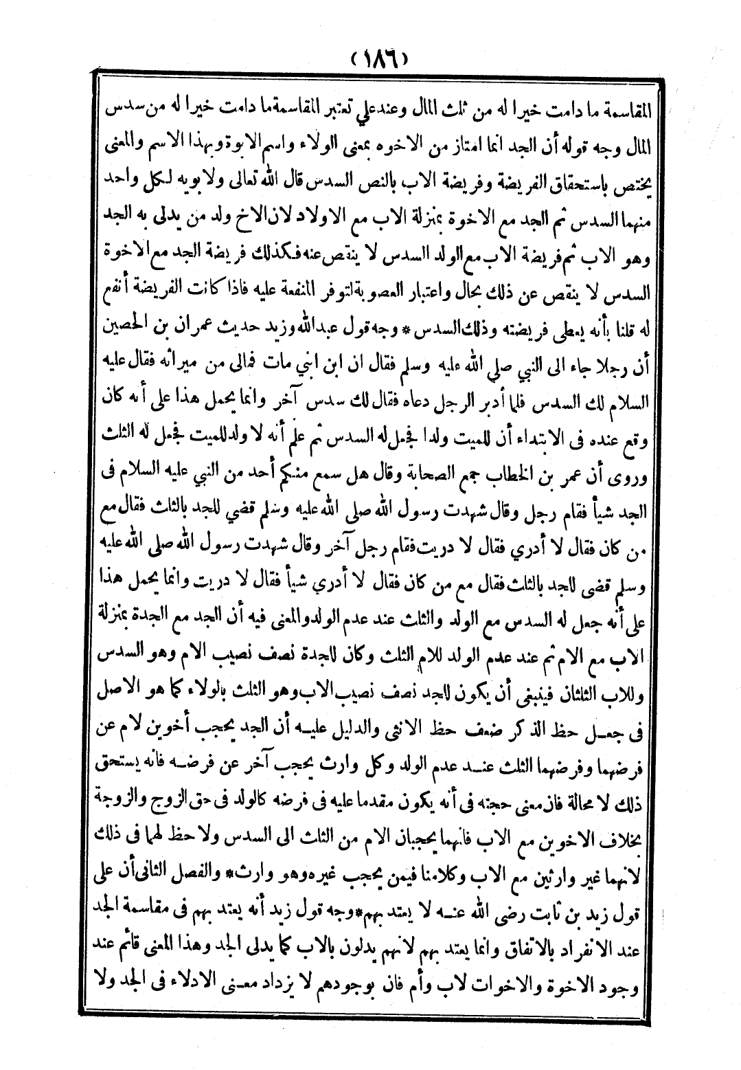 الْمُقَاسَمَةُ مَا دَامَتْ خَيْرًا لَهُ مِنْ ثُلُثِ الْمَالِ، وَعِنْدَ عَلِيٍّ تُعْتَبَرُ الْمُقَاسَمَةُ مَا دَامَتْ خَيْرًا لَهُ مِنْ سُدُسِ الْمَالِ وَجْهُ قَوْلِهِ أَنَّ الْجَدَّ إنَّمَا امْتَازَ مِنْ الْإِخْوَةِ بِمَعْنَى الْوَلَاءِ وَاسْمِ الْأُبُوَّةِ وَبِهَذَا الِاسْمِ وَالْمَعْنَى يَخْتَصُّ بِاسْتِحْقَاقِ الْفَرِيضَةِ وَفَرِيضَةُ الْأَبِ بِالنَّصِّ السُّدُسُ قَالَ اللَّهُ تَعَالَى {وَلِأَبَوَيْهِ لِكُلِّ وَاحِدٍ مِنْهُمَا السُّدُسُ} [النساء: 11]، ثُمَّ الْجَدُّ مَعَ الْإِخْوَةِ بِمَنْزِلَةِ الْأَبِ مَعَ الْأَوْلَادِ لِأَنَّ الْأَخَ وَلَدُ مَنْ يُدْلِي بِهِ الْجَدُّ وَهُوَ الْأَبُ، ثُمَّ فَرِيضَةُ الْأَبِ مَعَ الْوَلَدِ السُّدُسُ لَا يَنْقُصُ عَنْهُ فَكَذَلِكَ فَرِيضَةُ الْجَدِّ مَعَ الْإِخْوَةِ السُّدُسُ لَا يَنْقُصُ عَنْ ذَلِكَ بِحَالٍ وَاعْتِبَارُ الْعُصُوبَةِ لِتُوَفِّرَ الْمَنْفَعَةَ عَلَيْهِ. فَإِذَا كَانَتْ الْفَرِيضَةُ أَنْفَعَ لَهُ قُلْنَا بِأَنَّهُ يُعْطَى فَرِيضَتَهُ، وَذَلِكَ السُّدُسُ وَجْهُ قَوْلِ عَبْدِ اللَّهِ وَزَيْدٍ حَدِيثُ عِمْرَانَ بْنِ الْحُصَيْنِ «أَنَّ رَجُلًا جَاءَ إلَى النَّبِيِّ - صَلَّى اللَّهُ عَلَيْهِ وَسَلَّمَ - فَقَالَ إنَّ ابْنِي مَاتَ فَمَا لِي مِنْ مِيرَاثِهِ فَقَالَ - عَلَيْهِ السَّلَامُ - لَك السُّدُسُ فَلَمَّا أَدْبَرَ الرَّجُلُ دَعَاهُ فَقَالَ لَك سُدُسٌ آخَرُ».