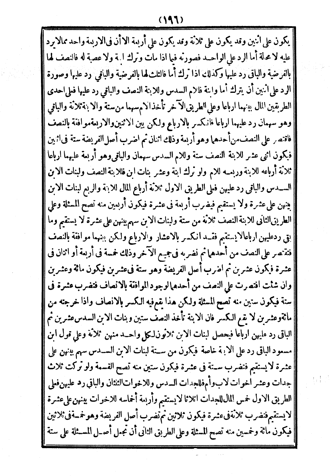 وَلَوْ تَرَكَ ابْنَةً وَعَشْرَ بَنَاتِ ابْنٍ فَلِلِابْنَةِ النِّصْفُ وَلِبَنَاتِ الِابْنِ السُّدُسُ وَالْبَاقِي رَدٌّ عَلَيْهِنَّ فَعَلَى الطَّرِيقِ الْأَوَّلِ ثَلَاثَةُ أَرْبَاعِ الْمَالِ لِلِابْنَةِ وَالرُّبُعُ لِبَنَاتِ الِابْنِ بَيْنَهُنَّ عَلَى عَشَرَةٍ، وَلَا يَسْتَقِيمُ فَيَضْرِبُ أَرْبَعَةً فِي عَشَرَةٍ فَيَكُونُ أَرْبَعِينَ مِنْهُ تَصِحُّ الْمَسْأَلَةُ وَعَلَى الطَّرِيقِ الثَّانِي لِلِابْنَةِ النِّصْفُ ثَلَاثَةٌ مِنْ سِتَّةٍ وَلِبَنَاتِ الِابْنِ سَهْمٌ بَيْنَهُنَّ عَلَى عَشَرَةٍ لَا يَسْتَقِيمُ، وَمَا بَقِيَ رَدٌّ عَلَيْهِنَّ أَرْبَاعًا لَا يَسْتَقِيمُ فَقَدْ انْكَسَرَ بِالْأَعْشَارِ وَالْأَرْبَاعِ، وَلَكِنْ بَيْنَهُمَا مُوَافَقَةٌ بِالنِّصْفِ فَتَقْتَصِرُ عَلَى النِّصْفِ مِنْ أَحَدِهِمَا، ثُمَّ نَضْرِبُهُ فِي جَمِيعِ الْآخَرِ، وَذَلِكَ خَمْسَةٌ فِي أَرْبَعَةٍ أَوْ اثْنَانِ فِي عَشَرَةٍ فَيَكُونُ عِشْرِينَ، ثُمَّ اضْرِبْ أَصْلَ الْفَرِيضَةِ وَهُوَ سِتَّةٌ فِي عِشْرِينَ فَيَكُونُ مِائَةً وَعِشْرِينَ، وَإِنْ شِئْت اقْتَصَرَتْ عَلَى النِّصْفِ مِنْ أَحَدِهِمَا لِوُجُودِ الْمُوَافَقَةِ بِالْإِنْصَافِ فَتَضْرِبُ عَشَرَةً فِي سِتَّةٍ فَيَكُونُ سِتِّينَ مِنْهُ تَصِحُّ الْمَسْأَلَةُ، وَلَكِنَّ هَذَا يَقَعُ فِيهِ الْكَسْرُ بِالْأَنْصَافِ.