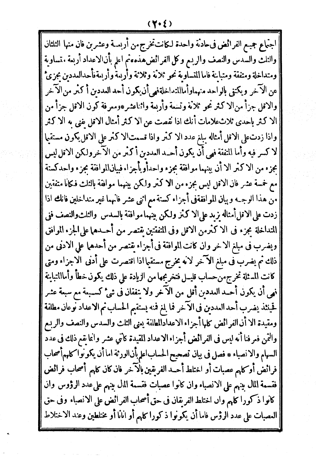 اجْتِمَاعُ جَمِيعِ الْفَرَائِضِ فِي حَادِثَةٍ وَاحِدَةٍ لَكَانَتْ تُخَرَّجُ مِنْ أَرْبَعَةٍ وَعِشْرِينَ فَإِنَّ مِنْهَا الثُّلُثَيْنِ وَالثُّلُثَ وَالسُّدُسَ وَالنِّصْفَ وَالرُّبُعَ وَكُلَّ الْفَرَائِضِ هَذِهِ، ثُمَّ اعْلَمْ بِأَنَّ الْأَعْدَادَ أَرْبَعَةٌ مُتَسَاوِيَةٌ وَمُتَدَاخِلَةٌ وَمُتَّفِقَةٌ وَمُتَبَايِنَةٌ. فَأَمَّا الْمُتَسَاوِيَةُ نَحْوَ ثَلَاثَةٍ وَثَلَاثَةٍ وَأَرْبَعَةٍ وَأَرْبَعَةٍ فَأَحَدُ الْعَدَدَيْنِ يُجْزِئُ عَنْ الْآخَرِ وَيُكْتَفَى بِالْوَاحِدِ مِنْهُمَا وَأَمَّا الْمُتَدَاخِلَةُ فَهِيَ أَنْ يَكُونَ أَحَدُ الْعَدَدَيْنِ أَكْثَرَ مِنْ الْآخَرِ وَالْأَقَلُّ جُزْءًا مِنْ الْأَكْثَرِ نَحْوَ ثَلَاثَةٍ وَتِسْعَةٍ وَأَرْبَعَةٍ وَاثْنَا عَشَرَ وَمَعْرِفَةُ كَوْنِ الْأَقَلِّ جُزْءًا مِنْ الْأَكْثَرِ بِإِحْدَى ثَلَاثِ عَلَامَاتٍ أَنَّك إذَا نَقَصْت عَنْ الْأَكْثَرِ أَمْثَالَ الْأَقَلِّ يُفْنَى بِهِ الْأَكْثَرُ وَإِذَا زِدْت عَلَى الْأَقَلِّ أَمْثَالَهُ يَبْلُغُ عَدَدُ الْأَكْثَرِ.