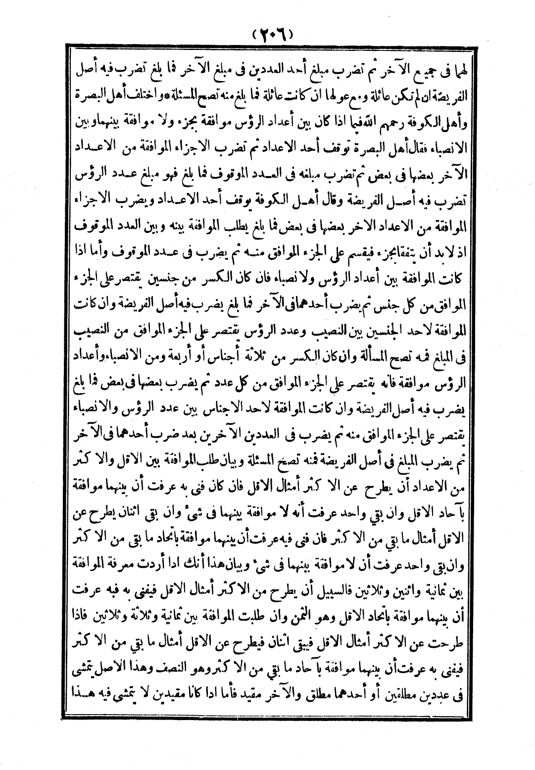 وَبَيَانُ هَذَا أَنَّك إذَا أَرَدْت مَعْرِفَةَ الْمُوَافَقَةِ بَيْنَ ثَمَانِيَةٍ وَاثْنَيْنِ وَثَلَاثِينَ فَالسَّبِيلُ أَنْ يُطْرَحَ مِنْ الْأَكْثَرِ أَمْثَالُ الْأَقَلِّ فَيَفْنَى بِهِ فَبِهِ عَرَفْت أَنَّ بَيْنَهُمَا مُوَافَقَةً بِاتِّحَادِ الْأَقَلِّ وَهُوَ الثُّمُنُ إنْ طَلَبْت الْمُوَافَقَةَ بَيْنَ ثَمَانِيَةٍ وَثَلَاثَةٍ وَثَلَاثِينَ فَإِذَا طَرَحْت عَنْ الْأَكْثَرِ أَمْثَالَ الْأَقَلِّ فَيَبْقَى اثْنَانِ فَيُطْرَحُ عَنْ الْأَقَلِّ أَمْثَالُ مَا بَقِيَ مِنْ الْأَكْثَرِ فَيَفْنَى بِهِ عَرَفْت أَنَّ بَيْنَهُمَا مُوَافَقَةً بِآحَادِ مَا بَقِيَ مِنْ الْأَكْثَرِ وَهُوَ النِّصْفُ، وَهَذَا الْأَصْلُ يَتَمَشَّى فِي عَدَدَيْنِ مُطْلَقِينَ، أَوْ أَحَدُهُمَا مُطْلَقٌ وَالْآخَرُ مُقَيَّدً. فَأَمَّا إذَا كَانَا مُقَيَّدَيْنِ لَا يَتَمَشَّى فِيهِ هَذَا