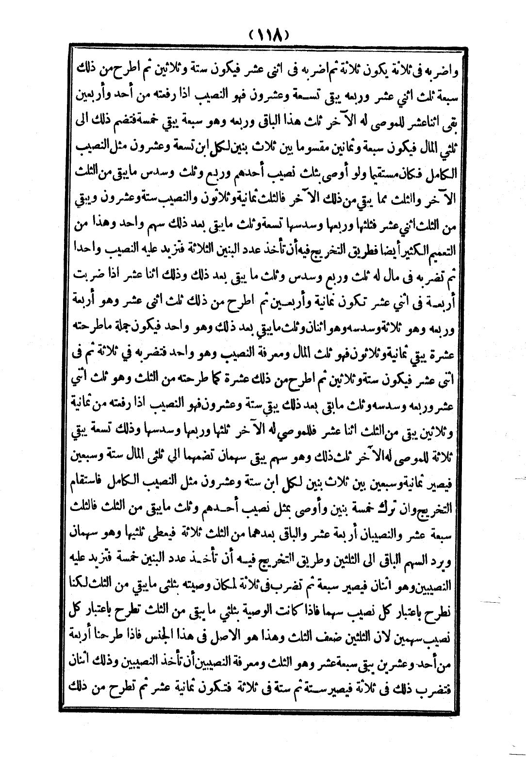 وَاضْرِبْهُ فِي ثَلَاثَةٍ يَكُونُ ثَلَاثَةً ثُمَّ اضْرِبْهُ فِي اثْنَيْ عَشَرَ فَيَكُونُ سِتَّةً وَثَلَاثِينَ، ثُمَّ اطْرَحْ مِنْ ذَلِكَ سَبْعَةً ثُلُثَ اثْنَيْ عَشَرَ وَرُبُعَهُ؛ يَبْقَى تِسْعَةٌ وَعِشْرُونَ فَهُوَ النَّصِيبُ إذَا رَفَعْتَهُ مِنْ أَحَدٍ وَأَرْبَعِينَ بَقِيَ اثْنَا عَشَرَ لِلْمُوصَى لَهُ الْآخَرِ ثُلُثُ هَذَا الْبَاقِي وَرُبُعُهُ وَهُوَ سَبْعَةٌ يَبْقَى خَمْسَةً فَتَضُمُّ ذَلِكَ إلَى ثُلُثَيْ الْمَالِ فَيَكُونُ سَبْعَةً وَثَمَانِينَ مَقْسُومًا بَيْنَ ثَلَاثِ بَنِينَ لِكُلِّ ابْنٍ تِسْعَةٌ وَعِشْرُونَ مِثْلُ النَّصِيبِ الْكَامِلِ فَكَانَ مُسْتَقِيمًا وَلَوْ أَوْصَى بِثُلُثِ نَصِيبِ أَحَدِهِمْ وَرُبُعِ وَثُلُثِ وَسُدُسِ مَا يَبْقَى مِنْ الثُّلُثِ الْآخَرِ وَالثُّلُثُ مِمَّا يَبْقَى مِنْ ذَلِكَ الْآخَرِ فَالثُّلُثُ ثَمَانِيَةٌ وَثَلَاثُونَ وَالنَّصِيبُ سِتَّةٌ وَعِشْرُونَ وَيَبْقَى مِنْ الثُّلُثِ اثْنَيْ عَشَرَ فَثُلُثُهَا وَرُبُعُهَا وَسُدُسُهَا تِسْعَةٌ وَثُلُثُ مَا يَبْقَى بَعْدَ ذَلِكَ سَهْمٌ وَاحِدٌ وَهَذَا مِنْ التَّعْمِيمِ الْكَثِيرِ أَيْضًا فَطَرِيقُ التَّخْرِيجِ فِيهِ أَنْ تَأْخُذَ عَدَدَ الْبَنِينَ الثَّلَاثَةِ فَتَزِيدَ عَلَيْهِ النَّصِيبَ وَاحِدًا، ثُمَّ تَضْرِبَهُ فِي مَالٍ لَهُ ثُلُثُ وَرُبُعُ وَسُدُسُ وَثُلُثُ مَا يَبْقَى بَعْدَ ذَلِكَ وَذَلِكَ اثْنَا عَشَرَ إذَا ضَرَبْتَ أَرْبَعَةً فِي اثْنَيْ عَشَرَ تَكُونُ ثَمَانِيَةً وَأَرْبَعِينَ، ثُمَّ اطْرَحْ مِنْ ذَلِكَ ثُلُثَ اثْنَيْ عَشَرَ وَهُوَ أَرْبَعَةٌ، وَرُبُعَهُ وَهُوَ ثَلَاثَةٌ، وَسُدُسَهُ وَهُوَ اثْنَانِ، وَثُلُثَ مَا يَبْقَى بَعْدَ ذَلِكَ وَهُوَ وَاحِدٌ فَيَكُونَ جُمْلَةَ مَا طَرَحْتَهُ عَشَرَةً يَبْقَى ثَمَانِيَةً وَثَلَاثُونَ فَهُوَ ثُلُثُ الْمَالِ وَمَعْرِفَةُ النَّصِيبِ وَهُوَ وَاحِدٌ فَتَضْرِبُهُ فِي ثَلَاثَةٍ ثُمَّ فِي اثْنَيْ عَشَرَ فَيَكُونُ سِتَّةً وَثَلَاثِينَ ثُمَّ اطْرَحْ مِنْ ذَلِكَ عَشَرَةً كَمَا طَرَحْتَهُ مِنْ الثُّلُثِ وَهُوَ ثُلُثُ اثْنَيْ عَشَرَ وَرُبُعُهُ وَسُدُسُهُ وَثُلُثُ مَا بَقِيَ بَعْدَ ذَلِكَ يَبْقَى سِتَّةٌ وَعِشْرُونَ فَهُوَ النَّصِيبُ إذَا رَفَعْتَهُ مِنْ ثَمَانِيَةٍ وَثَلَاثِينَ يَبْقَى مِنْ الثُّلُثِ اثْنَا عَشَرَ فَلِلْمُوصَى لَهُ الْآخَرِ ثُلُثُهَا وَرُبُعُهَا وَسُدُسُهَا وَذَلِكَ تِسْعَةٌ يَبْقَى ثَلَاثَةٌ لِلْمُوصَى لَهُ الْآخَرِ ثُلُثُ ذَلِكَ وَهُوَ سَهْمٌ يَبْقَى سَهْمَانِ تَضُمُّهُمَا إلَى ثُلُثَيْ الْمَالِ سِتَّةً وَسَبْعِينَ فَيَصِيرُ ثَمَانِيَةً وَسَبْعِينَ بَيْنَ ثَلَاثِ بَنِينَ لِكُلِّ ابْنٍ سِتَّةٌ وَعِشْرُونَ مِثْلُ النَّصِيبِ الْكَامِلِ فَاسْتَقَامَ التَّخْرِيجُ.