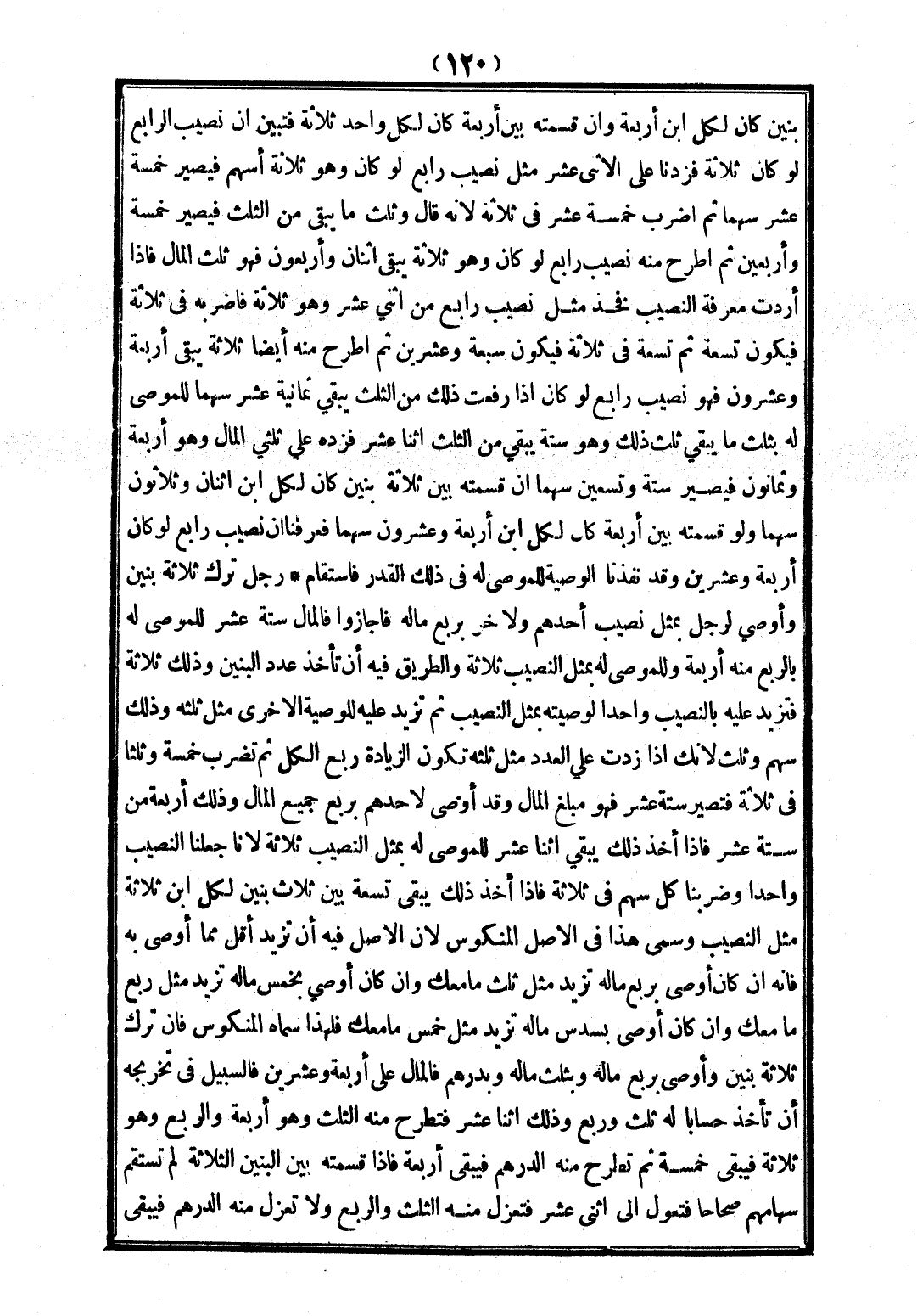 بَنِينَ؛ كَانَ لِكُلِّ ابْنٍ أَرْبَعَةٌ وَإِنْ قَسَمْتَهُ بَيْنَ أَرْبَعَةٍ؛ كَانَ لِكُلِّ وَاحِدٍ ثَلَاثَةٌ فَتَبَيَّنَ أَنَّ نَصِيبَ الرَّابِعِ لَوْ كَانَ ثَلَاثَةٌ فَزِدْنَا عَلَى الِاثْنَيْ عَشَرَ مِثْلَ نَصِيبِ رَابِعٍ لَوْ كَانَ وَهُوَ ثَلَاثَةُ أَسْهُمٍ فَيَصِيرُ خَمْسَةَ عَشَرَ سَهْمًا، ثُمَّ اضْرِبْ خَمْسَةَ عَشَرَ فِي ثَلَاثَةٍ؛ لِأَنَّهُ قَالَ: وَثُلُثُ مَا يَبْقَى مِنْ الثُّلُثِ؛ فَيَصِيرَ خَمْسَةً وَأَرْبَعِينَ ثُمَّ اطْرَحْ مِنْهُ نَصِيبَ رَابِعٍ لَوْ كَانَ وَهُوَ ثَلَاثَةٌ يَبْقَى اثْنَانِ وَأَرْبَعُونَ فَهُوَ ثُلُثُ الْمَالِ فَإِذَا أَرَدْتَ مَعْرِفَةَ النَّصِيبِ فَخُذْ مِثْلَ نَصِيبِ رَابِعٍ مِنْ اثْنَيْ عَشَرَ وَهُوَ ثَلَاثَةٌ فَاضْرِبْهُ فِي ثَلَاثَةٍ فَيَكُونَ تِسْعَةً ثُمَّ تِسْعَةً فِي ثَلَاثَةٍ فَيَكُونَ سَبْعَةً وَعِشْرِينَ ثُمَّ اطْرَحْ مِنْهُ أَيْضًا ثَلَاثَةً يَبْقَى أَرْبَعَةٌ وَعِشْرُونَ فَهُوَ نَصِيبُ رَابِعٍ لَوْ كَانَ إذَا رَفَعْتَ ذَلِكَ مِنْ الثُّلُثِ يَبْقَى ثَمَانِيَةَ عَشَرَ سَهْمًا لِلْمُوصَى لَهُ بِثُلُثِ مَا يَبْقَى ثُلُثُ ذَلِكَ وَهُوَ سِتَّةٌ يَبْقَى مِنْ الثُّلُثِ اثْنَا عَشَرَ فَزِدْهُ عَلَى ثُلُثَيْ الْمَالِ وَهُوَ أَرْبَعَةٌ وَثَمَانُونَ فَيَصِيرَ سِتَّةً وَتِسْعِينَ سَهْمًا إنْ قَسَّمْتَهُ بَيْنَ ثَلَاثَةِ بَنِينَ؛ كَانَ لِكُلِّ ابْنٍ اثْنَانِ وَثَلَاثُونَ سَهْمًا وَلَوْ قَسَّمْتَهُ بَيْنَ أَرْبَعَةٍ كَانَ لِكُلِّ ابْنٍ أَرْبَعَةٌ وَعِشْرُونَ سَهْمًا فَعَرَفْنَا أَنَّ نَصِيبَ رَابِعٍ لَوْ كَانَ أَرْبَعَةٌ وَعِشْرِينَ وَقَدْ نَفَّذْنَا الْوَصِيَّةَ لِلْمُوصَى لَهُ فِي ذَلِكَ الْقَدْرِ فَاسْتَقَامَ.