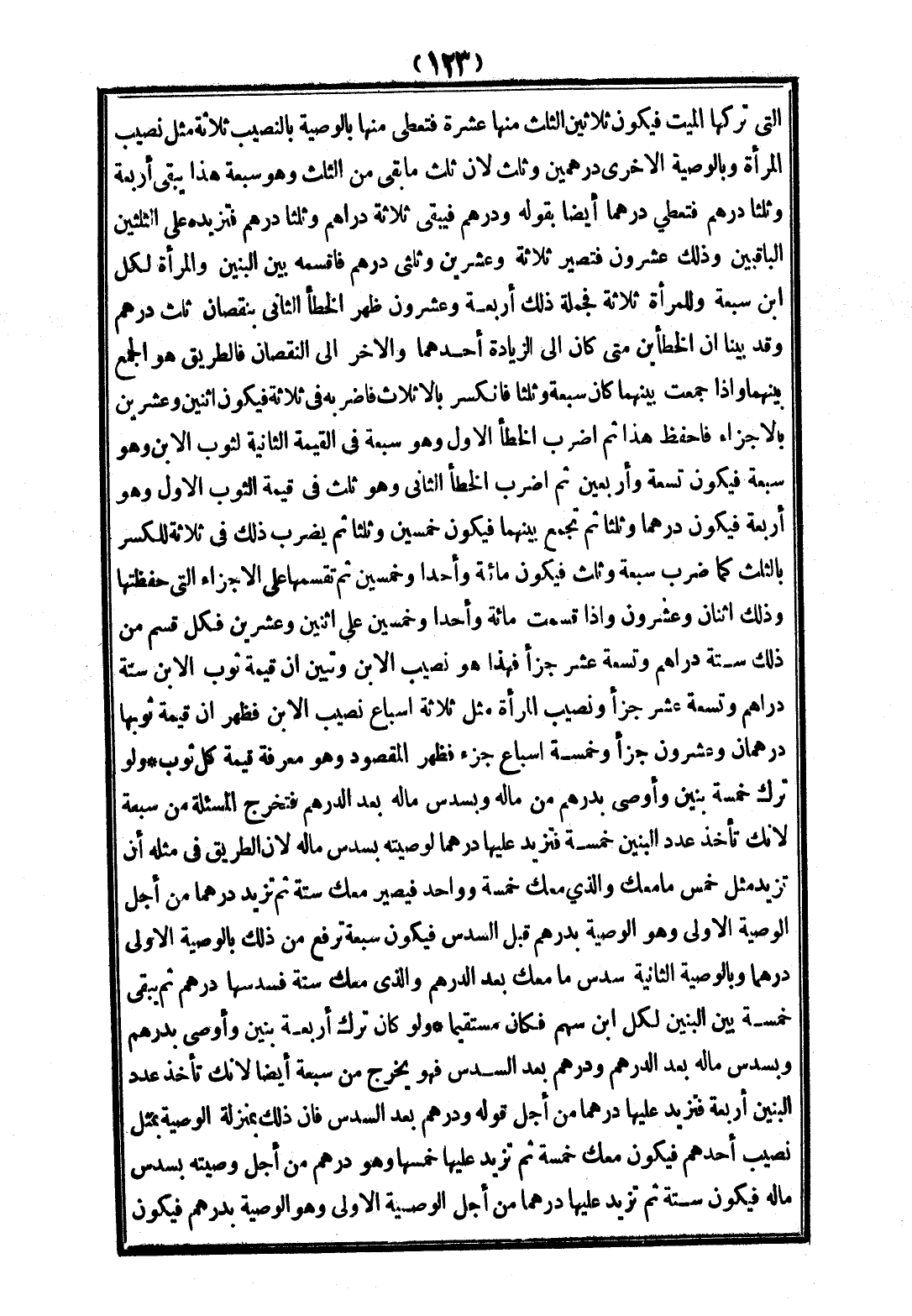 الَّتِي تَرَكَهَا الْمَيِّتُ فَيَكُونُ ثَلَاثِينَ الثُّلُثُ مِنْهَا عَشَرَةٌ فَتُعْطَى مِنْهَا بِالْوَصِيَّةِ بِالنَّصِيبِ ثَلَاثَةً مِثْلَ نَصِيبِ الْمَرْأَةِ وَبِالْوَصِيَّةِ الْأُخْرَى دِرْهَمَيْنِ وَثُلُثًا؛ لِأَنَّ ثُلُثَ مَا بَقِيَ مِنْ الثُّلُثِ وَهُوَ سَبْعَةٌ هَذَا، يَبْقَى أَرْبَعَةٌ وَثُلُثَا دِرْهَمٍ فَتُعْطَى دِرْهَمًا أَيْضًا بِقَوْلِهِ " وَدِرْهَمٍ " فَيَبْقَى ثَلَاثَةُ دَرَاهِمَ وَثُلُثَا دِرْهَمٍ فَتَزِيدُهُ عَلَى الثُّلُثَيْنِ الْبَاقِيَيْنِ وَذَلِكَ عِشْرُونَ فَتَصِيرُ ثَلَاثَةً وَعِشْرِينَ وَثُلُثَيْ دِرْهَمٍ فَاقْسِمْهُ بَيْنَ الْبَنِينَ وَالْمَرْأَةِ لِكُلِّ ابْنٍ سَبْعَةٌ وَلِلْمَرْأَةِ ثَلَاثَةٌ فَجُمْلَةُ ذَلِكَ أَرْبَعَةٌ وَعِشْرُونَ ظَهَرَ الْخَطَأُ الثَّانِي بِنُقْصَانِ ثُلُثِ دِرْهَمٍ وَقَدْ بَيَّنَّا أَنَّ الْخَطَأَيْنِ مَتَى كَانَ إلَى الزِّيَادَةِ أَحَدُهُمَا وَالْآخَرُ إلَى النُّقْصَانِ فَالطَّرِيقُ هُوَ الْجَمْعُ بَيْنَهُمَا وَإِذَا جَمَعْتَ بَيْنَهُمَا كَانَ سَبْعَةً وَثُلُثًا فَانْكَسَرَ بِالْأَثْلَاثِ فَاضْرِبْهُ فِي ثَلَاثَةٍ فَيَكُونَ اثْنَيْنِ وَعِشْرِينَ بِالْأَجْزَاءِ فَاحْفَظْ هَذَا ثُمَّ اضْرِبْ الْخَطَأَ الْأَوَّلَ وَهُوَ سَبْعَةٌ فِي الْقِيمَةِ الثَّانِيَةِ لِثَوْبِ الِابْنِ وَهُوَ سَبْعَةٌ فَيَكُونَ تِسْعَةً وَأَرْبَعِينَ ثُمَّ اضْرِبْ الْخَطَأَ الثَّانِيَ وَهُوَ ثُلُثٌ فِي قِيمَةِ الثَّوْبِ الْأَوَّلِ وَهُوَ أَرْبَعَةٌ فَيَكُونَ دِرْهَمًا وَثُلُثًا ثُمَّ تَجْمَعُ بَيْنَهُمَا فَيَكُونُ خَمْسِينَ وَثُلُثًا ثُمَّ يُضْرَبُ ذَلِكَ فِي ثَلَاثَةٍ لِلْكَسْرِ بِالثُّلُثِ كَمَا ضُرِبَ سَبْعَةٌ وَثُلُثٌ فَيَكُونُ مِائَةً وَأَحَدًا وَخَمْسِينَ ثُمَّ تُقَسِّمُهَا عَلَى الْأَجْزَاءِ الَّتِي حَفِظْتَهَا وَذَلِكَ اثْنَانِ وَعِشْرُونَ وَإِذَا قَسَّمْتَ مِائَةً وَأَحَدًا وَخَمْسِينَ عَلَى اثْنَيْنِ وَعِشْرِينَ فَكُلُّ قِسْمٍ مِنْ ذَلِكَ سِتَّةُ دَرَاهِمَ وَتِسْعَةَ عَشَرَ جُزْءًا فَهَذَا هُوَ نَصِيبُ الِابْنِ.