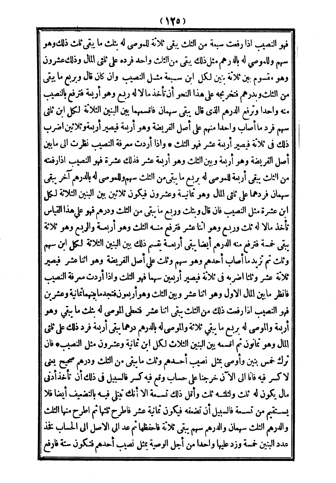 وَإِذَا أَرَدْتَ مَعْرِفَةَ النَّصِيبِ نَظَرْتَ إلَى مَا بَيْنَ أَصْلِ الْفَرِيضَةِ وَهُوَ أَرْبَعَةٌ وَبَيْنَ الثُّلُثِ وَهُوَ أَرْبَعَةَ عَشَرَ فَذَلِكَ عَشَرَةٌ فَهُوَ النَّصِيبُ إذَا رَفَعْتَهُ مِنْ الثُّلُثِ يَبْقَى أَرْبَعَةٌ لِلْمُوصَى لَهُ بِرُبُعِ مَا يَبْقَى مِنْ الثُّلُثِ سَهْمٌ وَلِلْمُوصَى لَهُ بِالدِّرْهَمِ آخَرُ يَبْقَى سَهْمَانِ فَرُدَّهُمَا عَلَى ثُلُثَيْ الْمَالِ وَهُوَ ثَمَانِيَةٌ وَعِشْرُونَ فَيَكُونَ ثَلَاثِينَ بَيْنَ الْبَنِينَ الثَّلَاثَةِ لِكُلِّ ابْنٍ عَشَرَةٌ مِثْلَ النَّصِيبِ فَإِنْ قَالَ وَبِثُلُثِ وَرُبُعِ مَا يَبْقَى مِنْ الثُّلُثِ وَدِرْهَمٍ فَهُوَ عَلَى هَذَا الْقِيَاسِ تَأْخُذُ مَالًا لَهُ ثُلُثٌ وَرُبُعٌ وَهُوَ اثْنَا عَشَرَ فَتَرْفَعُ مِنْهُ الثُّلُثَ وَهُوَ أَرْبَعَةٌ وَالرُّبُعَ وَهُوَ ثَلَاثَةٌ يَبْقَى خَمْسَةٌ فَتَرْفَعُ مِنْهُ الدِّرْهَمَ أَيْضًا يَبْقَى أَرْبَعَةٌ يُقَسَّمُ ذَلِكَ بَيْنَ الْبَنِينَ الثَّلَاثَةِ لِكُلِّ ابْنٍ سَهْمٌ وَثُلُثٌ ثُمَّ تَزِيدُ مَا أَصَابَ أَحَدُهُمْ وَهُوَ سَهْمٌ وَثُلُثٌ عَلَى أَصْلِ الْفَرِيضَةِ وَهُوَ اثْنَا عَشَرَ فَيَصِيرُ ثَلَاثَةَ عَشَرَ وَثُلُثًا، اضْرِبْهُ فِي ثَلَاثَةٍ فَيَصِيرُ أَرْبَعِينَ سَهْمًا فَهُوَ الثُّلُثُ وَإِذَا أَرَدْتَ مَعْرِفَةَ النَّصِيبِ فَانْظُرْ مَا بَيْنَ الْمَالِ الْأَوَّلِ وَهُوَ اثْنَا عَشَرَ وَبَيْنَ الثُّلُثِ وَهُوَ أَرْبَعُونَ فَتَجِدُ مَا بَيْنَهُمَا ثَمَانِيَةً وَعِشْرِينَ فَهُوَ النَّصِيبُ إذَا رَفَعْتَ ذَلِكَ مِنْ الثُّلُثِ يَبْقَى اثْنَا عَشَرَ فَتُعْطِي الْمُوصَى لَهُ بِثُلُثِ مَا يَبْقَى وَهُوَ أَرْبَعَةٌ وَالْمُوصَى لَهُ بِرُبُعِ مَا يَبْقَى ثَلَاثَةٌ وَالْمُوصَى لَهُ بِالدِّرْهَمِ دِرْهَمًا يَبْقَى أَرْبَعَةٌ فَرُدَّ ذَلِكَ عَلَى ثُلُثَيْ الْمَالِ وَهُوَ ثَمَانُونَ ثُمَّ اقْسِمْهُ بَيْنَ الْبَنِينَ الثَّلَاثِ لِكُلِّ ابْنٍ ثَمَانِيَةٌ وَعِشْرُونَ مِثْلَ النَّصِيبِ.