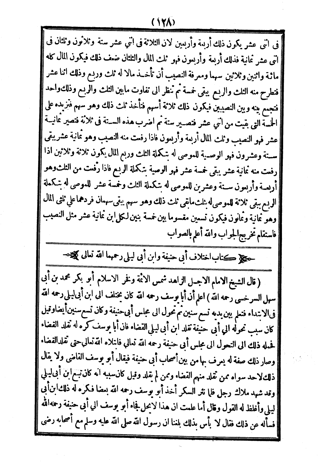 (رَحِمَهُمَا اللَّهُ تَعَالَى) (قَالَ الشَّيْخُ الْإِمَامُ الْأَجَلُّ الزَّاهِدُ شَمْسُ الْأَئِمَّةِ وَفَخْرُ الْإِسْلَامِ أَبُو بَكْرٍ مُحَمَّدُ بْنُ أَبِي سَهْلٍ السَّرَخْسِيُّ - رَحِمَهُ اللَّهُ -) اعْلَمْ أَنَّ أَبَا يُوسُفَ - رَحِمَهُ اللَّهُ - كَانَ يَخْتَلِفُ إلَى ابْنِ أَبِي لَيْلَى - رَحِمَهُ اللَّهُ - فِي الِابْتِدَاءِ فَتَعَلَّمَ بَيْنَ يَدَيْهِ تِسْعَ سِنِينَ ثُمَّ تَحَوَّلَ إلَى مَجْلِسِ أَبِي حَنِيفَةَ وَكَانَ تِسْعَ سِنِينَ أَيْضًا، وَقِيلَ كَانَ سَبَبُ تَحَوُّلِهِ إلَى أَبِي حَنِيفَةَ تَقَلُّدَ ابْنُ أَبِي لَيْلَى الْقَضَاءَ فَإِنَّ أَبَا يُوسُفَ كَرِهَ لَهُ تَقَلُّدَ الْقَضَاءِ فَحَمَلَهُ ذَلِكَ إلَى التَّحَوُّلِ إلَى مَجْلِسِ أَبِي حَنِيفَةَ - رَحِمَهُ اللَّهُ تَعَالَى - فَابْتَلَاهُ اللَّهُ تَعَالَى حَتَّى تَقَلَّدَ الْقَضَاءَ وَصَارَ ذَلِكَ صِفَةً لَهُ يُعْرَفُ بِهَا مِنْ بَيْنِ أَصْحَابِ أَبِي حَنِيفَةَ فَيُقَال أَبُو يُوسُفَ الْقَاضِي وَلَا يُقَالُ ذَلِكَ لِأَحَدٍ سِوَاهُ مِمَّنْ تَقَلَّدَ مِنْهُمْ الْقَضَاءَ وَمِمَّنْ لَمْ يُقَلَّدْ وَقِيلَ كَانَ سَبَبُهُ أَنَّهُ كَانَ تَبِعَ ابْنَ أَبِي لَيْلَى وَقَدْ شَهِدَ مِلَاكَ رَجُلٍ فَلَمَّا نَثَرَ السُّكَّرَ أَخَذَ أَبُو يُوسُفَ - رَحِمَهُ اللَّهُ - بَعْضًا فَكَرِهَ لَهُ ذَلِكَ ابْنُ أَبِي لَيْلَى وَأَغْلَظَ لَهُ الْقَوْلَ وَقَالَ أَمَا عَلِمْتَ أَنَّ هَذَا لَا يَحِلُّ فَجَاءَ أَبُو يُوسُفَ إلَى أَبِي حَنِيفَةَ - رَحِمَهُ اللَّهُ - فَسَأَلَهُ عَنْ ذَلِكَ فَقَالَ لَا بَأْسَ بِذَلِكَ بَلَغَنَا «أَنَّ رَسُولَ اللَّهِ - صَلَّى اللَّهُ عَلَيْهِ وَسَلَّمَ - مَعَ أَصْحَابِهِ - رَضِيَ اللَّهُ عَنْهُمْ -