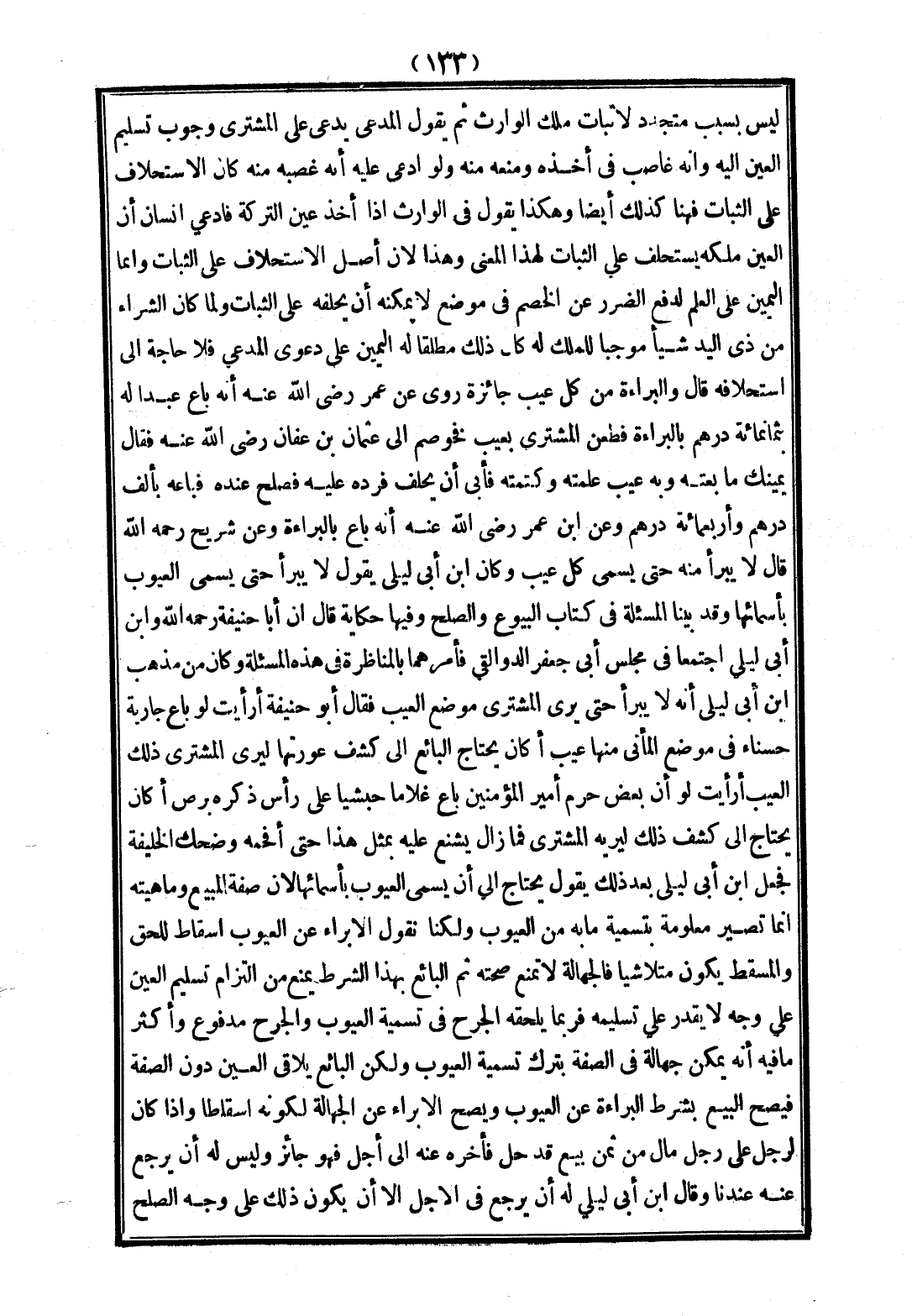 أَرَأَيْتَ لَوْ أَنَّ بَعْضَ حَرَمِ أَمِيرِ الْمُؤْمِنِينَ بَاعَ غُلَامًا حَبَشِيًّا عَلَى رَأْسِ ذَكَرِهِ بَرَصٌ أَكَانَ يَحْتَاجُ إلَى كَشْفِ ذَلِكَ لِيُرِيَهُ الْمُشْتَرِيَ فَمَا زَالَ يُشَنِّعُ عَلَيْهِ بِمِثْلِ هَذَا حَتَّى أَفْحَمَهُ وَضَحِكَ الْخَلِيفَةُ فَجَعَلَ ابْنُ أَبِي لَيْلَى بَعْدَ ذَلِكَ يَقُولُ: يَحْتَاجُ إلَى أَنْ يُسَمِّيَ الْعُيُوبَ بِأَسْمَائِهَا لِأَنَّ صِفَةَ الْمَبِيعِ وَمَاهِيَّتَهُ إنَّمَا تَصِيرُ مَعْلُومَةً بِتَسْمِيَةِ مَا بِهِ مِنْ الْعُيُوبِ، وَلَكِنَّا نَقُولُ الْإِبْرَاءُ عَنْ الْعُيُوبِ إسْقَاطٌ لِلْحَقِّ وَالْمُسْقِطُ يَكُونُ مُتَلَاشِيًا فَالْجَهَالَةُ لَا تَمْنَعُ صِحَّتَهُ، ثُمَّ الْبَائِعُ بِهَذَا الشَّرْطِ يُمْنَعُ مِنْ الْتِزَامِ تَسْلِيمِ الْعَيْنِ عَلَى وَجْهٍ لَا يَقْدِرُ عَلَى تَسْلِيمِهِ فَرُبَّمَا يَلْحَقُهُ الْجَرْحُ فِي تَسْمِيَةِ الْعُيُوبِ وَالْجَرْحُ مَدْفُوعٌ وَأَكْثَرُ مَا فِيهِ أَنَّهُ يُمْكِنُ جَهَالَةً فِي الصِّفَةِ بِتَرْكِ تَسْمِيَةِ الْعُيُوبِ وَلَكِنَّ الْبَائِعَ يُلَاقِي الْعَيْنَ دُونَ الصِّفَةِ فَيَصِحُّ الْبَيْعُ بِشَرْطِ الْبَرَاءَةِ عَنْ الْعُيُوبِ وَيَصِحُّ الْإِبْرَاءُ عَنْ الْجَهَالَةِ لِكَوْنِهِ إسْقَاطًا.