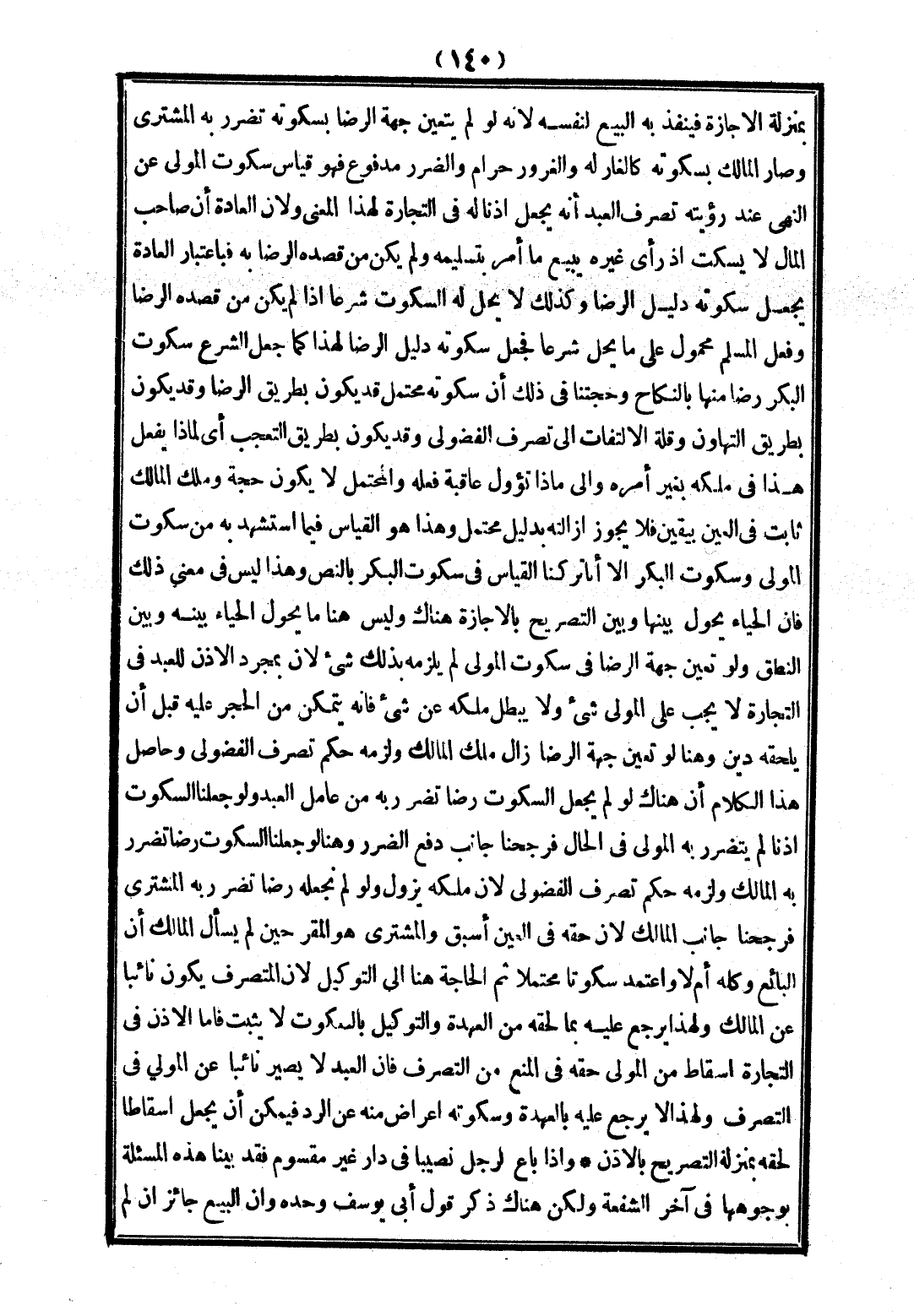 فَأَمَّا الْإِذْنُ فِي التِّجَارَةِ إسْقَاطٌ مِنْ الْمَوْلَى حَقَّهُ فِي الْمَنْعِ مِنْ التَّصَرُّفِ فَإِنَّ الْعَبْدَ لَا يَصِيرُ نَائِبًا عَنْ الْمَوْلَى فِي التَّصَرُّفِ وَلِهَذَا لَا يَرْجِعُ عَلَيْهِ بِالْعُهْدَةِ وَسُكُوتُهُ إعْرَاضٌ مِنْهُ عَنْ الرَّدِّ فَيُمْكِنُ أَنْ يُجْعَلَ إسْقَاطًا لِحَقِّهِ بِمَنْزِلَةِ التَّصْرِيحِ بِالْإِذْنِ.