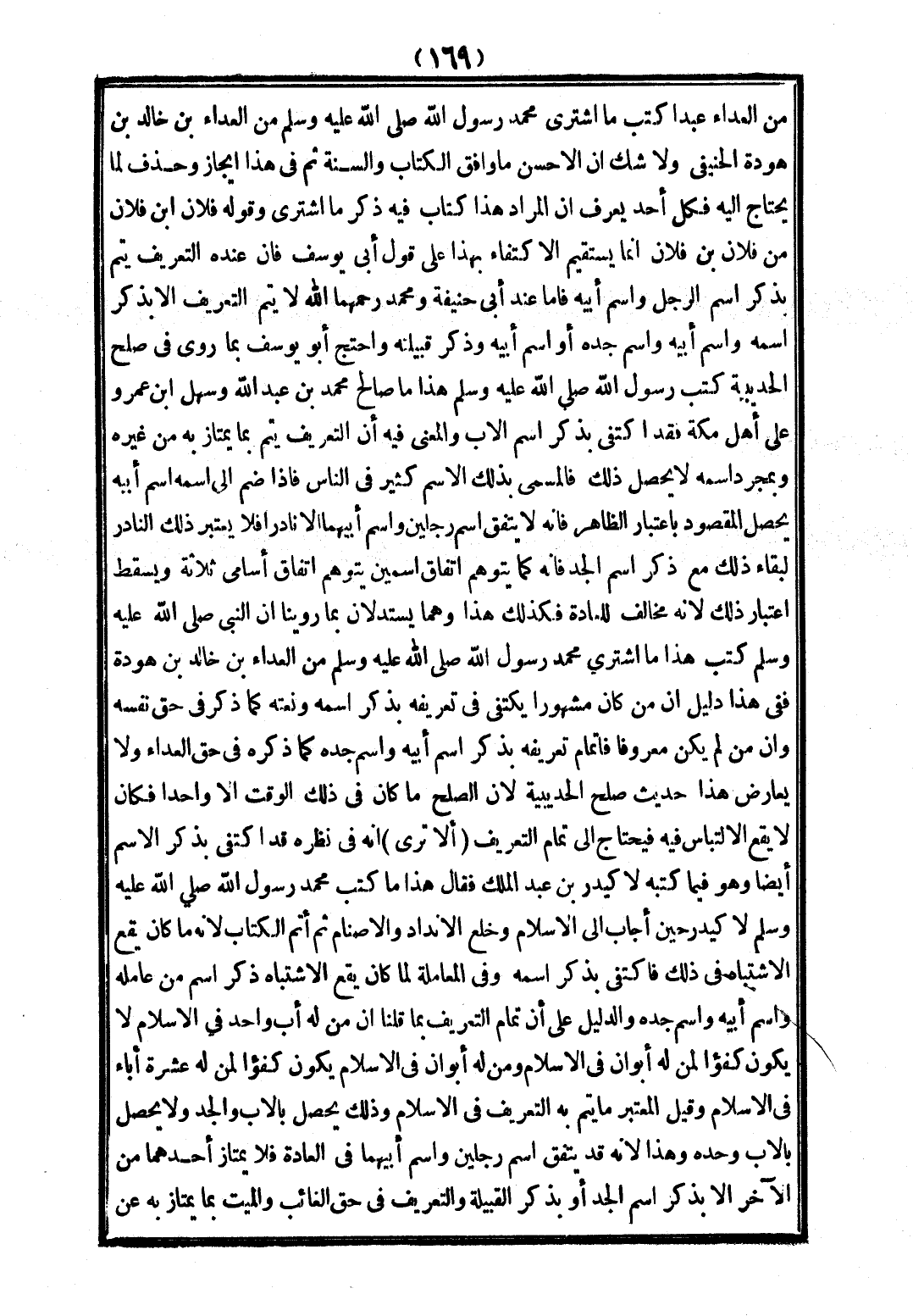 (أَلَا تَرَى) أَنَّهُ فِي نَظَرِهِ قَدْ اكْتَفَى بِذِكْرِ الِاسْمِ أَيْضًا، وَهُوَ «فِيمَا كَتَبَهُ لِأُكَيْدِرَ بْنِ عَبْدِ الْمَلِكِ فَقَالَ: هَذَا مَا كَتَبَ مُحَمَّدٌ رَسُولُ اللَّهِ - صَلَّى اللَّهُ عَلَيْهِ وَسَلَّمَ - لِأُكَيْدِرَ حِينَ أَجَابَ إلَى الْإِسْلَامِ، وَخَلَعَ الْأَنْدَادَ وَالْأَصْنَامَ ثُمَّ أَتَمَّ الْكِتَابَ»؛ لِأَنَّهُ مَا كَانَ يَقَعُ الِاشْتِبَاهُ فِي ذَلِكَ فَاكْتَفَى بِذِكْرِ اسْمِهِ، وَفِي الْمُعَامَلَةِ لَمَّا كَانَ يَقَعُ الِاشْتِبَاهُ ذَكَرَ اسْمَ مَنْ عَامَلَهُ وَاسْمَ أَبِيهِ وَاسْمَ جَدِّهِ.