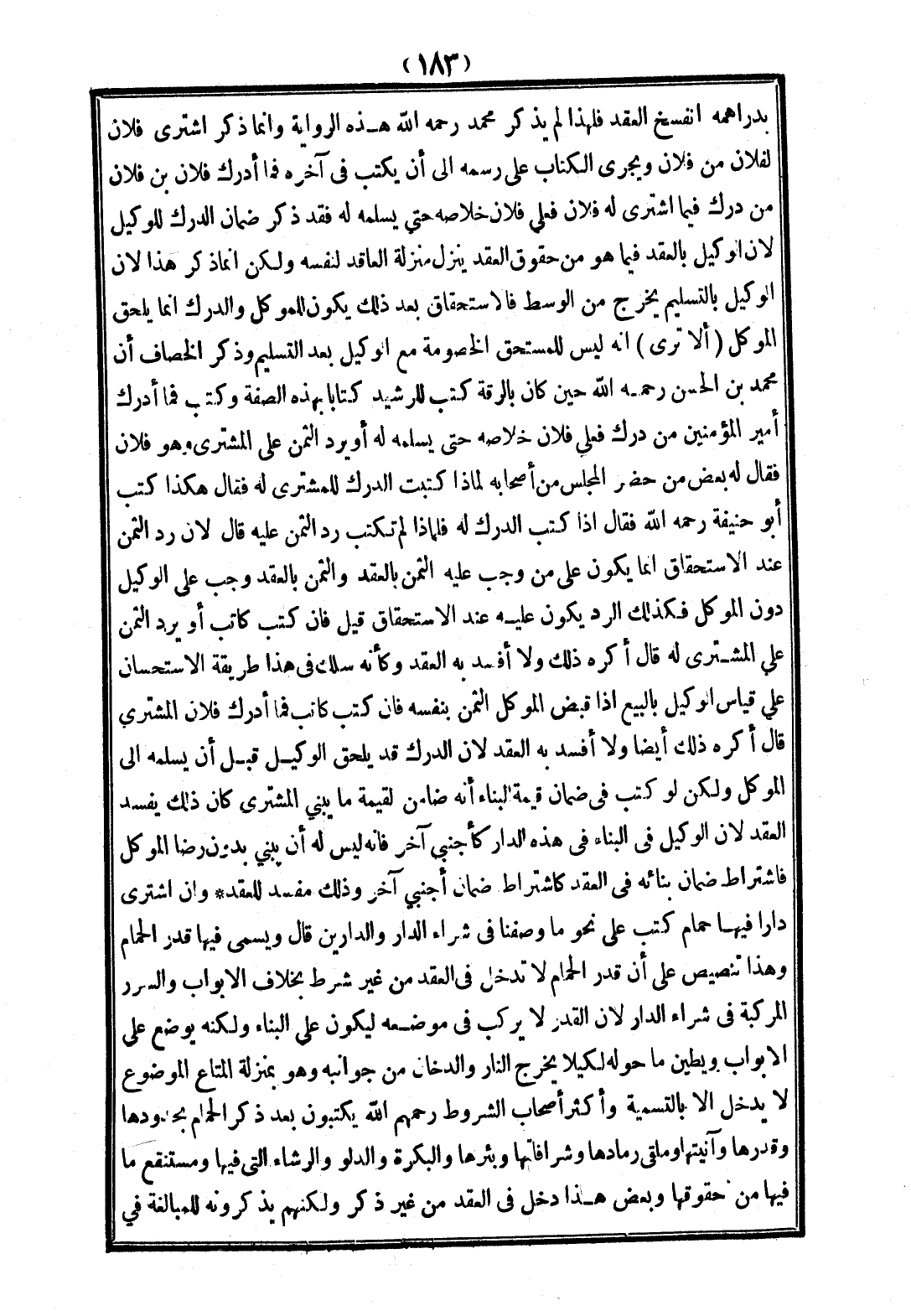 (أَلَا تَرَى) أَنَّهُ لَيْسَ لِلْمُسْتَحِقِّ الْخُصُومَةُ مَعَ الْوَكِيلِ بَعْدَ التَّسْلِيمِ وَذَكَرَ الْخَصَّافُ أَنَّ مُحَمَّدَ بْنَ الْحَسَنِ - رَحِمَهُ اللَّهُ - حِينَ كَانَ بِالرَّقَّةِ كَتَبَ لِلرَّشِيدِ كِتَابًا بِهَذِهِ الصِّفَةِ وَكَتَبَ فَمَا أَدْرَكَ أَمِيرُ الْمُؤْمِنِينَ مِنْ دَرَكٍ فَعَلَى فُلَانٍ خَلَاصُهُ حَتَّى يُسَلِّمَهُ لَهُ أَوْ يَرُدَّ الثَّمَنَ عَلَى الْمُشْتَرِي، وَهُوَ فُلَانٌ فَقَالَ لَهُ بَعْضُ مَنْ حَضَرَ الْمَجْلِسَ مِنْ أَصْحَابِهِ لِمَاذَا كَتَبْت الدَّرَكَ لِلْمُشْتَرَى لَهُ فَقَالَ هَكَذَا كَتَبَ أَبُو حَنِيفَةَ - رَحِمَهُ اللَّهُ - فَقَالَ إذَا كَتَبَ الدَّرَكَ لَهُ فَلِمَاذَا لَمْ تَكْتُبْ رَدَّ الثَّمَنِ عَلَيْهِ قَالَ لِأَنَّ رَدَّ الثَّمَنِ عِنْدَ الِاسْتِحْقَاقِ إنَّمَا يَكُونُ عَلَى مَنْ وَجَبَ عَلَيْهِ الثَّمَنُ بِالْعَقْدِ وَالثَّمَنُ بِالْعَقْدِ وَجَبَ عَلَى الْوَكِيلِ دُونَ الْمُوَكِّلِ فَكَذَلِكَ الرَّدُّ يَكُونُ عَلَيْهِ عِنْدَ الِاسْتِحْقَاقِ قِيلَ فَإِنْ كَتَبَ كَاتِبٌ أَوْ يَرُدَّ الثَّمَنَ عَلَى الْمُشْتَرَى لَهُ قَالَ أَكْرَهُ ذَلِكَ وَلَا أُفْسِدُ بِهِ الْعَقْدَ وَكَأَنَّهُ سَلَكَ فِي هَذَا طَرِيقَةَ الِاسْتِحْسَانِ عَلَى قِيَاسِ الْوَكِيلِ بِالْبَيْعِ إذَا قَبَضَ الْمُوَكِّلُ الثَّمَنَ بِنَفْسِهِ، فَإِنْ كَتَبَ كَاتِبٌ فَمَا أَدْرَكَ فُلَانٌ الْمُشْتَرِي قَالَ أَكْرَهُ ذَلِكَ أَيْضًا وَلَا أُفْسِدُ بِهِ الْعَقْدَ؛ لِأَنَّ الدَّرَكَ قَدْ يَلْحَقُ الْوَكِيلَ قَبْلَ أَنْ يُسَلِّمَهُ إلَى الْمُوَكِّلِ وَلَكِنْ لَوْ كَتَبَ فِي ضَمَانِ قِيمَةِ الْبِنَاءِ أَنَّهُ ضَامِنٌ لِقِيمَةِ مَا يَبْنِي الْمُشْتَرِي كَانَ ذَلِكَ يُفْسِدُ الْعَقْدَ؛ لِأَنَّ الْوَكِيلَ فِي الْبِنَاءِ فِي هَذِهِ الدَّارِ كَأَجْنَبِيٍّ آخَرَ فَإِنَّهُ لَيْسَ لَهُ أَنْ يَبْنِيَ بِدُونِ رِضَا الْمُوَكِّلِ فَاشْتِرَاطُ ضَمَانِ بِنَائِهِ فِي الْعَقْدِ كَاشْتِرَاطِ ضَمَانِ أَجْنَبِيٍّ آخَرَ وَذَلِكَ مُفْسِدٌ لِلْعَقْدِ.