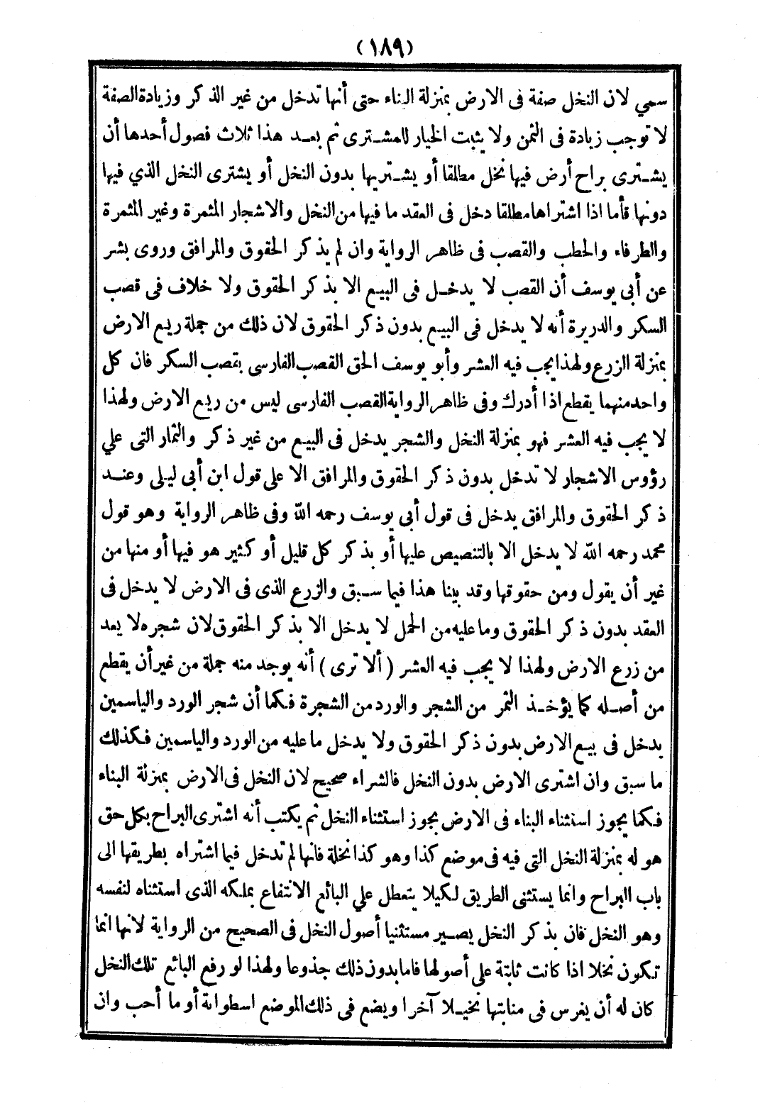 ثُمَّ بَعْدَ هَذَا ثَلَاثُ فُصُولٍ أَحَدُهَا أَنْ يَشْتَرِيَ بَرَاحَ أَرْضٍ فِيهَا نَخْلٌ مُطْلَقًا أَوْ يَشْتَرِيَهَا بِدُونِ النَّخْلِ أَوْ يَشْتَرِيَ النَّخْلَ الَّذِي فِيهَا دُونَهَا فَأَمَّا إذَا اشْتَرَاهَا مُطْلَقًا دَخَلَ فِي الْعَقْدِ مَا فِيهَا مِنْ النَّخْلِ وَالْأَشْجَارِ الْمُثْمِرَةِ وَغَيْرِ الْمُثْمِرَةِ وَالطَّرْفَاءِ وَالْحَطَبِ وَالْقَصَبِ فِي ظَاهِرِ الرِّوَايَةِ، وَإِنْ لَمْ يَذْكُرْ الْحُقُوقَ وَالْمَرَافِقَ وَرَوَى بِشْرٌ عَنْ أَبِي يُوسُفَ أَنَّ الْقَصَبَ لَا يَدْخُلُ فِي الْبَيْعِ إلَّا بِذِكْرِ الْحُقُوقِ وَلَا خِلَافَ فِي قَصَبِ السُّكَّرِ وَالدَّرِيرَةِ أَنَّهُ لَا يَدْخُلُ فِي الْبَيْعِ بِدُونِ ذِكْرِ الْحُقُوقِ؛ لِأَنَّ ذَلِكَ مِنْ جُمْلَةِ رِيعِ الْأَرْضِ بِمَنْزِلَةِ الزَّرْعِ وَلِهَذَا يَجِبُ فِيهِ الْعُشْرُ وَأَبُو يُوسُفَ أَلْحَقَ الْقَصَبَ الْفَارِسِيَّ بِقَصَبِ السُّكَّرِ فَإِنَّ كُلَّ وَاحِدٍ مِنْهُمَا يُقْطَعُ إذَا أَدْرَكَ، وَفِي ظَاهِرِ الرِّوَايَةِ الْقَصَبُ الْفَارِسِيُّ لَيْسَ مِنْ رِيعِ الْأَرْضِ وَلِهَذَا لَا يَجِبُ فِيهِ الْعُشْرُ فَهُوَ بِمَنْزِلَةِ النَّخْلِ وَالشَّجَرِ يَدْخُلُ فِي الْبَيْعِ مِنْ غَيْرِ ذِكْرٍ، وَالثِّمَارُ الَّتِي عَلَى رُءُوسِ الْأَشْجَارِ لَا تَدْخُلُ بِدُونِ ذِكْرِ الْحُقُوقِ وَالْمَرَافِقِ إلَّا عَلَى قَوْلِ ابْنِ أَبِي لَيْلَى وَعِنْدَ ذِكْرِ الْحُقُوقِ وَالْمَرَافِقِ يَدْخُلُ فِي قَوْلِ أَبِي يُوسُفَ - رَحِمَهُ اللَّهُ -، وَفِي ظَاهِرِ الرِّوَايَةِ، وَهُوَ قَوْلُ مُحَمَّدٍ - رَحِمَهُ اللَّهُ - لَا يَدْخُلُ إلَّا بِالتَّنْصِيصِ عَلَيْهَا أَوْ بِذِكْرِ كُلِّ قَلِيلٍ أَوْ كَثِيرٍ هُوَ فِيهَا أَوْ مِنْهَا مِنْ غَيْرِ أَنْ يَقُولَ وَمِنْ حُقُوقِهَا، وَقَدْ بَيَّنَّا هَذَا فِيمَا سَبَقَ.