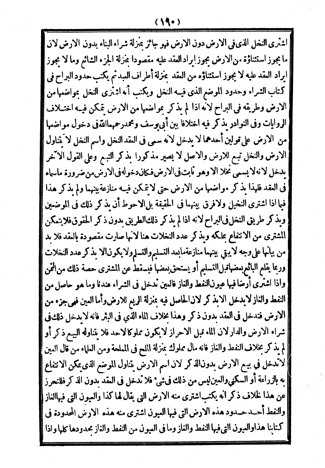 وَإِذَا اشْتَرَى أَرْضًا فِيهَا عُيُونُ النَّفْطِ وَالْغَازِ فَالْعَيْنُ تَدْخُلُ فِي الشِّرَاءِ عِنْدَنَا، وَمَا هُوَ حَاصِلٌ مِنْ النَّفْطِ وَالْغَازِ لَا يَدْخُلُ إلَّا بِذِكْرٍ؛ لِأَنَّ الْحَاصِلَ فِيهِ بِمَنْزِلَةِ الرِّيعِ لِلْأَرْضِ وَأَمَّا الْعَيْنُ فَهِيَ جُزْءٌ مِنْ الْأَرْضِ فَتَدْخُلُ فِي الْعَقْدِ بِدُونِ ذِكْرٍ، وَهَذَا بِخِلَافِ الْمَاءِ الَّذِي فِي الْبِئْرِ فَإِنَّهُ لَا يَدْخُلُ ذَلِكَ فِي شِرَاءِ الْأَرْضِ وَالدَّارِ؛ لِأَنَّ الْمَاءَ قَبْلَ الْإِحْرَازِ لَا يَكُونُ مَمْلُوكًا لِأَحَدٍ فَلَا يَتَنَاوَلُهُ الْبَيْعُ ذُكِرَ أَوْ لَمْ يُذْكَرْ بِخِلَافِ النَّفْطِ وَالْغَازِ فَإِنَّهُ مَالٌ مَمْلُوكٌ بِمَنْزِلَةِ الْمِلْحِ فِي الْمَمْلَحَةِ، وَمِنْ الْعُلَمَاءِ مَنْ قَالَ الْعَيْنُ لَا تَدْخُلُ فِي بَيْعِ الْأَرْضِ بِدُونِ الذِّكْرِ؛ لِأَنَّ اسْمَ الْأَرْضِ يَتَنَاوَلُ الْمَوْضِعَ الَّذِي يُمْكِنُ الِانْتِفَاعُ بِهِ بِالزِّرَاعَةِ أَوْ السُّكْنَى وَالْعَيْنُ لَيْسَ مِنْ ذَلِكَ فِي شَيْءٍ فَلَا تَدْخُلُ فِي الْعَقْدِ بِدُونِ الذِّكْرِ فَلِلتَّحَرُّزِ عَنْ هَذَا الْخِلَافِ ذَكَرَ أَنَّهُ يَكْتُبُ اشْتَرَى مِنْهُ الْأَرْضَ الَّتِي يُقَالُ لَهَا كَذَا وَالْعُيُونَ الَّتِي فِيهَا الْغَازُ وَالنَّفْطُ، أَحَدُ حُدُودِ هَذِهِ الْأَرْضِ الَّتِي فِيهَا الْعُيُونُ اشْتَرَى مِنْهُ هَذِهِ الْأَرْضَ الْمَحْدُودَةَ فِي كِتَابِنَا هَذَا وَالْعُيُونَ الَّتِي فِيهَا النَّفْطُ وَالْغَازُ، وَمَا فِي الْعُيُونِ مِنْ النَّفْطِ وَالْغَازِ بِحُدُودِهَا كُلِّهَا.