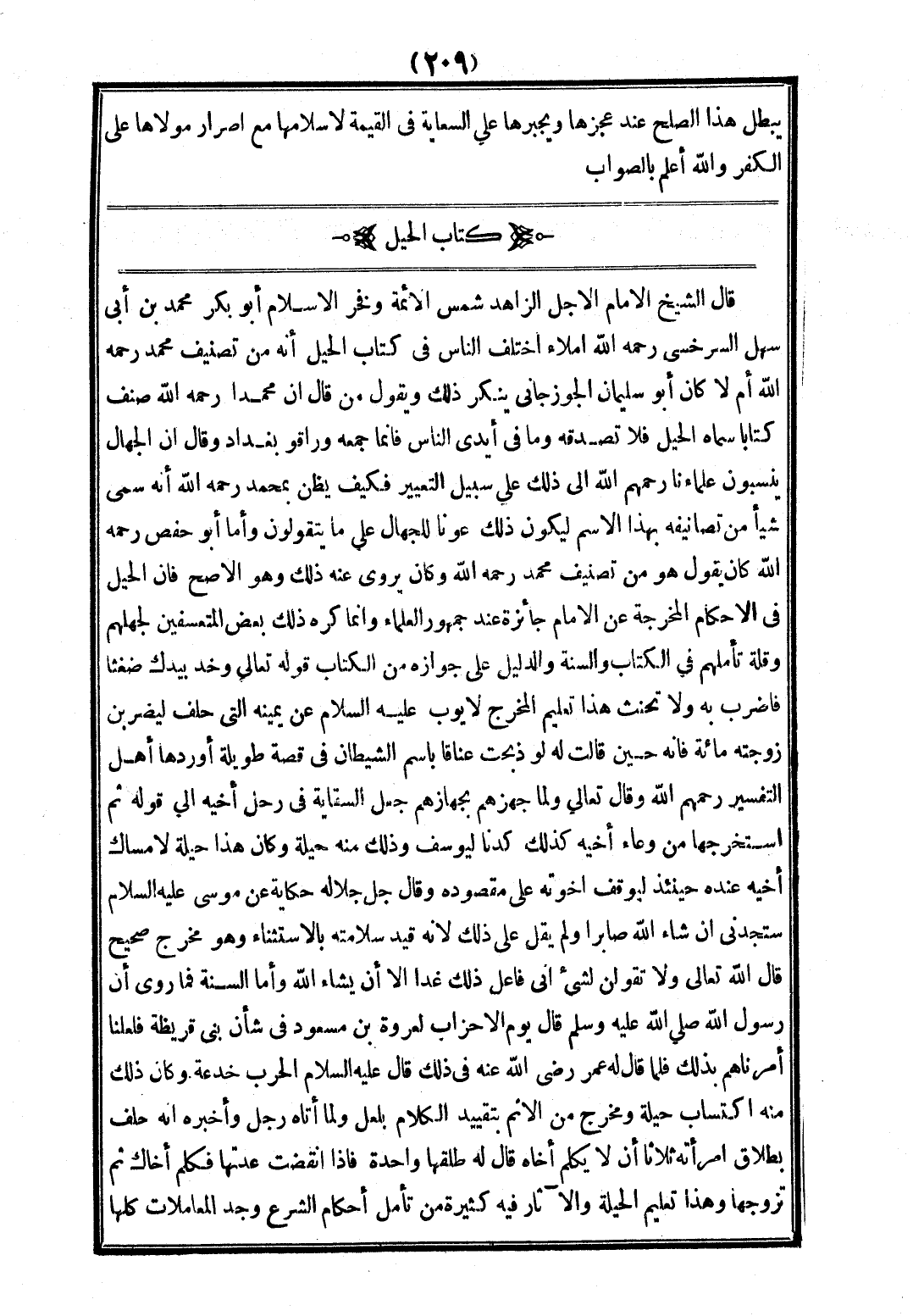 قَالَ الشَّيْخُ الْإِمَامُ الْأَجَلُّ الزَّاهِدُ شَمْسُ الْأَئِمَّةِ وَفَخْرُ الْإِسْلَامِ أَبُو بَكْرٍ مُحَمَّدُ بْنُ أَبِي سَهْلٍ السَّرَخْسِيُّ - رَحِمَهُ اللَّهُ - إمْلَاءً اخْتَلَفَ النَّاسُ فِي كِتَابِ الْحِيَلِ أَنَّهُ مِنْ تَصْنِيفِ مُحَمَّدٍ - رَحِمَهُ اللَّهُ - أَمْ لَا كَانَ أَبُو سُلَيْمَانَ الْجُوزَجَانِيُّ يُنْكِرُ ذَلِكَ، وَيَقُولُ: مَنْ قَالَ: إنَّ مُحَمَّدًا - رَحِمَهُ اللَّهُ - صَنَّفَ كِتَابًا سَمَّاهُ الْحِيَلَ فَلَا تُصَدِّقْهُ، وَمَا فِي أَيْدِي النَّاسِ، فَإِنَّمَا جَمَعَهُ وَرَّاقُو بَغْدَادَ.